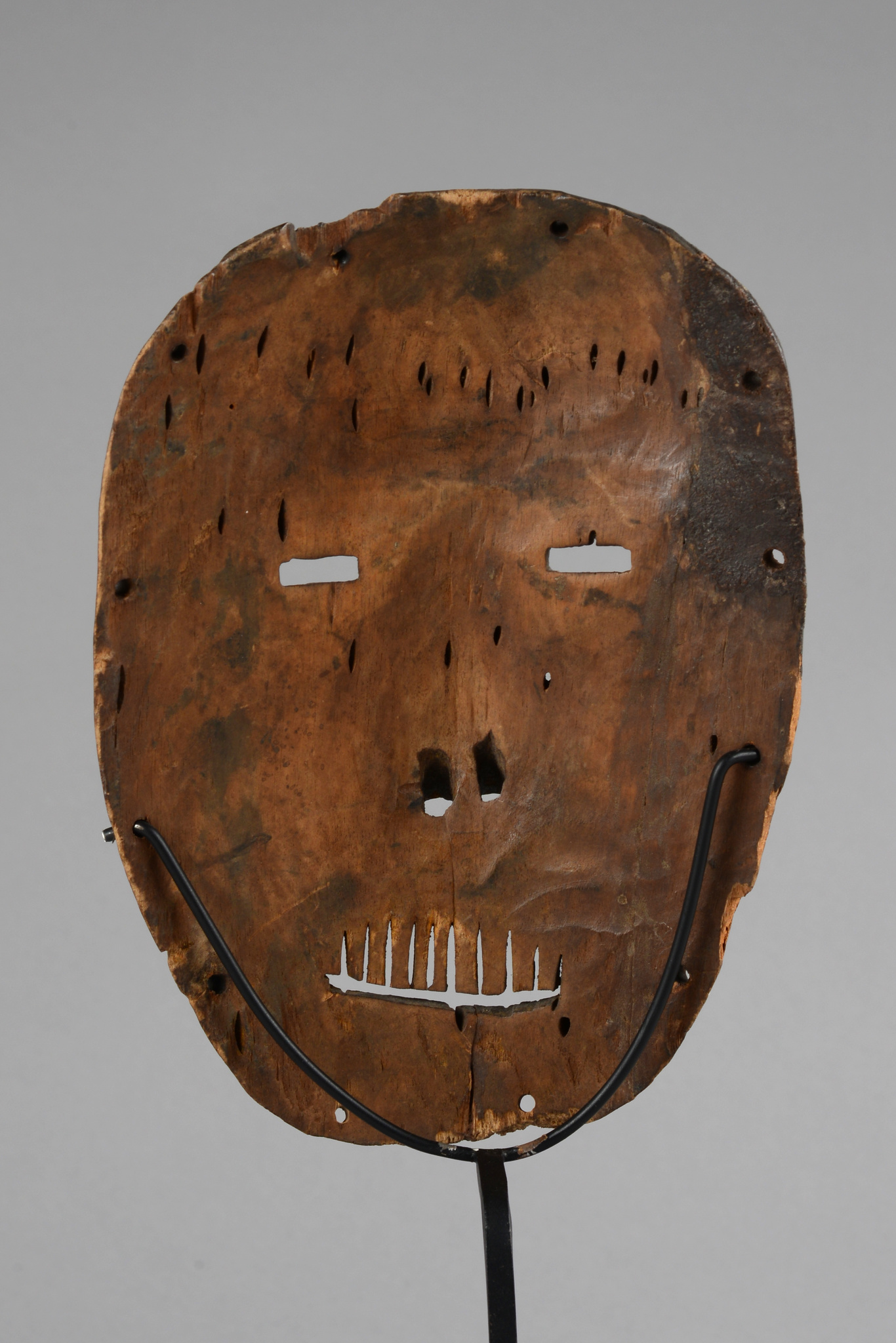 Holz, schwarze Patina, Kaolin, mit Kringeln und Linien bemalt, kleinere Fehlstellen (Rand), Spuren von Insektenfrass, rep. (rechter Maskenrand/Bruchstelle am Kinn mit Masse ausgestrichen), Sockel;