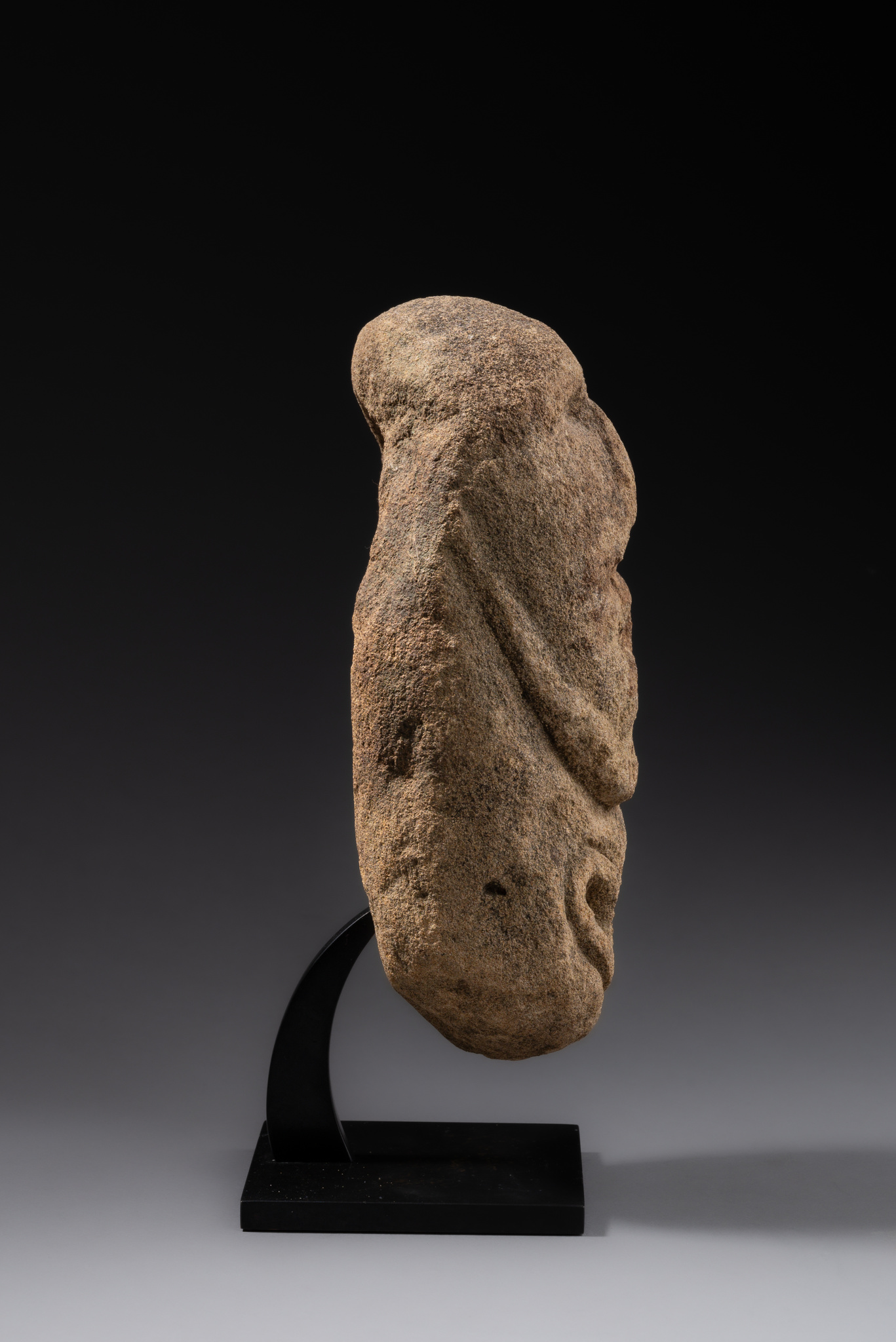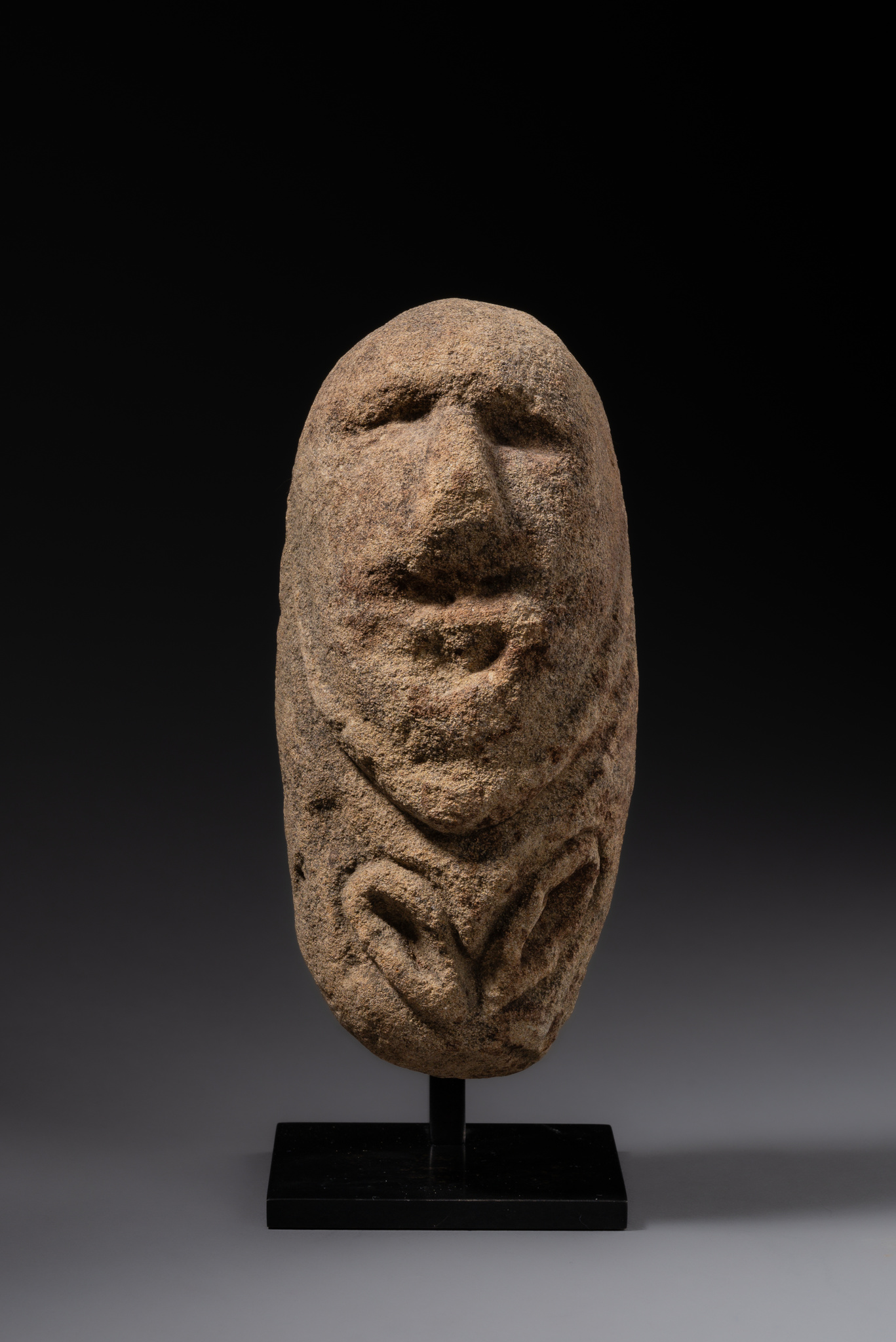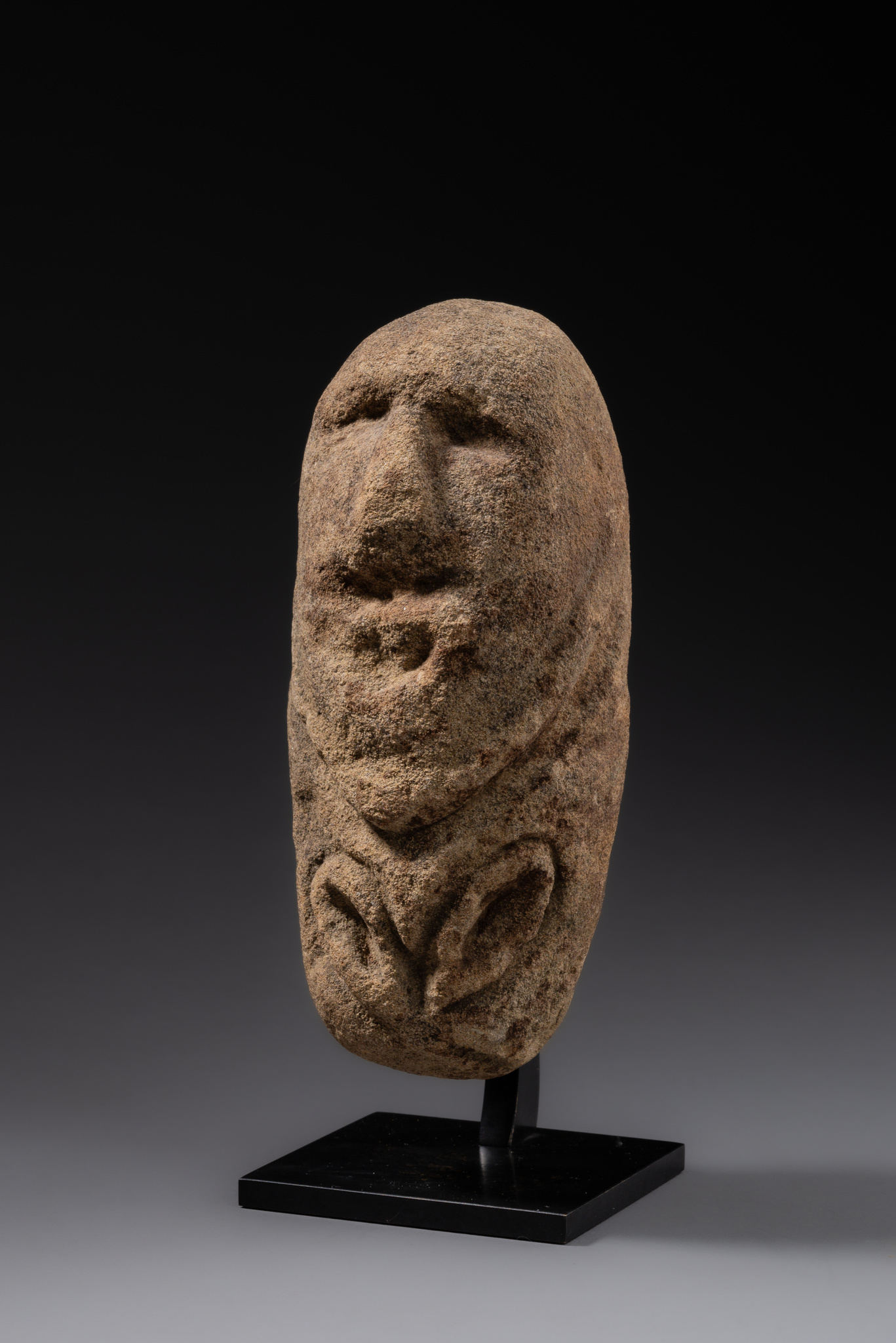 Diese Steinskulptur zeigt ein archaisch wirkendes Gesicht mit stark hervorgehobener Nase, tief eingeschnittenen Augen und einer markant geöffneten Mundpartie. Die grobe Bearbeitung verleiht der Figur eine besondere Ausdruckskraft. Unterhalb des Gesichts befinden sich reliefartig eingearbeitete Ornamente, die das Erscheinungsbild zusätzlich akzentuieren.