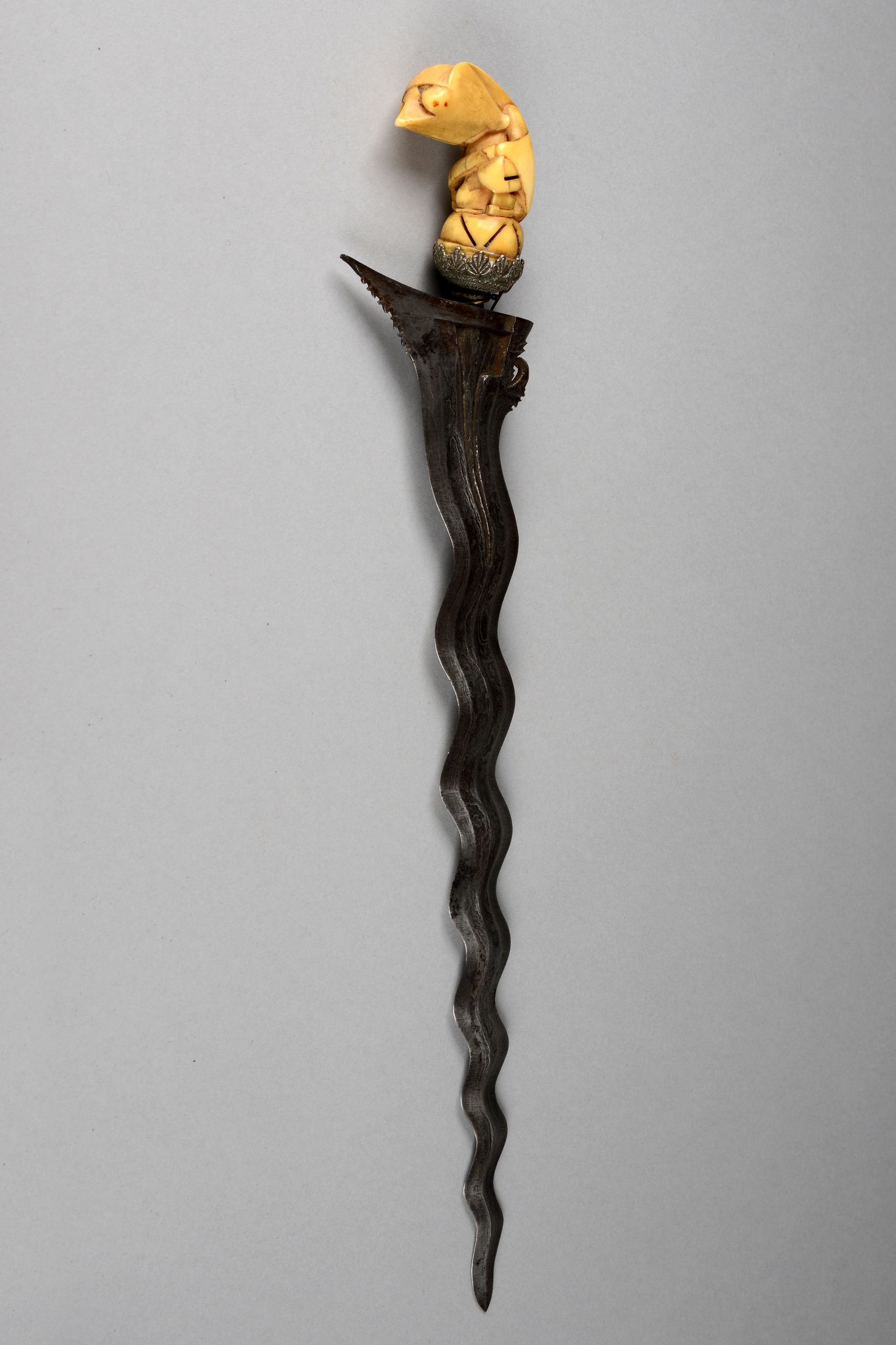 mit zweischneidiger, damaszierter und gewellter Klinge (symbolisiert die Bewegungen der mythischen Schlange), Griff aus Elfenbein in Gestalt einer stilisierten menschlichen Figur mit Vogelkopf, min. besch., feine Risse, leichte Korrosionsspuren