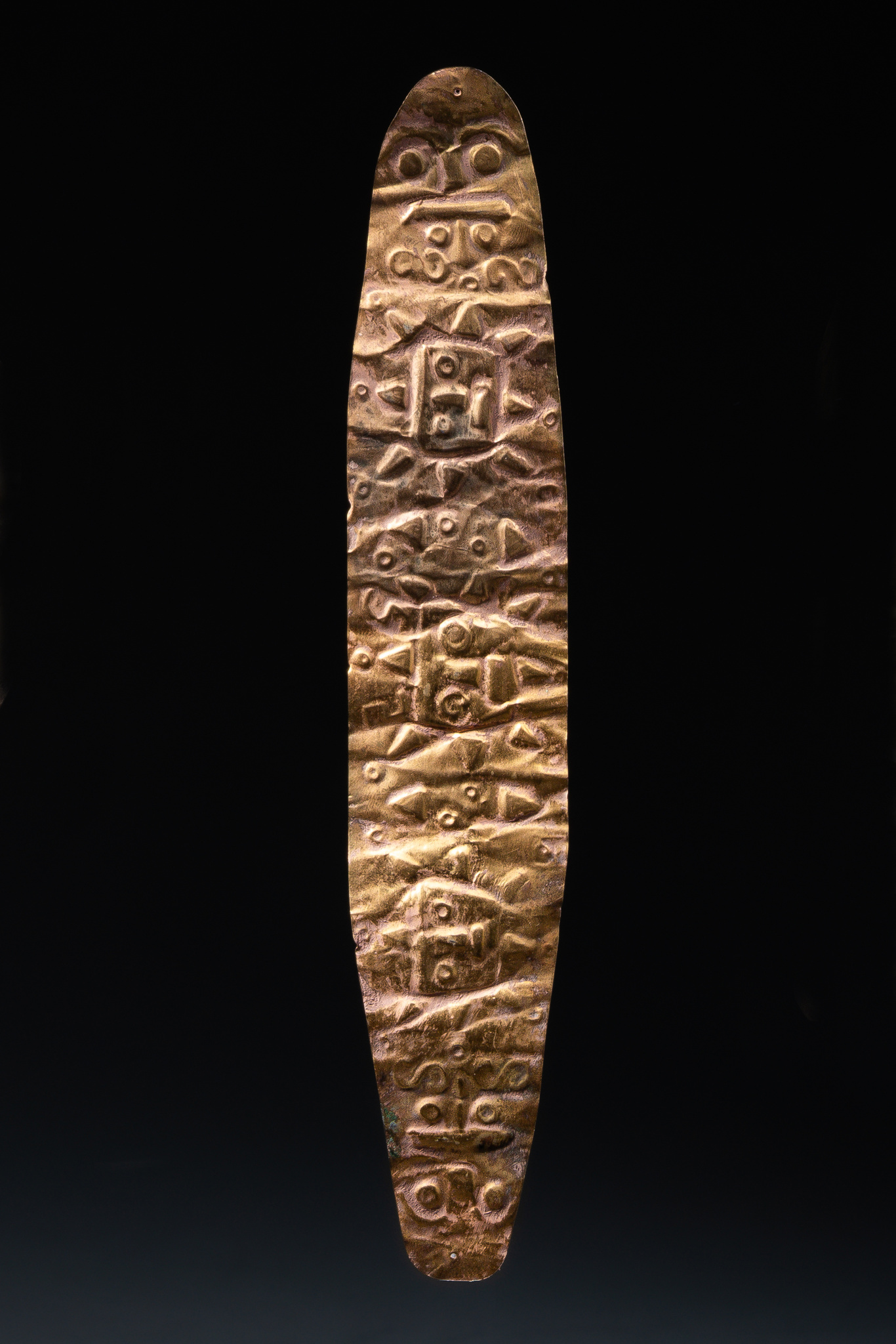 gehämmertes Blech, leichte Goldauflage, Pigmentreste, Vogelmaske mit geflügelten Fortsätzen, H/B: 7,8 cm / 14,5 cm; Ornament mit Maskengesichtern in Treibarbeit, L: 19 cm; figurale Applikation, H: 13,8 cm