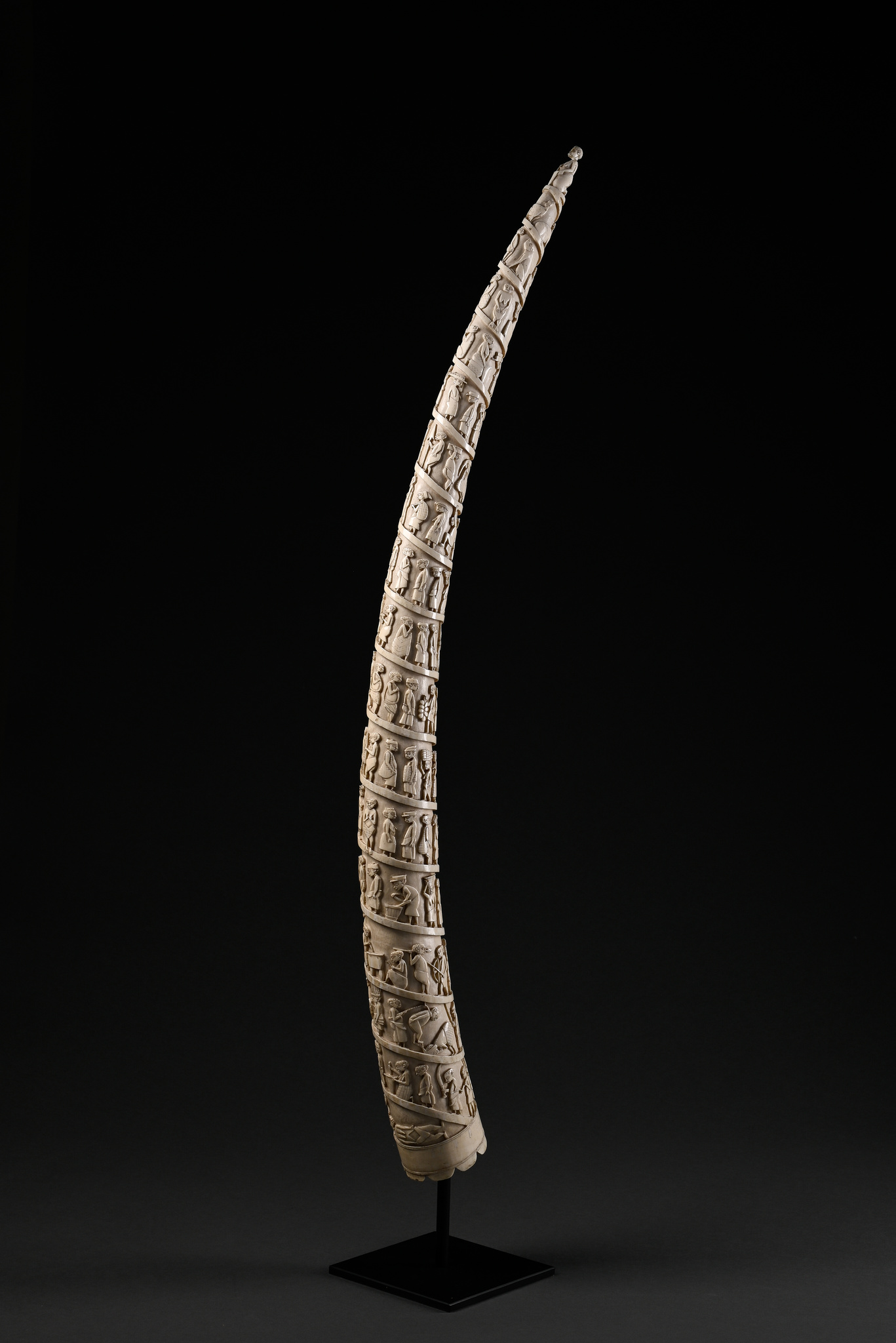 Der Stoßzahn ist mit Reliefschnitzereien verziert, die spiralförmig von unten nach oben verlaufen. Sie zeigen Szenen aus dem alltäglichen Leben, insbesondere geschäftliche Transaktionen zwischen Europäern und Afrikanern.