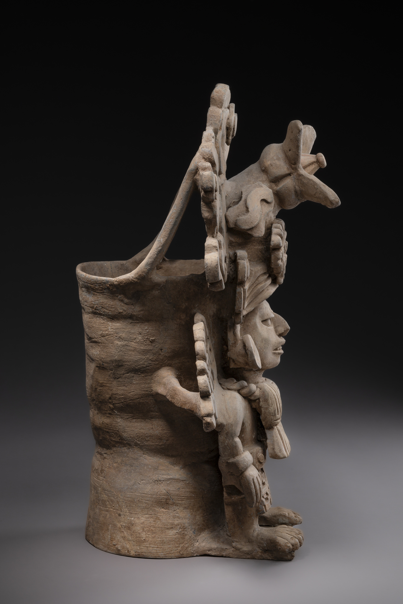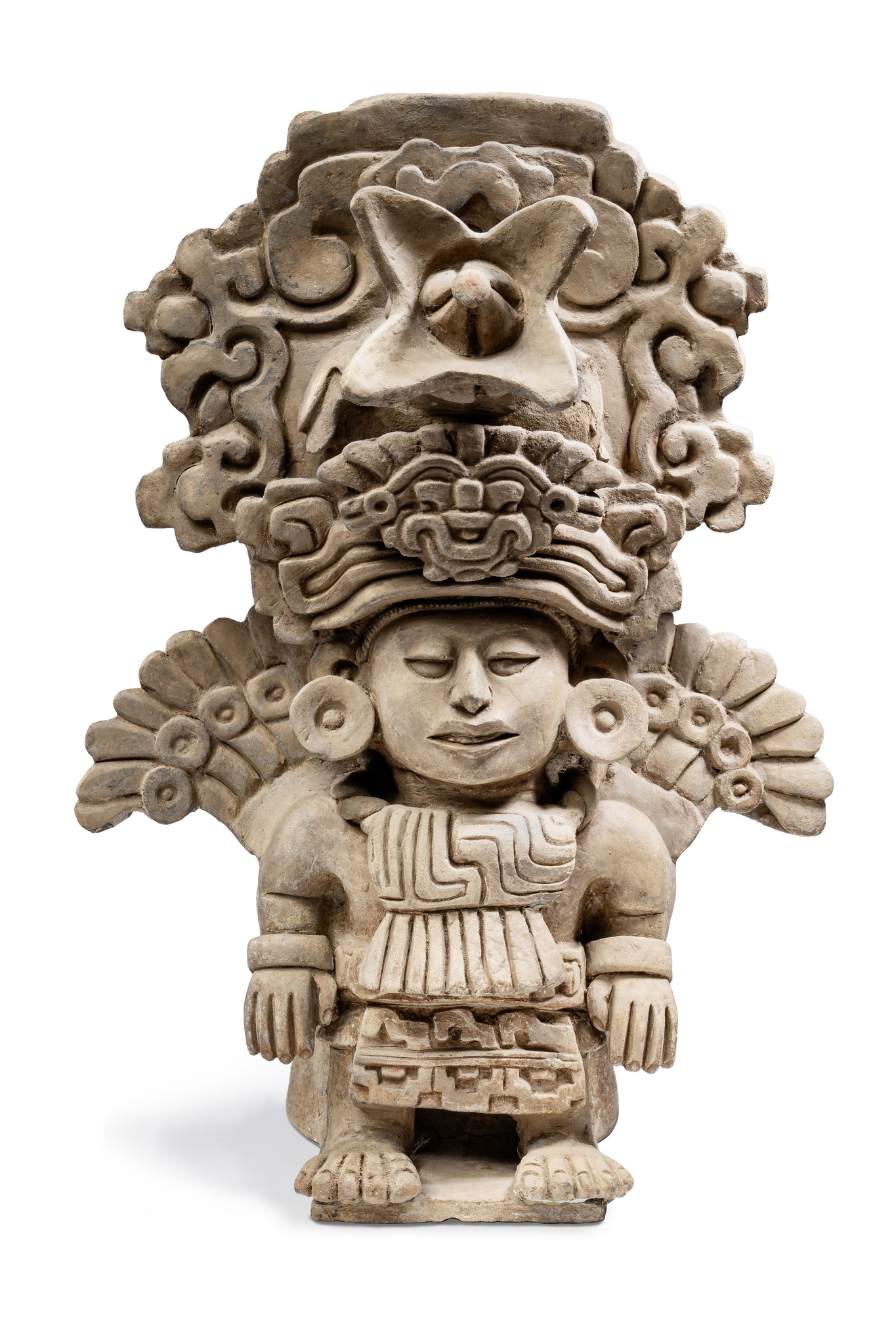 Der zylinderförmigen Urne ist eine männliche Figur vorgeblendet, die überaus prachtvolle Kleidung, Feder- und Kopfschmuck trägt. Im Stirnteil des Kopfputzes ist ein Medaillon in Gestalt der Hieroglyphe “C” angebracht (vgl. Schuler-Schömig, 1970, Abb. 11). Dieses Glyphenzeichen tritt bei Gottheiten auf, die mit pflanzlicher Fruchtbarkeit in Verbindung stehen. Bei Figurengefäßen wie dem vorliegenden, weist die Glyphe häufig auf eine Darstellung des Regengottes “Cocijo”, der wichtigsten Gottheit im Pantheon der Zapoteken. Er ist für Fruchtbarkeit, Regen und den Maisanbau verantwortlich und gilt auch als eine Manifestation von “Ometeotl”, der höchsten Gottheit der mesoamerikanischen Religion, der die Dualität von Schöpfung und Zerstörung darstellt.