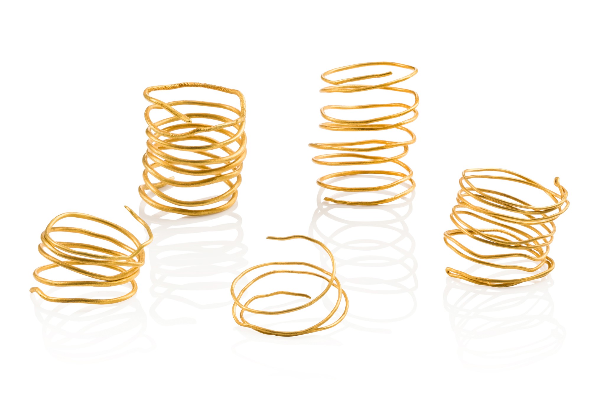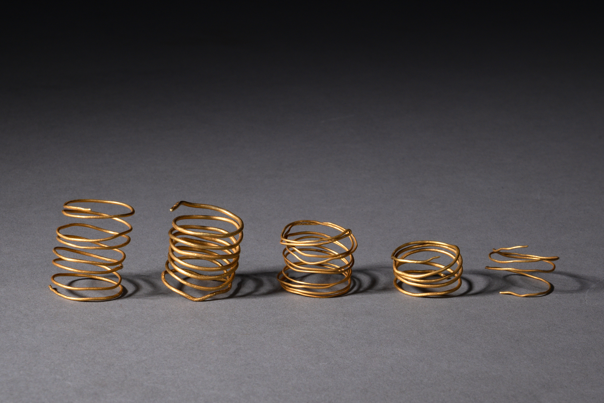 Diese aus goldenem Draht gedrehten Spiralen dienten vermutlich als Zahlungsmittel, können aber auch als Fingerringe, Haar- oder Gewandschmuck getragen worden sein.