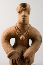 gebrannter roter Ton, Pigmentreste, henkelartig angelegte schlauchförmige Arme, Halskette und Armreif anmodelliert, kleiner Kopf mit schalenförmiger Eintiefung, Lehmverkrustungen, rep. (Hals), Acrylsockel;