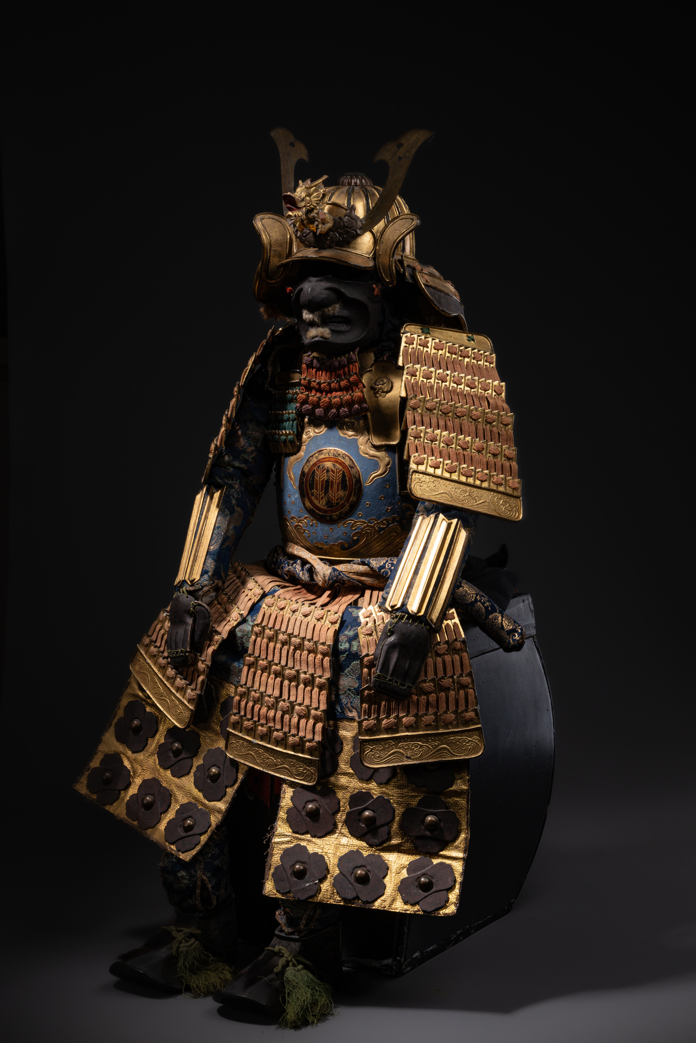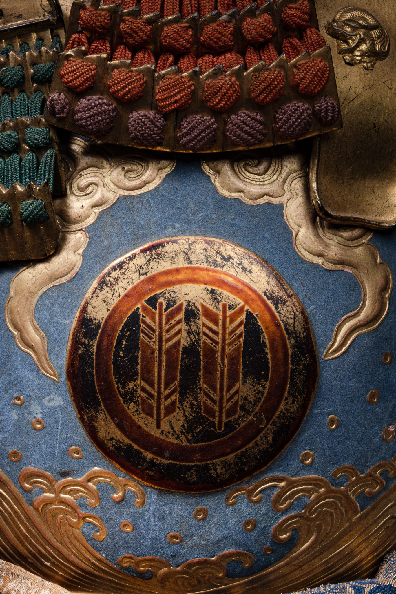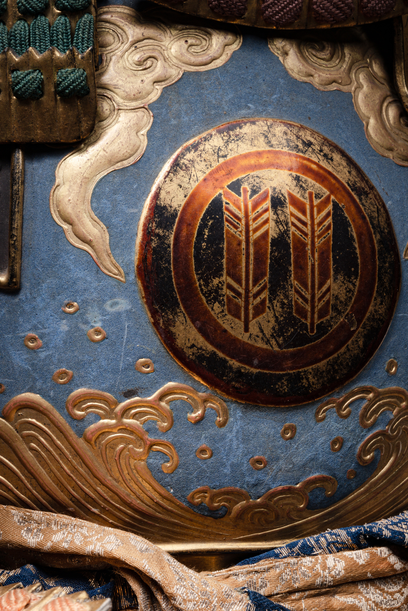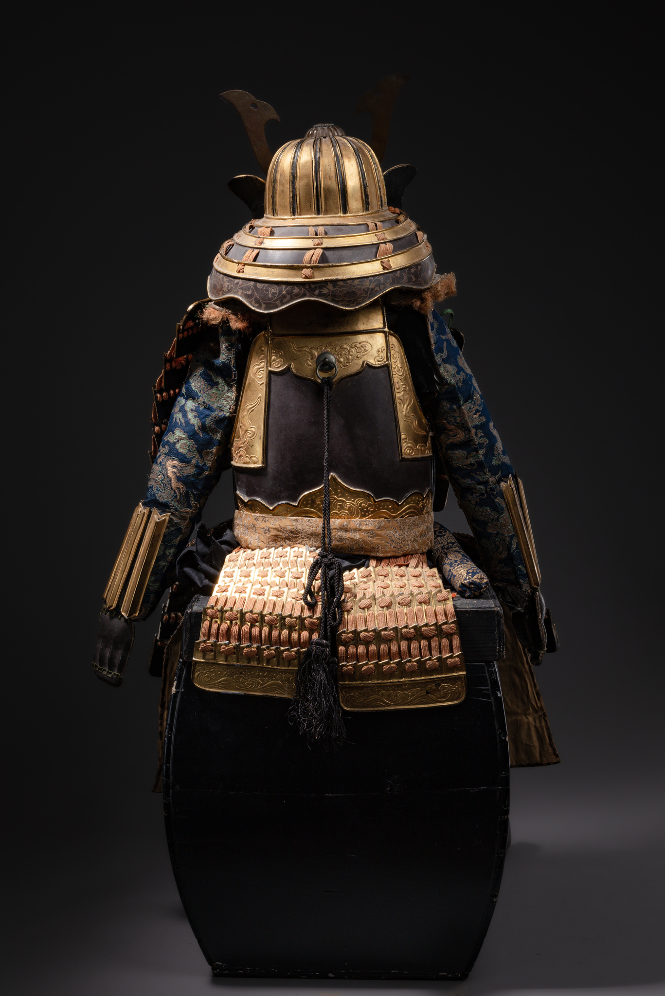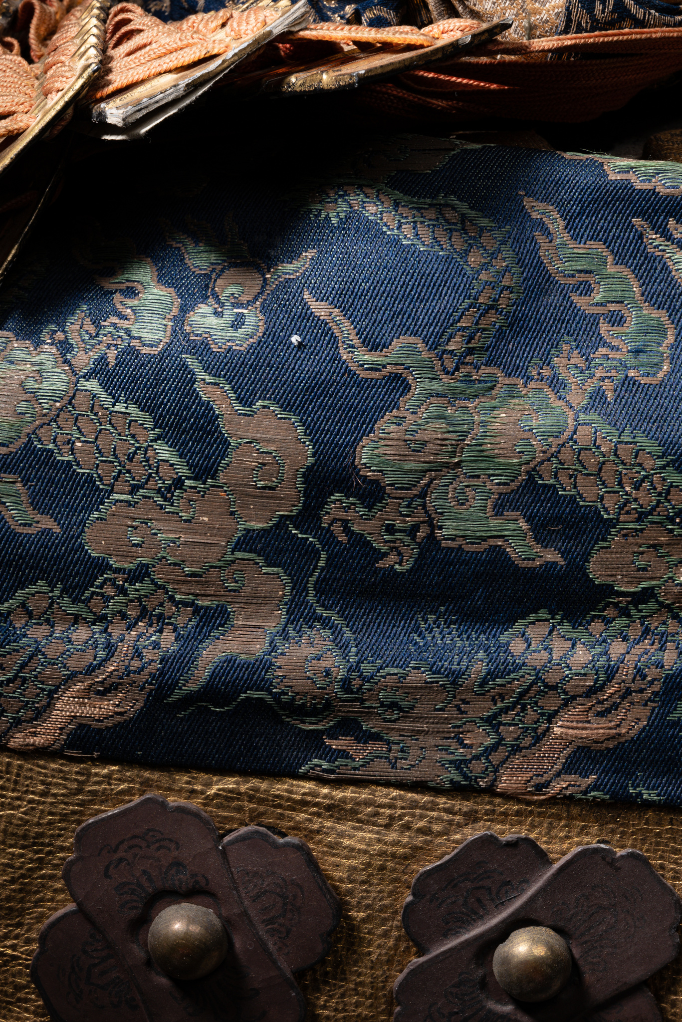 Zweiteiliger Brustpanzer (“do”) rauchblau und gold lackiert, mit Familienwappen (“mon”), zwei unterschiedlich gestaltete, lackierte Holzstücke dienen dazu die Lücke zwischen der Brustplatte und dem Schulterschutz zu schließen. Unter dem fünfteiligen Schulterschutz (“sode”), Ärmel (“kote”) aus blauem Brokatstoff, besetzt mit vergoldeten Holzlamellen, dreiteiliger Handschutz (“tekko”).