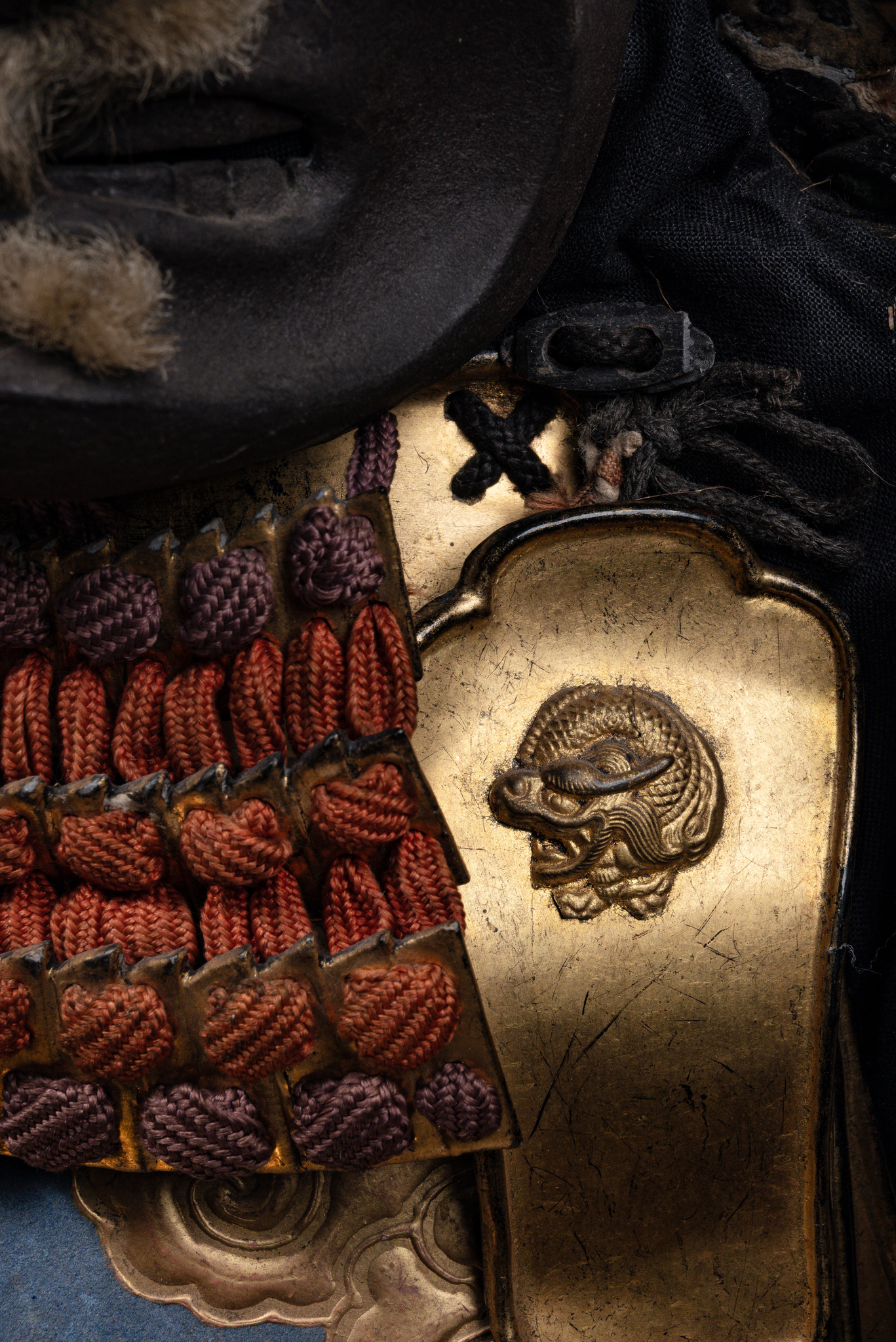 Fünfteiliger Schutzrock (“kusazuri”), aus jeweils fünf mit Goldlack überzogenen Holzlamellen an apricot-farbenen Litzensträngen, ein Gürtel mit gepolsterten Enden aus blauem Brokatstoff kaschiert den Ansatz des “kusazuri” am Brustpanzer.