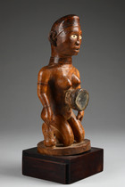 Diese schöne, reich mit Hals- und Armringen beschnitzte Figur trägt eine Kalebasse in der rechten Hand. Ungewöhnlicherweise ist ihre magische Ladung durch das Glas, das den Behälter am Bauch verschließt, sichtbar.