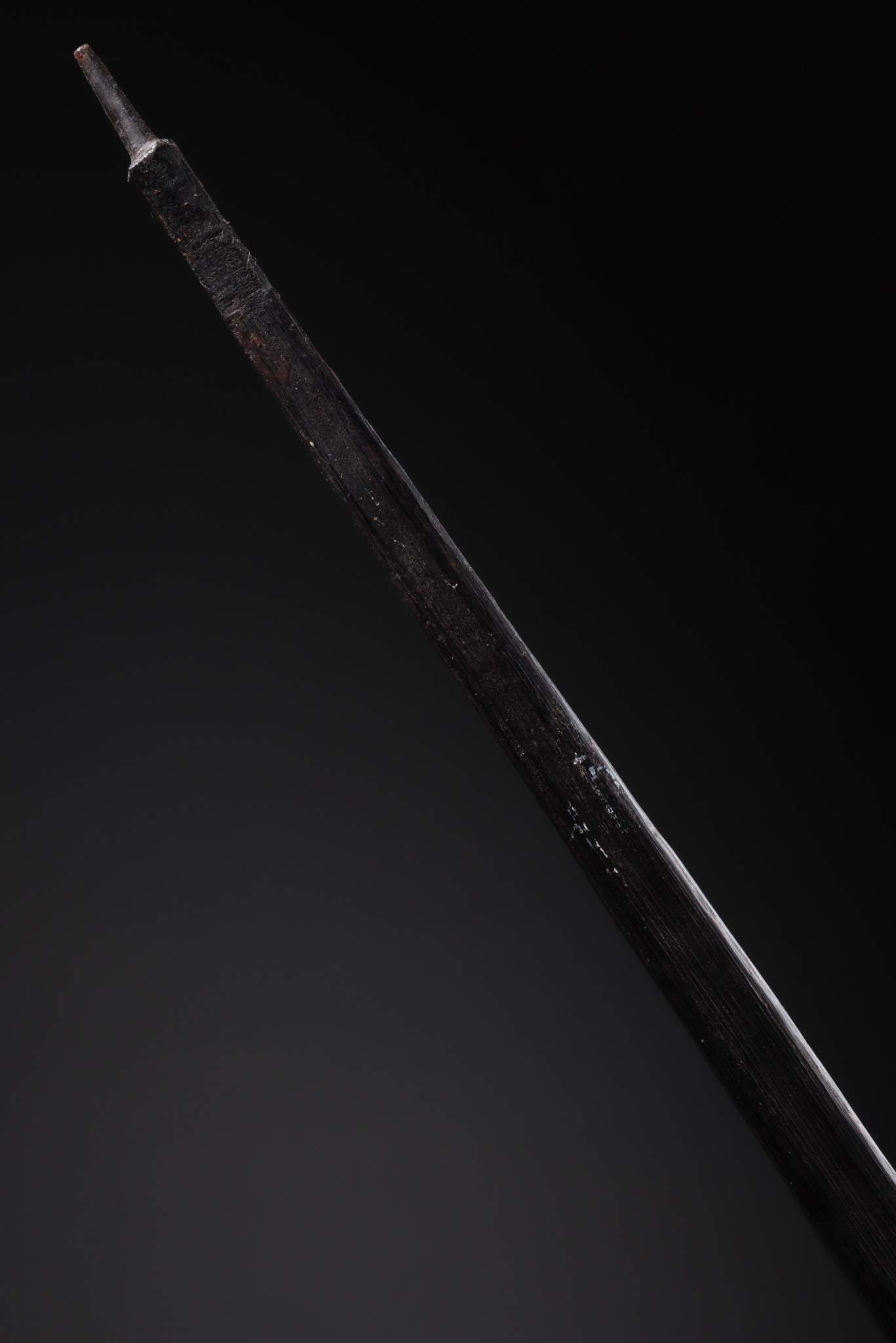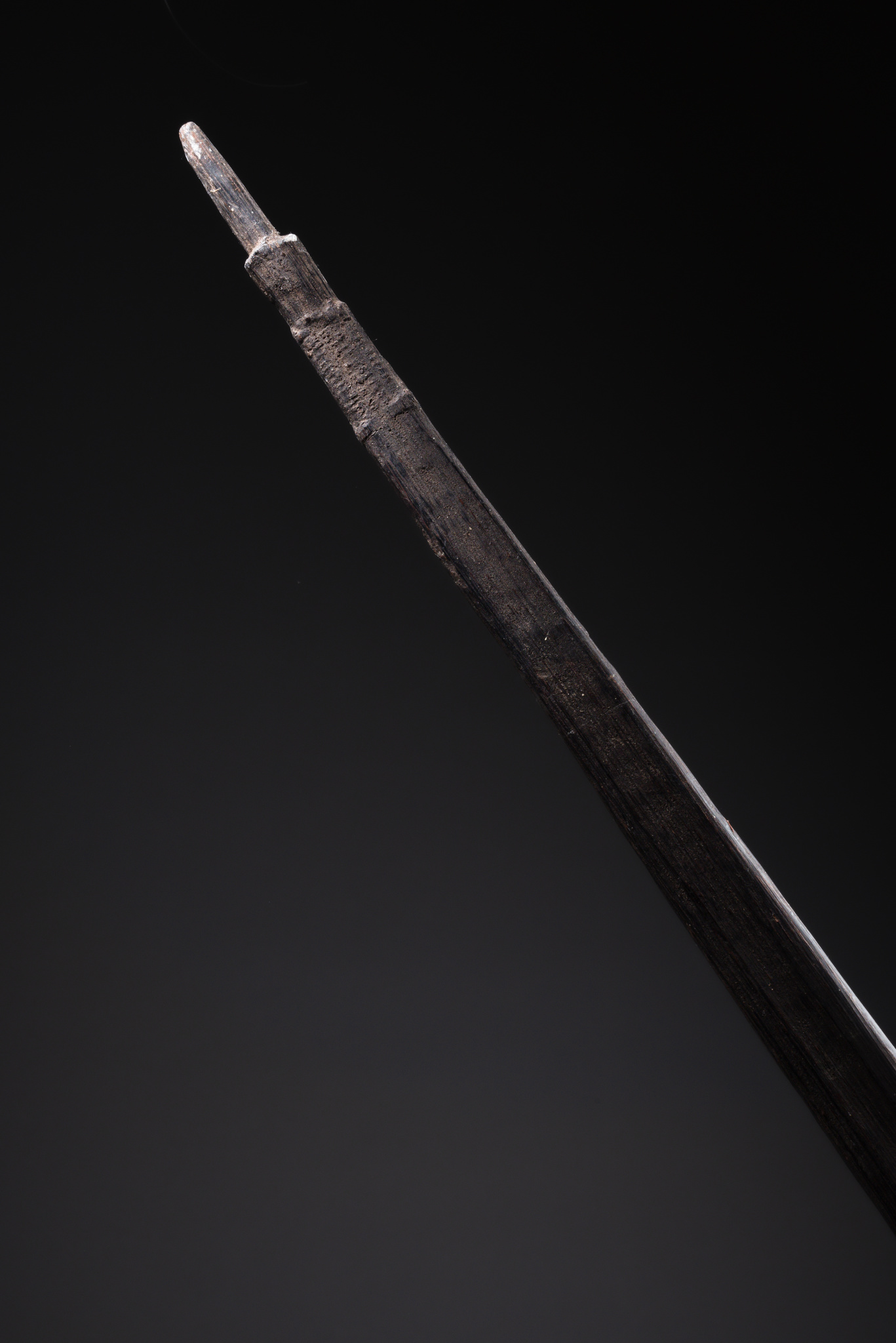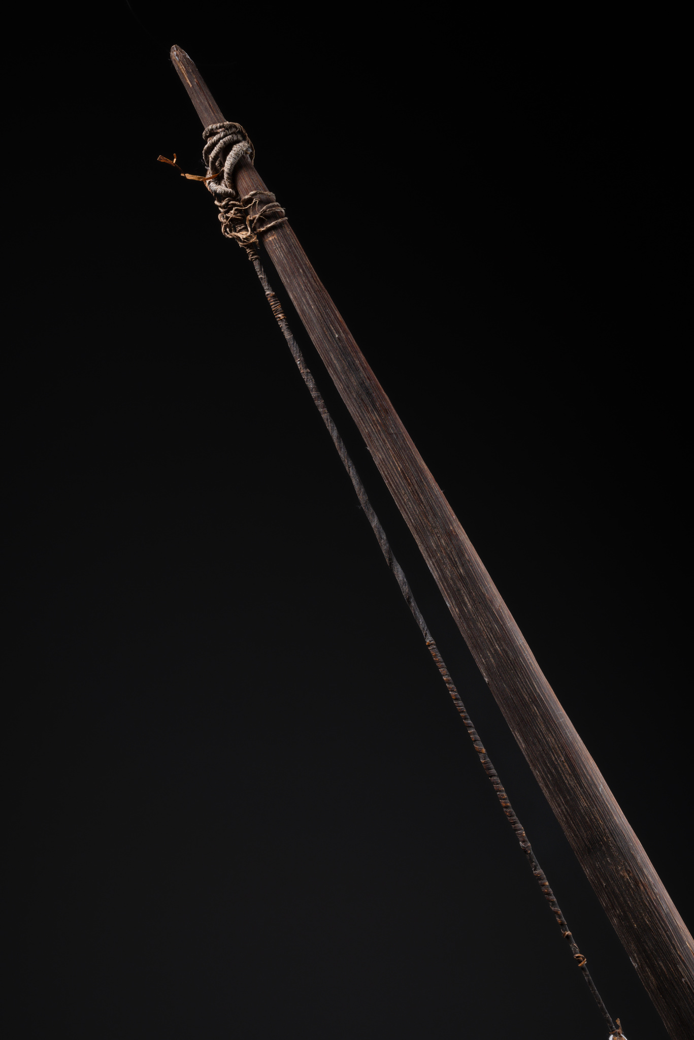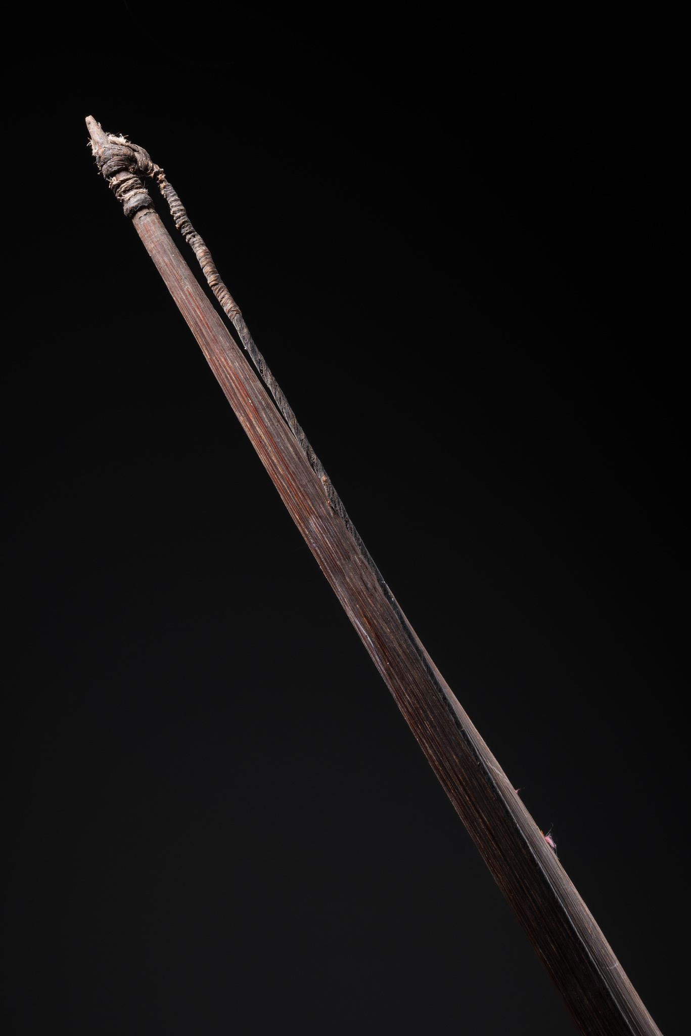 28-tlg., Holz, Bambus, Farbpigmente, Orchideenbast, zwei Bögen, einer mit Sehne, L: 182 cm & 198 cm; 26 Pfeile, diverse Formen und Längen: 99 cm - 149 cm, einer mit Bambusspitze und rückseitig eingesteckten Federn; einer mit Widerhaken und Kuskusfell; ein Pfeil mit Knochenspitze