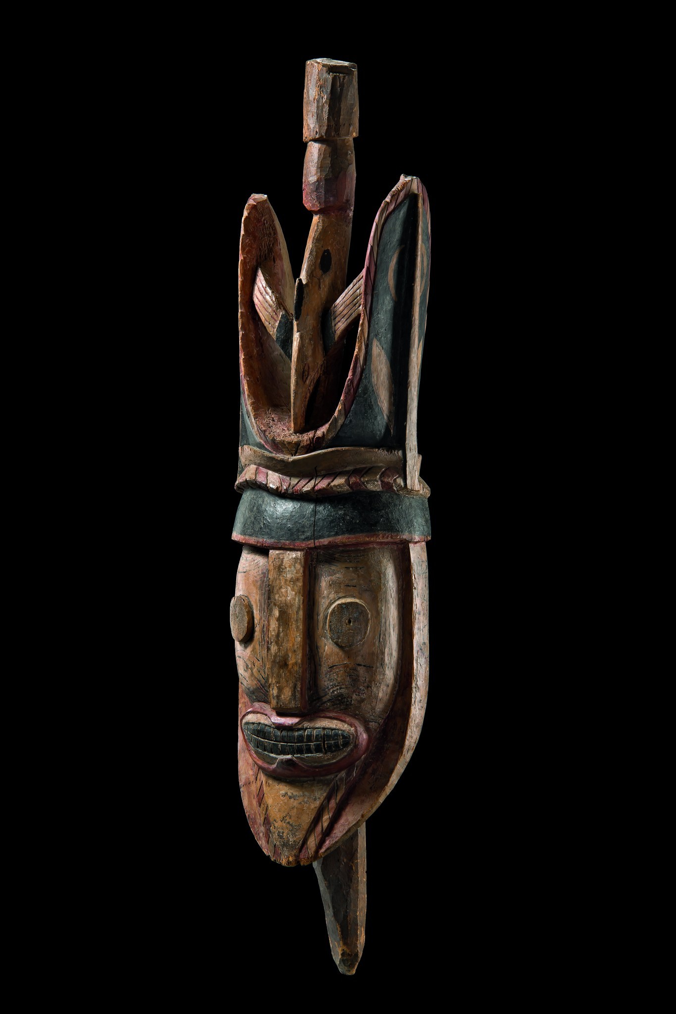 schweres Holz, Reste von Bemalung mit rotem, schwarzem und weißem Pigment, dominiert durch einen breiten Mund mit gefletschten Zähnen und große scheibenförmige Augen, bekrönt von zweiflügeligem Kopfaufsatz, ein Mischwesen aus Vogel und Fisch in der Mitte tragend, ursprünglich bemalt mit kurvilinearer Ornamentik, min. best., Fehlstellen, Risse, Farbabrieb, rep. (am linken Flügel des Kopfaufsatzes);
