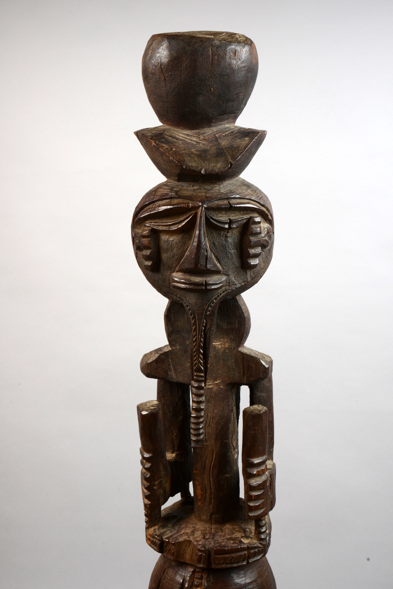 Holz, braune, teilweise glänzende Patina, gelängter birnenförmiger Körper mit verkürzter Beinpartie und Skarifikationen, bekrönt von rundem Kopf mit langem Kinnbart und hoher Kopfbedeckung, zwei längliche Gegenstände in den Händen haltend, besch., Fehlstellen durch Insektenfrass (Beinpartie, Rückseite), Risse, Abriebspuren, Sockelplatte;