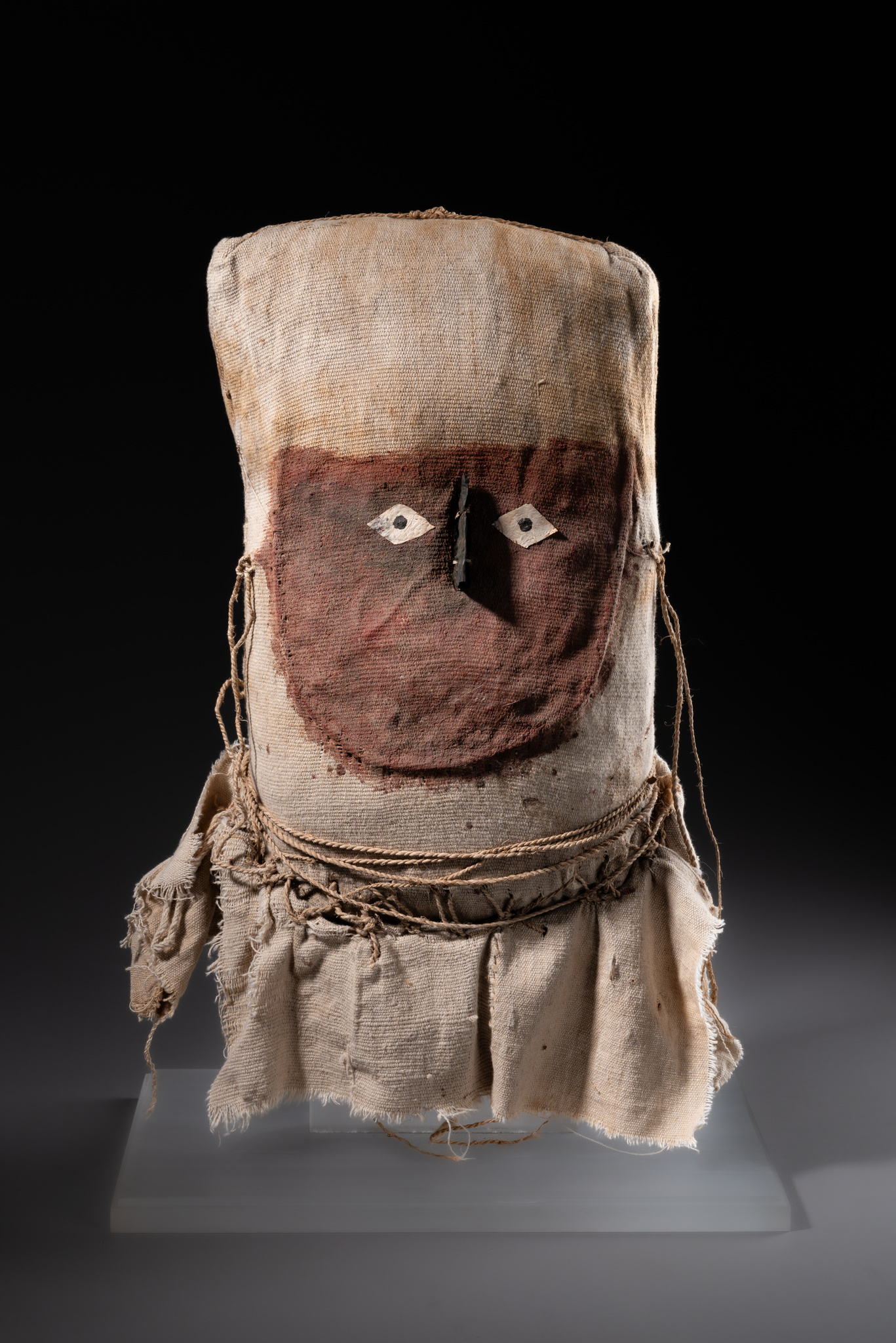 Textilhülle aus grob gewebter cremeweißer Baumwolle und Kamelidenfasern (Alpaka oder Lama), kissenartig gefüllt mit roher Baumwolle, Gräsern und Blättern, die Gesichtsfläche mit roter Farbe gekennzeichnet, Augen und Nase (Blech) appliziert.