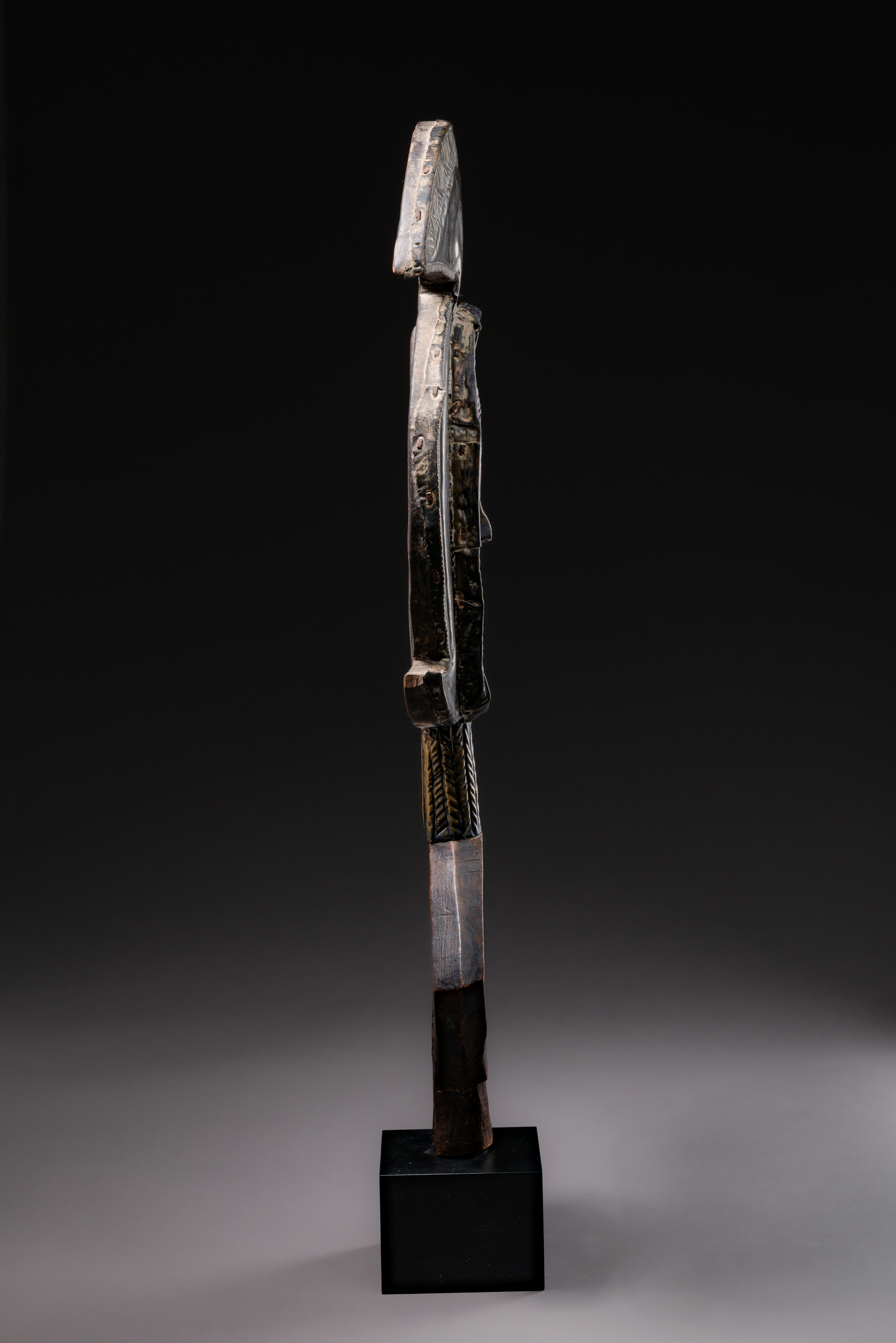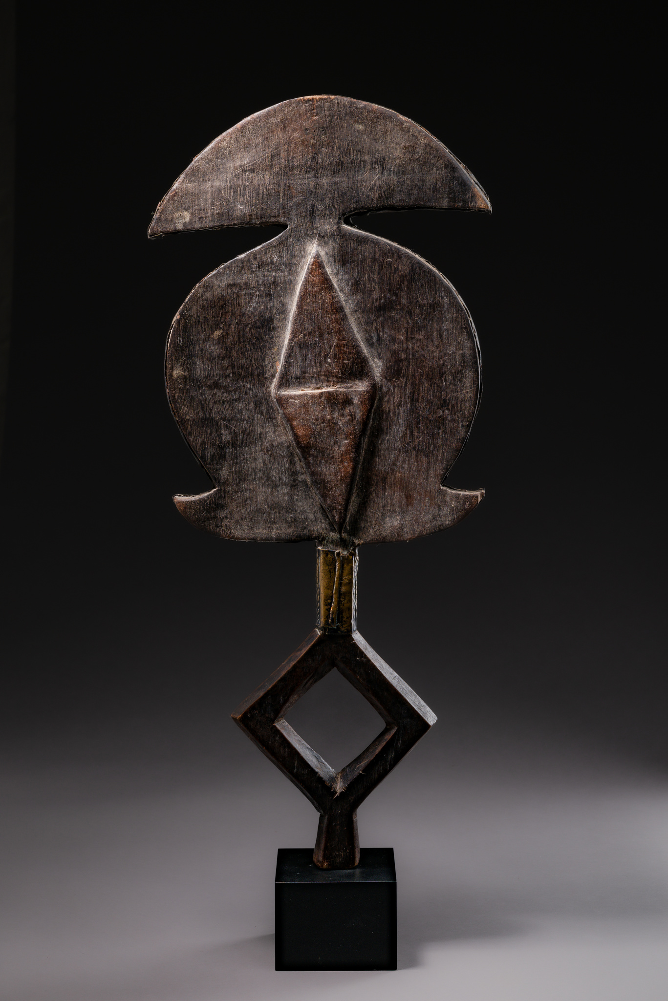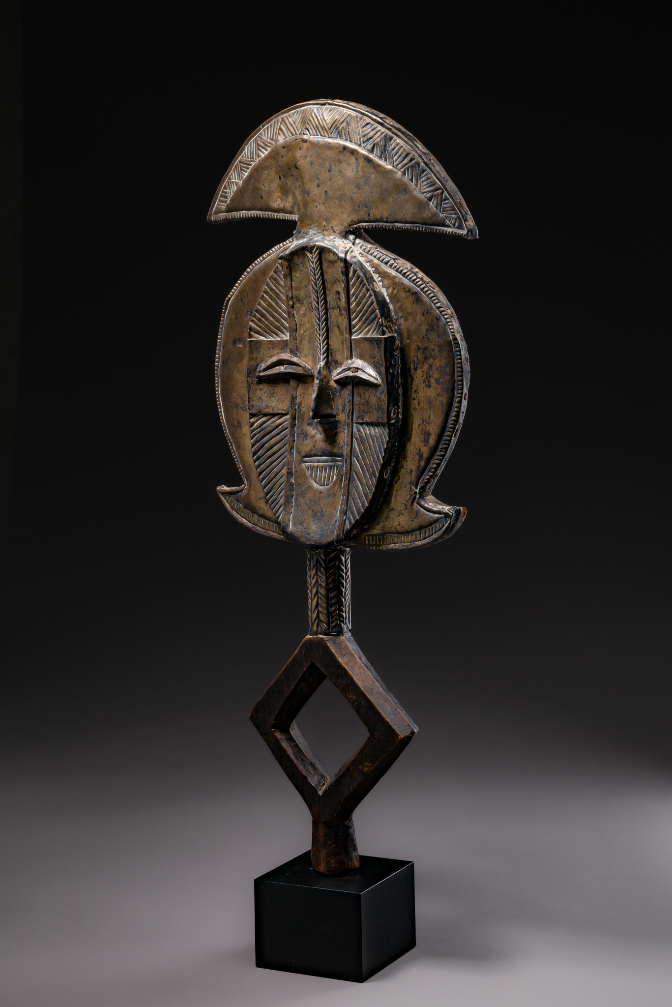 Diese Behälter werden von figürlichen Skulpturen aus Holz und Messing bekrönt, von denen man glaubt, dass sie die Schutzgeister der Ahnen verkörpern, die sich in den Behältern befinden.