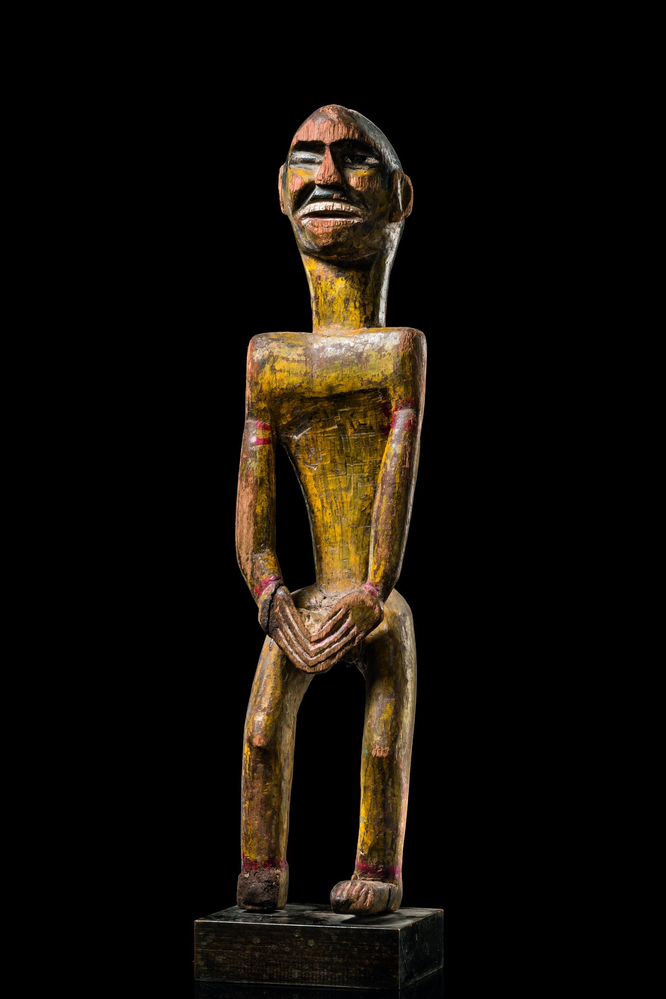 Holz, polychrome Bemalung, schematisierter Körper mit kantigen Schultern, verhältnismäßig kleiner Kopf mit ansteigender schmaler Stirn, min. besch., kleinere Fehlstellen (Stirn, Nase, rechter Fuß), Bruchstelle (rechtes Handgelenk), rep. (linke Fußspitze), Farbabrieb, auf Sockelplatte