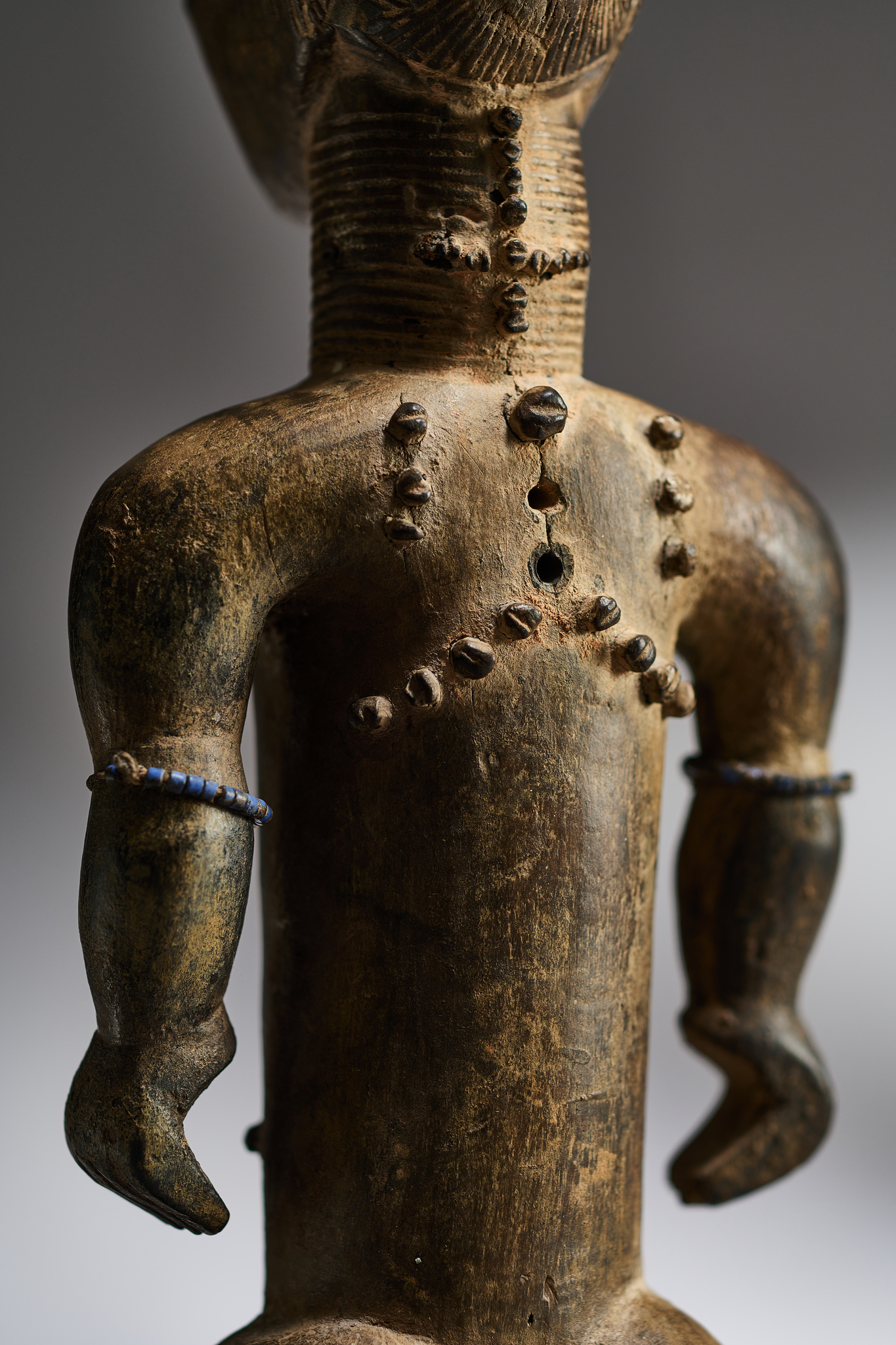 Sehr schöne Figur mit markanter zweischöpfiger Frisur und fein gearbeiteten Details. Hals und Frisur sind mit feinen Rillen beschnitzt. Ein interessantes Detail sind die kleinen noppenförmigen Skarifikationen, die separat gearbeitet, und in eigens dafür gebohrte Löcher eingesteckt sind.