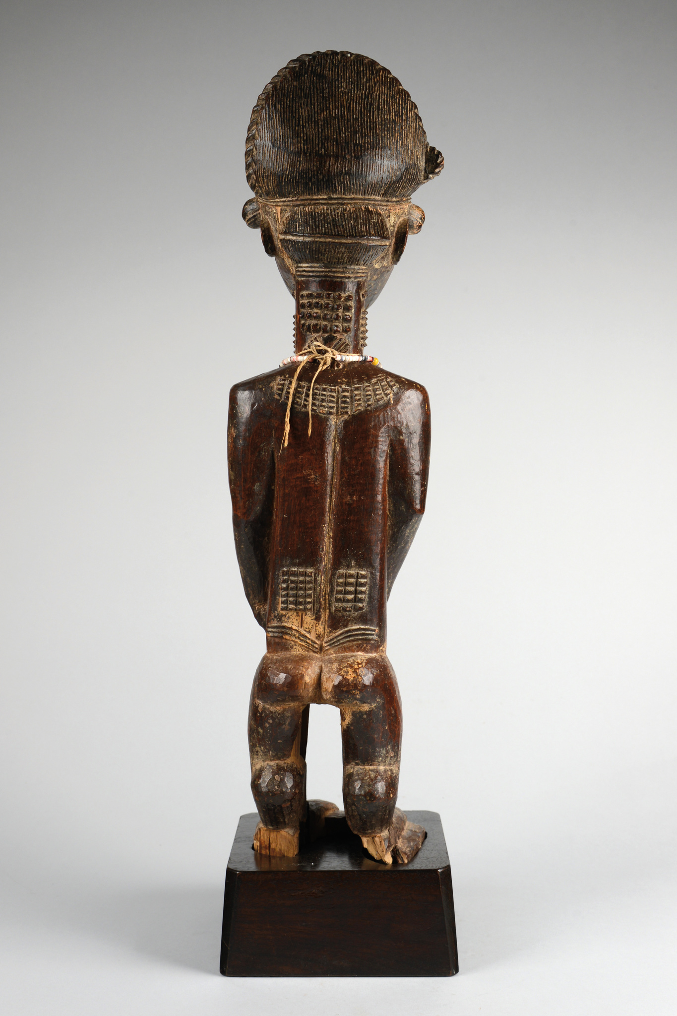 Sie trägt eine originelle Frisur mit individuellen Details und ist an Gesicht, Hals und Rücken üppig mit Skarifikationsmalen geschmückt. Nach dem Schönheitsempfinden der Baule ist diese Figur die idealisierte Darstellung einer Frau.