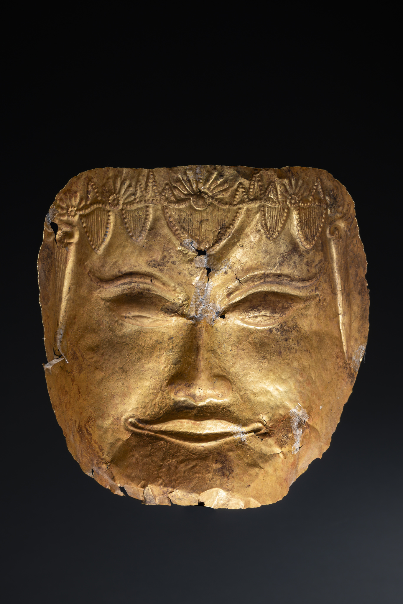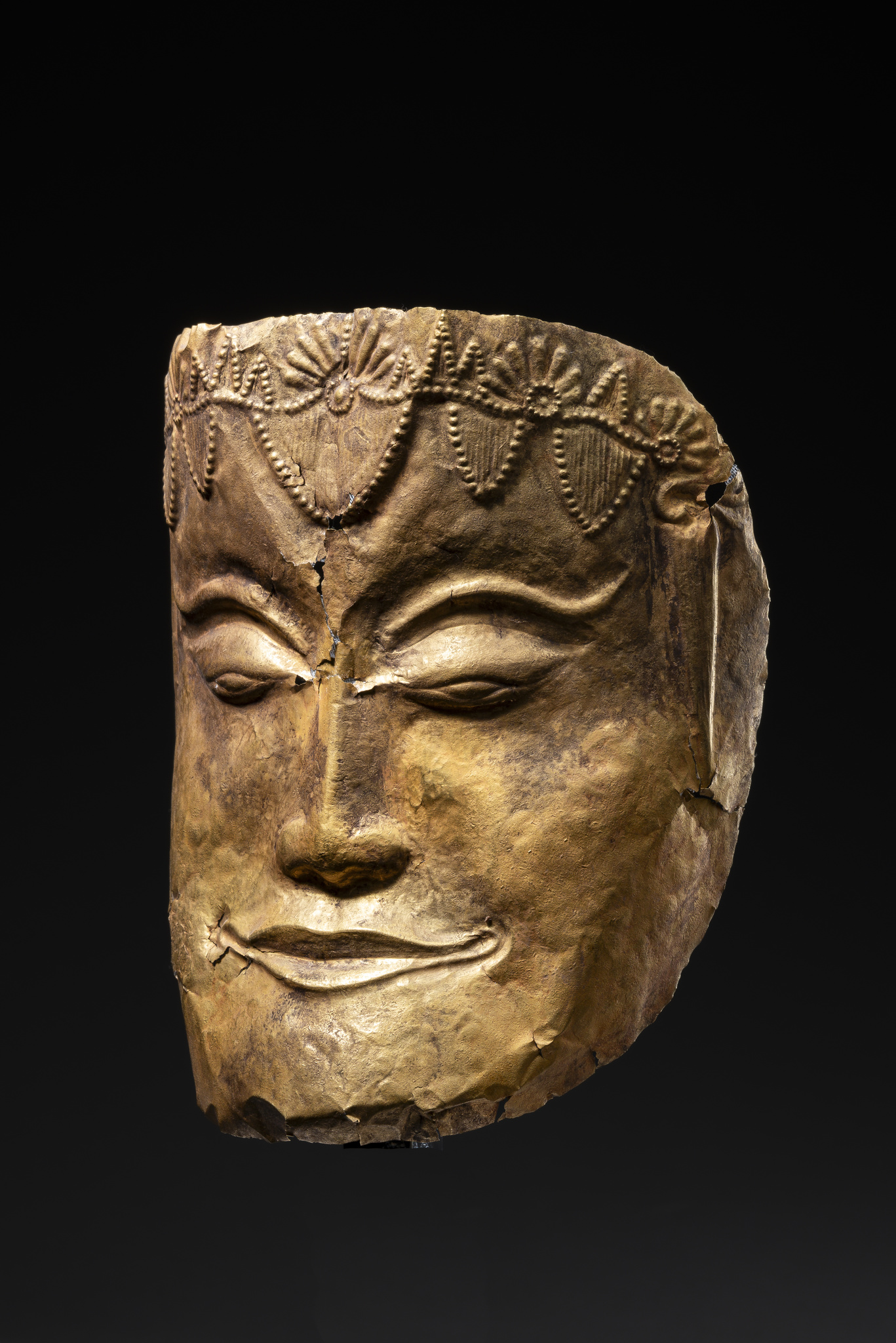 Diese Maske ist aus einem einzigen dünnen Goldblatt gehämmert und getrieben. Das wunderschöne Gesicht zeigt mandelförmige Augen, die von elegant geschwungene Augenbrauen überfangen werden. Die Stirn ziert ein schmückendes Diadem mit floralen Motiven und punziertem Dekor.