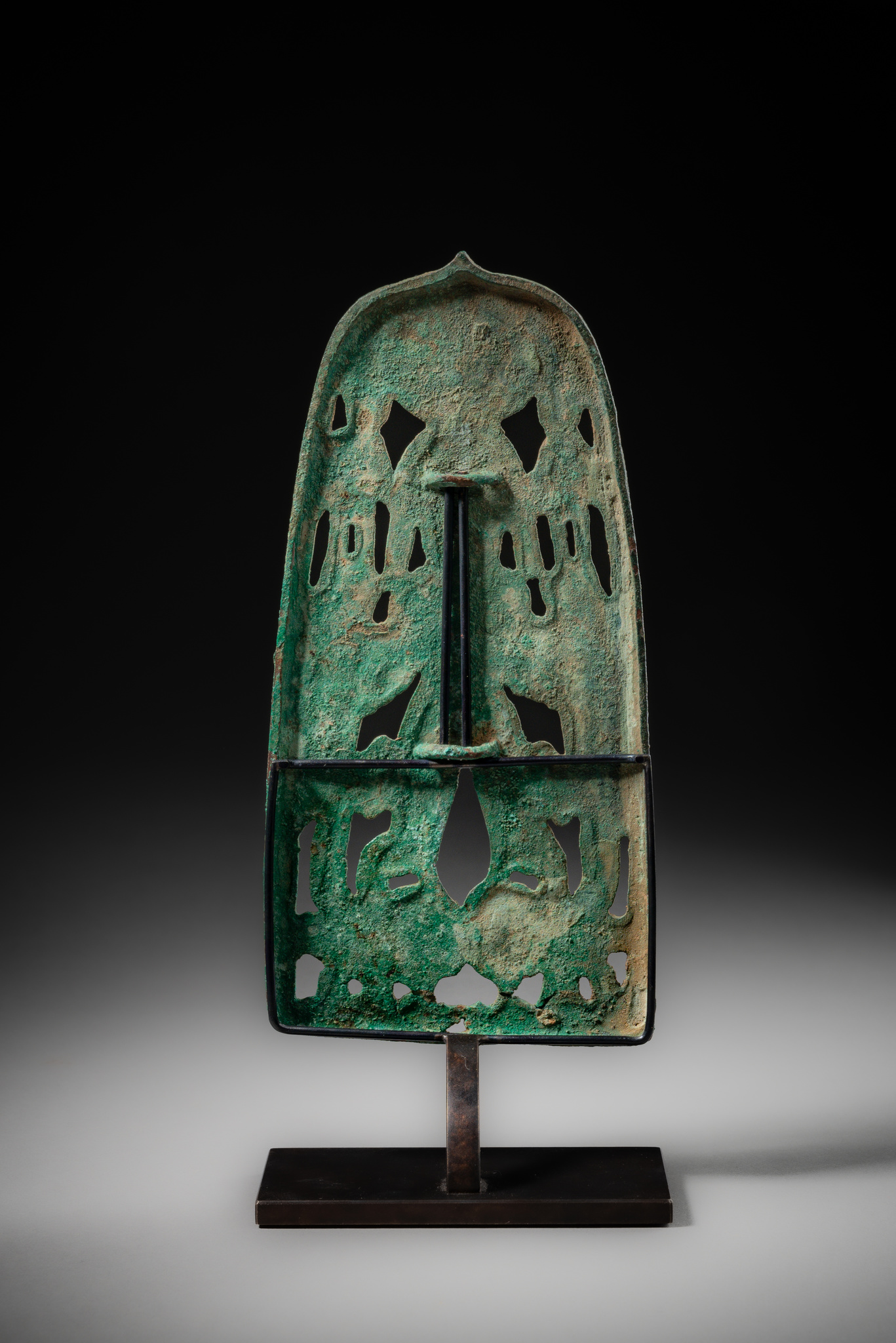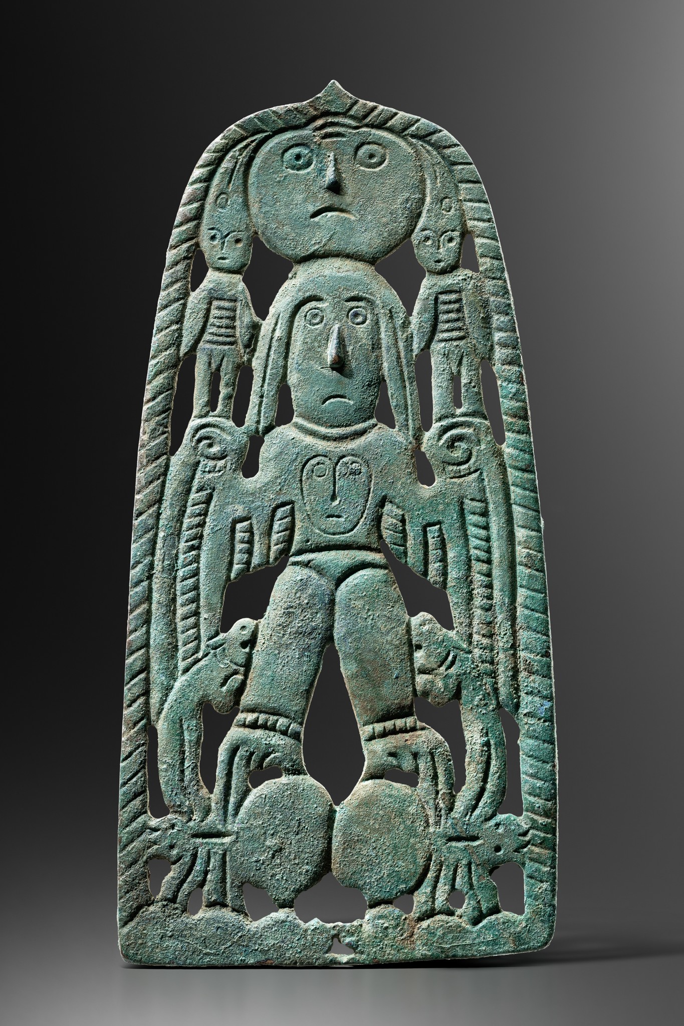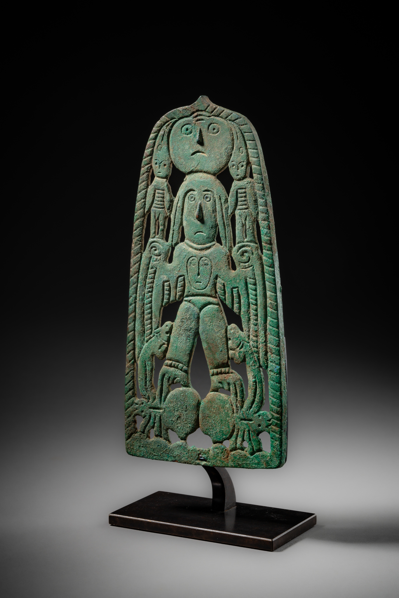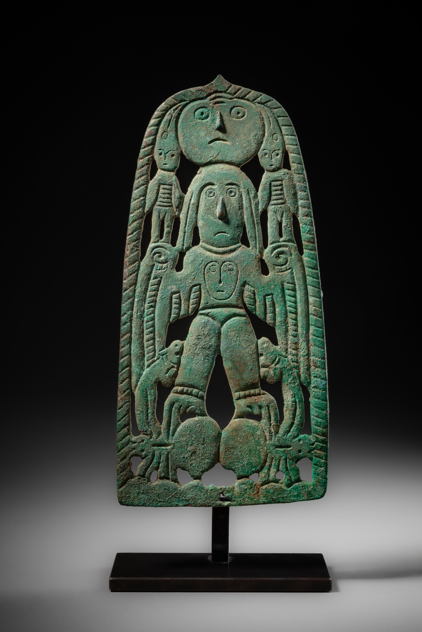 The present plaque exhibits particularly strong stylistic affinities with two Cherdyn plaques (ibid., p. 73, fig. 1, ChKM-1927/1 & ChKM-1927/2). Its pierced composition is dominated by a central large figure, whose striking wing-like arms and clawed feet immediately draw the eye. The figure is surmounted by a disc-shaped face and flanked at head height by two small attendant figures. A further distinctive feature is the prominent, hooked nose, which projects from the flat cast surface and evokes the form of a bird’s beak.