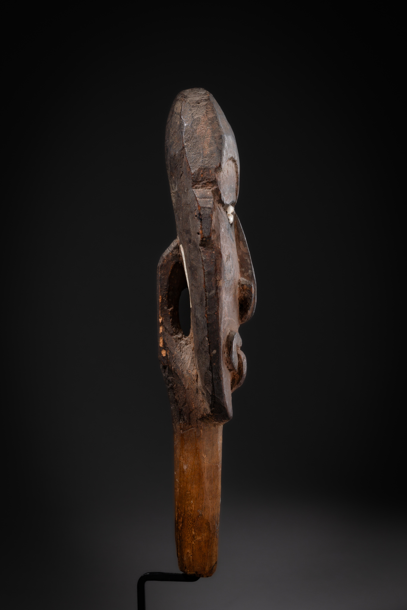 The figural flute finial seals the upper end of a bamboo flute used in Iatmul ritual ceremonies. Its facial features and hairline point to this cultural context.