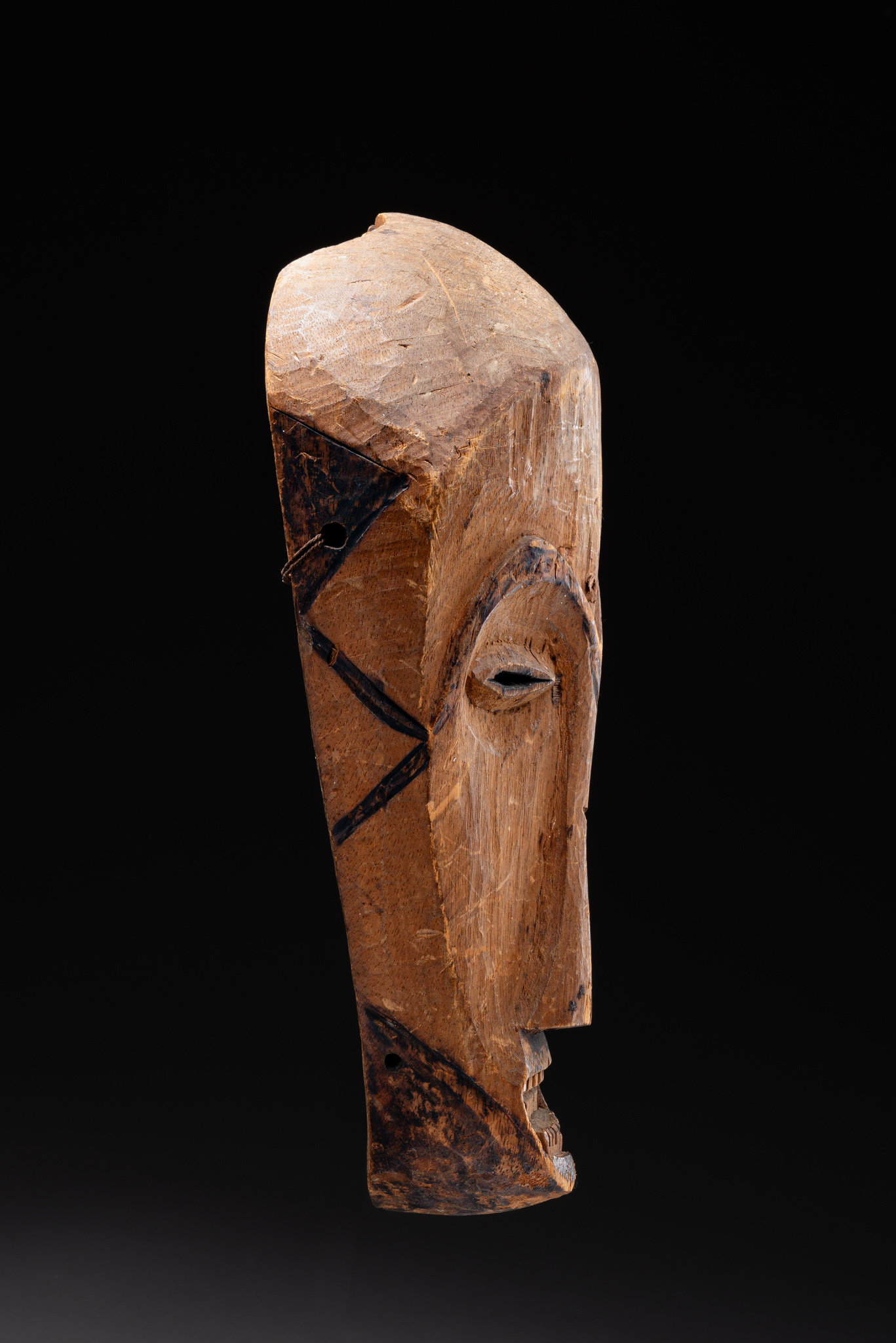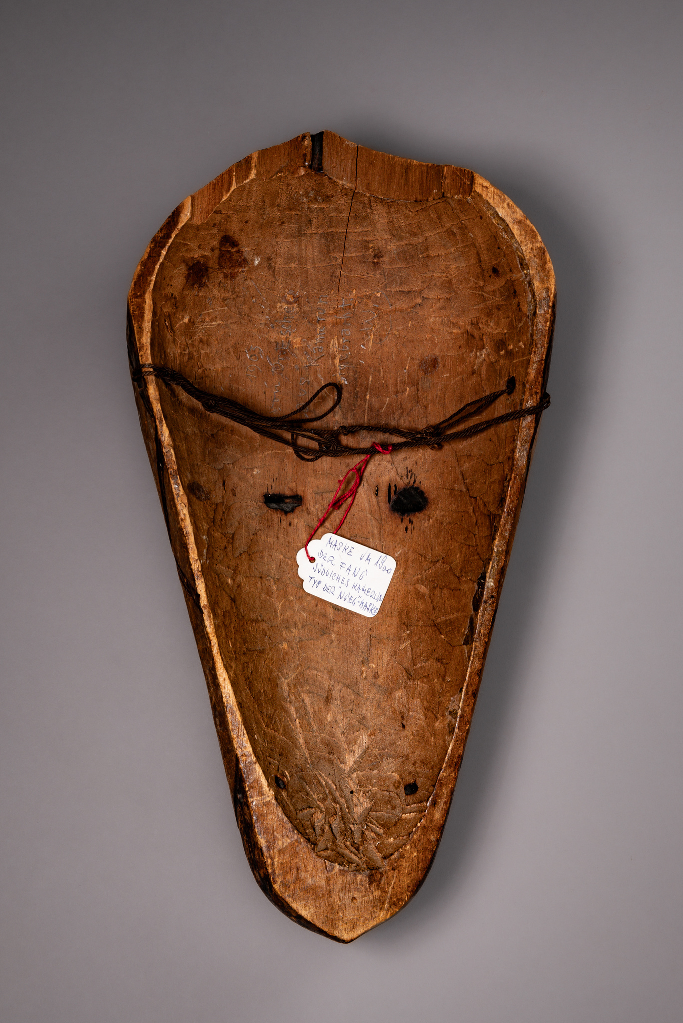 wood, inside inscribed in graphite: “1903 von Dr. Esche aus Kamerun mitgebracht…” (illegible); handwritten label: “Maske um 1900 - der Fang - Südliches Kamerun - Typ der “Ng’el” Maske”