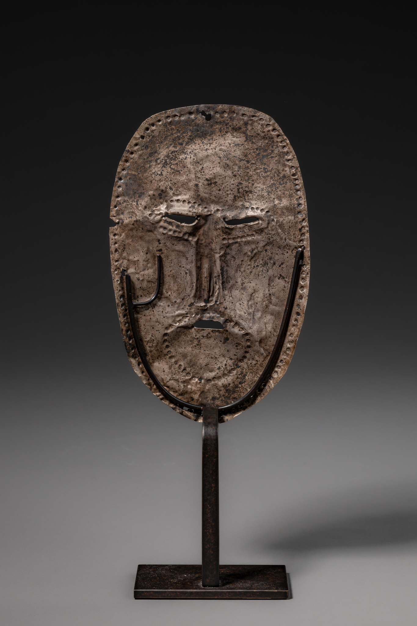 The oval mask is crafted from thinly hammered silver sheet. The eyes and mouth are cut out and, like the mask’s edge, are outlined with punched decoration. Various holes along the edge served to secure the mask in place.