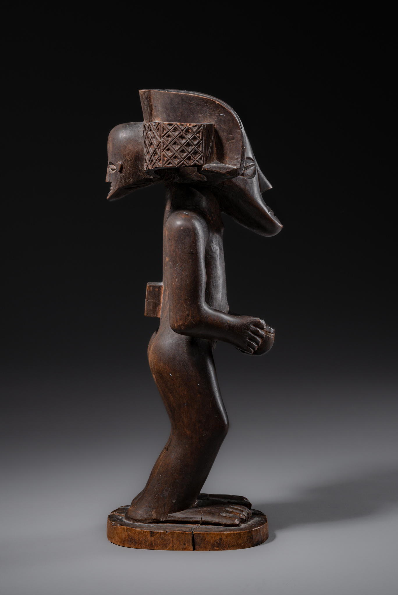Unusually, a second, smaller mask-like face is carved on the back of the head, individually designed.