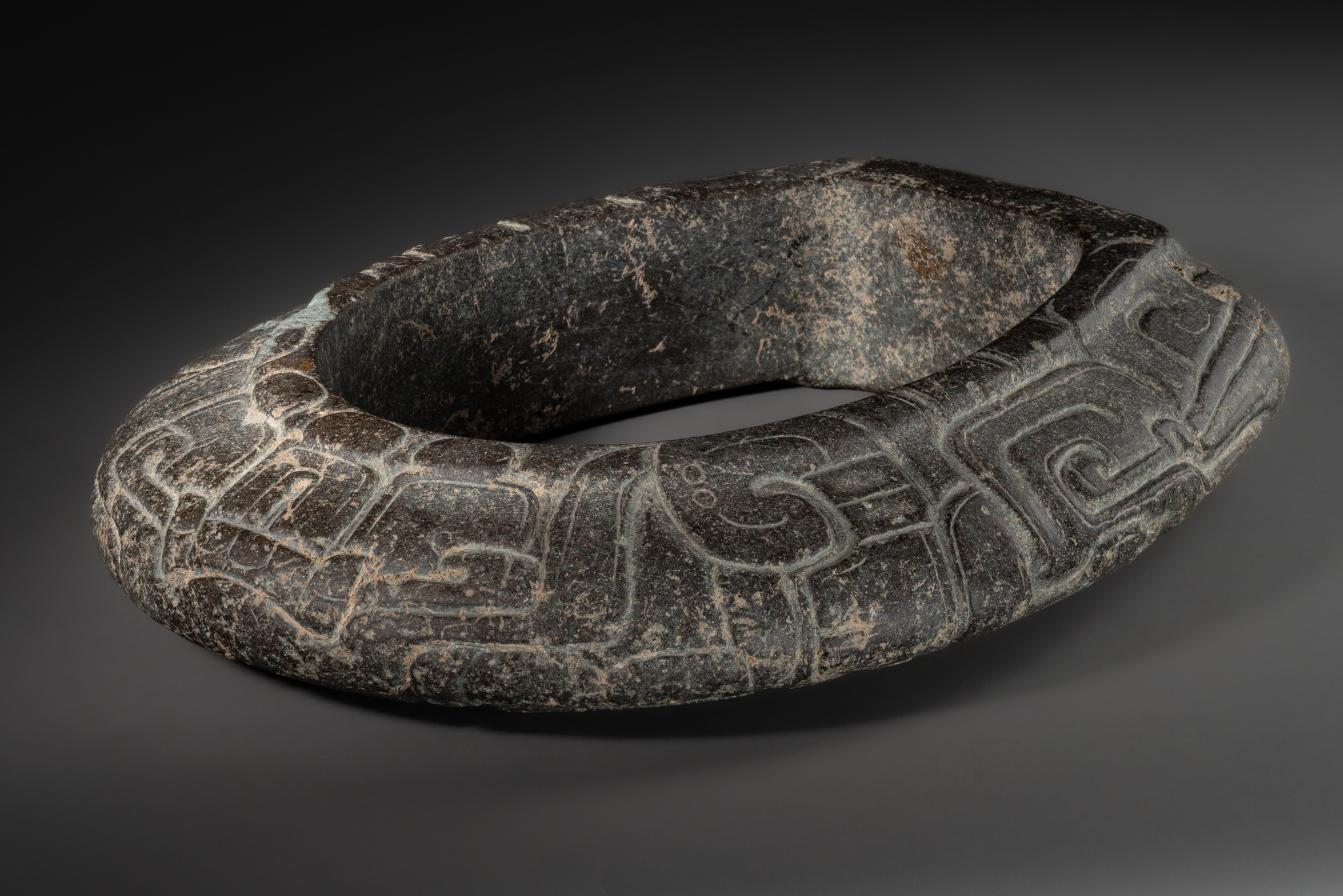 This particular form of a closed “yoke” is an early form of the well-known Classic Veracruz “yugo” or “yoke” sculptures, which mimic the thick, protective belts worn in mesoamerican ballgames.