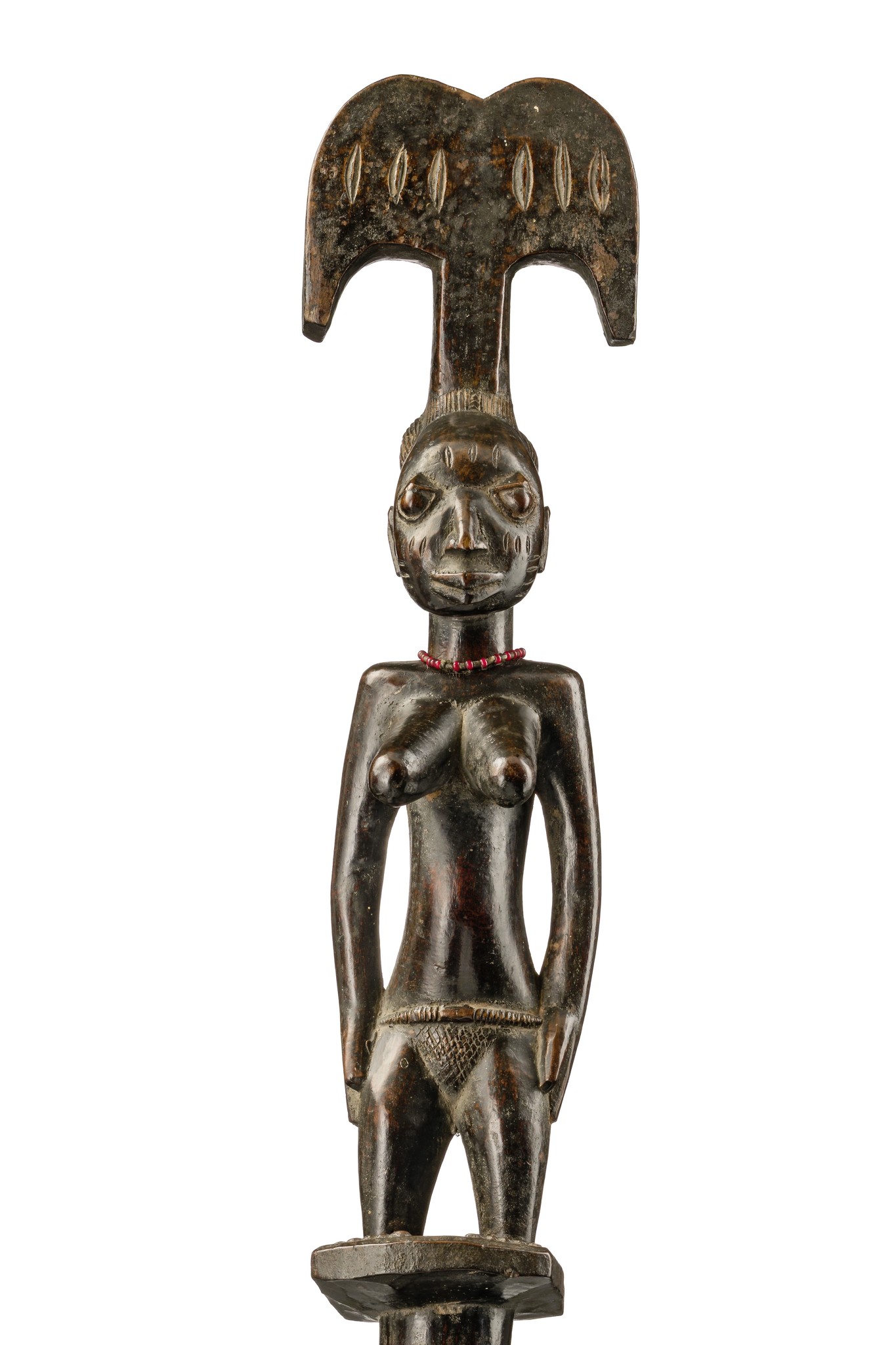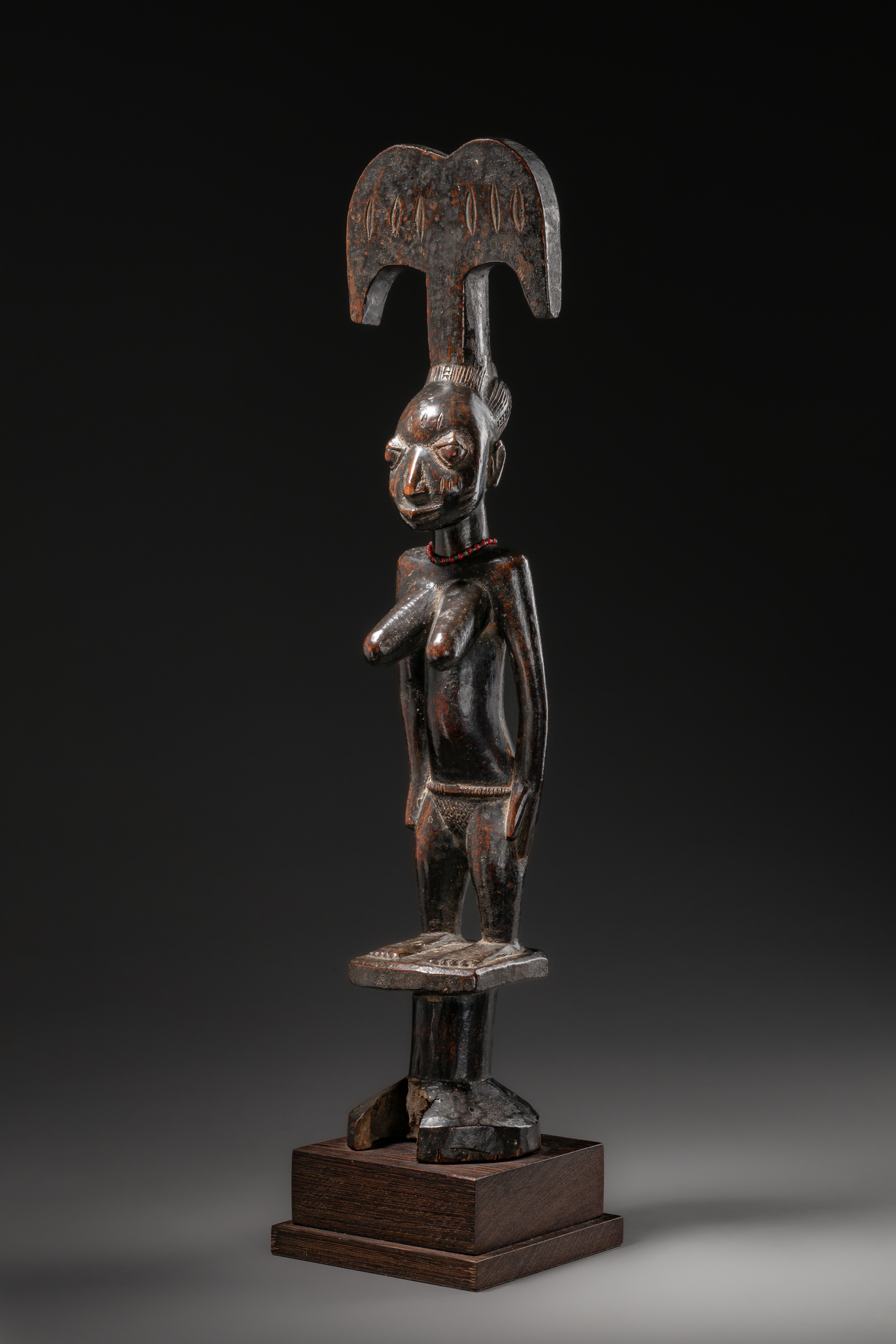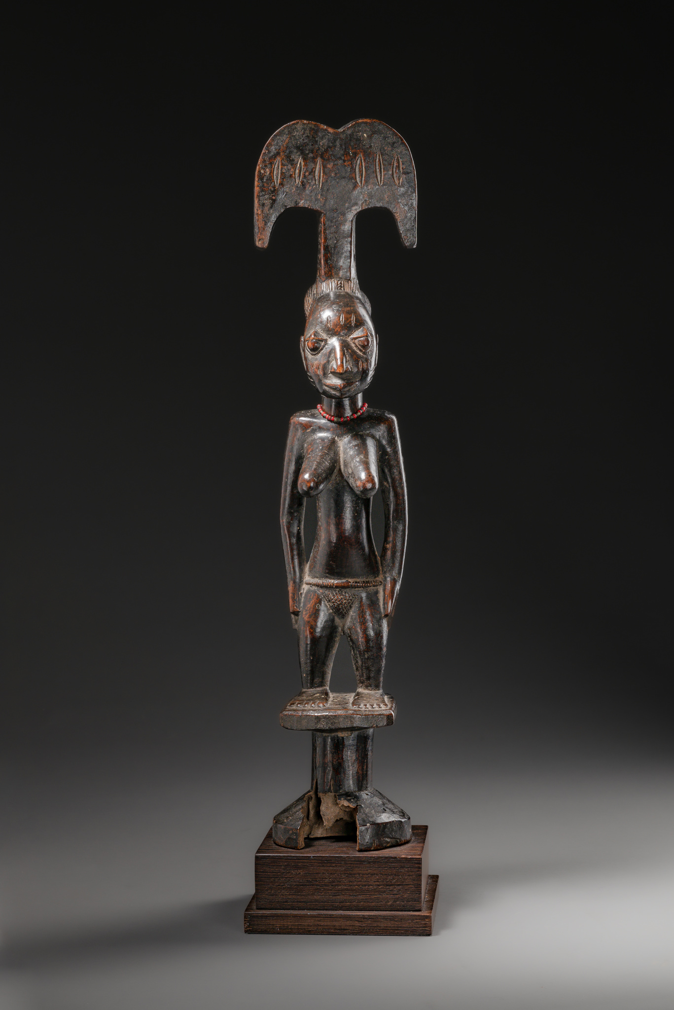 In Yoruba iconography, the female figure is regarded as a bearer of respect and spiritual dignity. She often forms the central anthropomorphic motif of the “oshe” and embodies calm and balance, which counteract the destructive power of the thunder god “shango”. In some interpretations, she is associated with “oya”, the goddess of the wind, who precedes the stormy “shango” and prepares for his appearance.