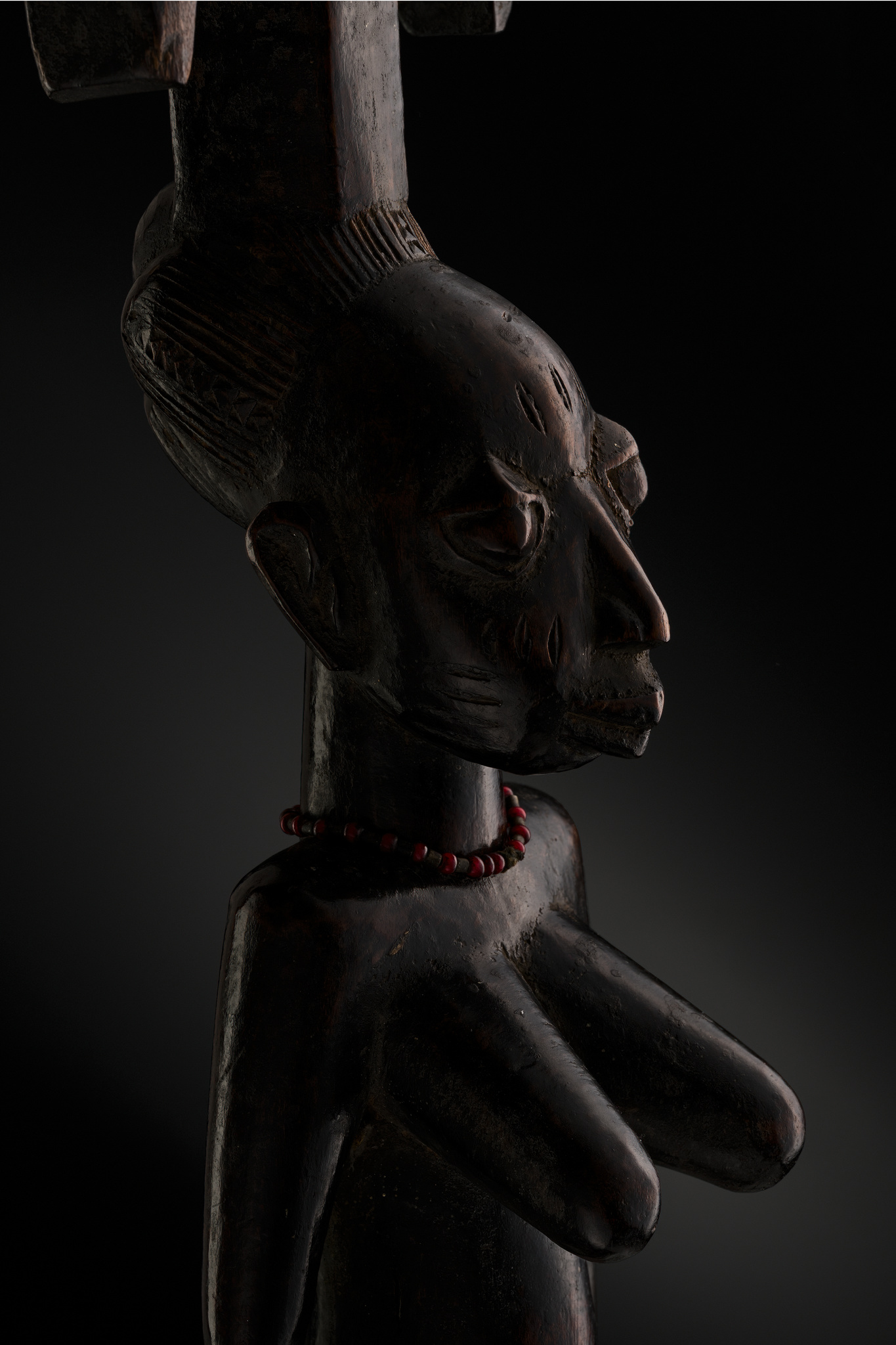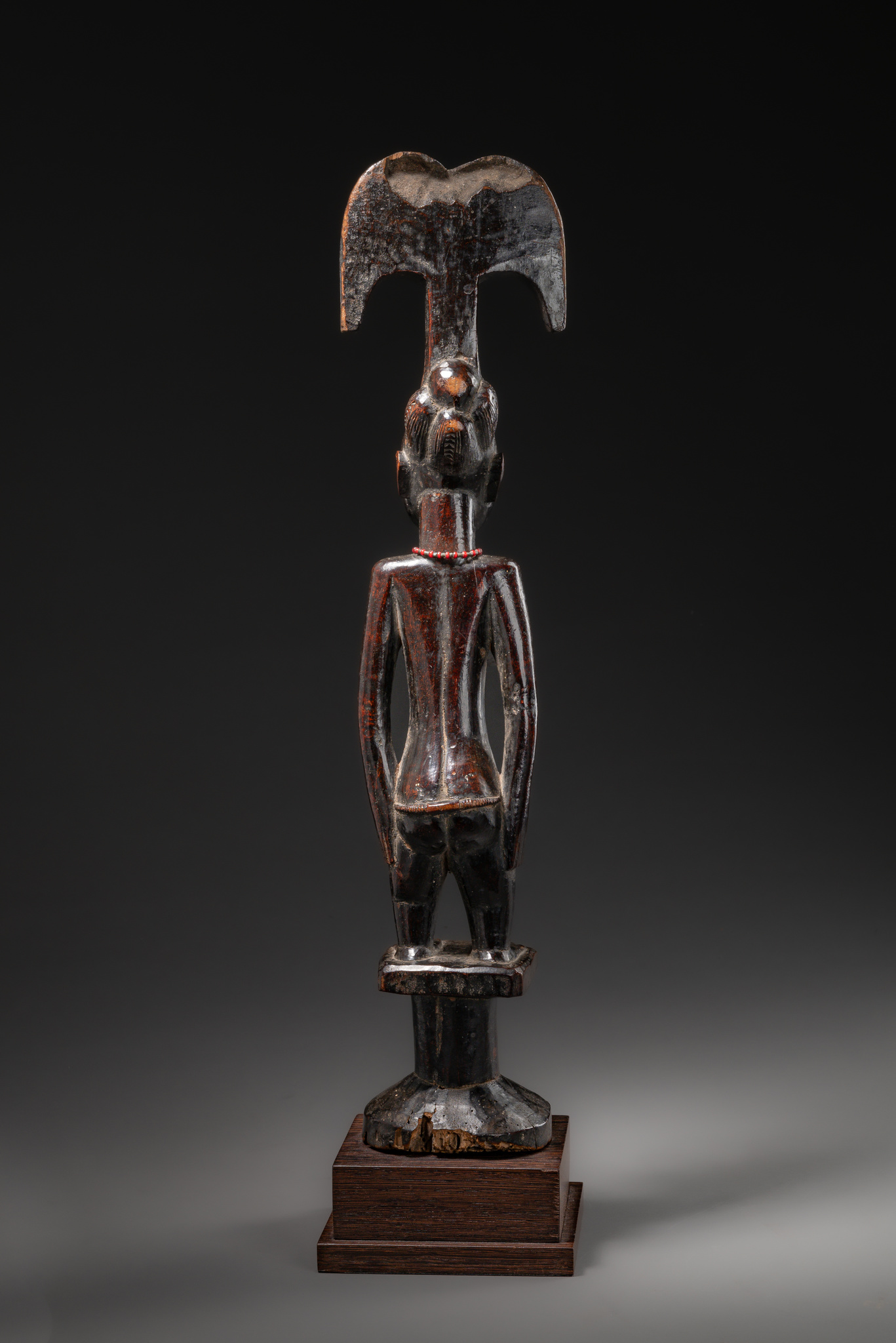The characteristic double axe refers to two connected faces and may correspond to ritual scars, as found on the patrons of such works. Whether this motif goes back to the Neolithic stone axe (“edun ara”) remains open. It is considered a material manifestation of “shango’s” lightning, which releases his “ase”, his concentrated spiritual power, when it strikes the earth.