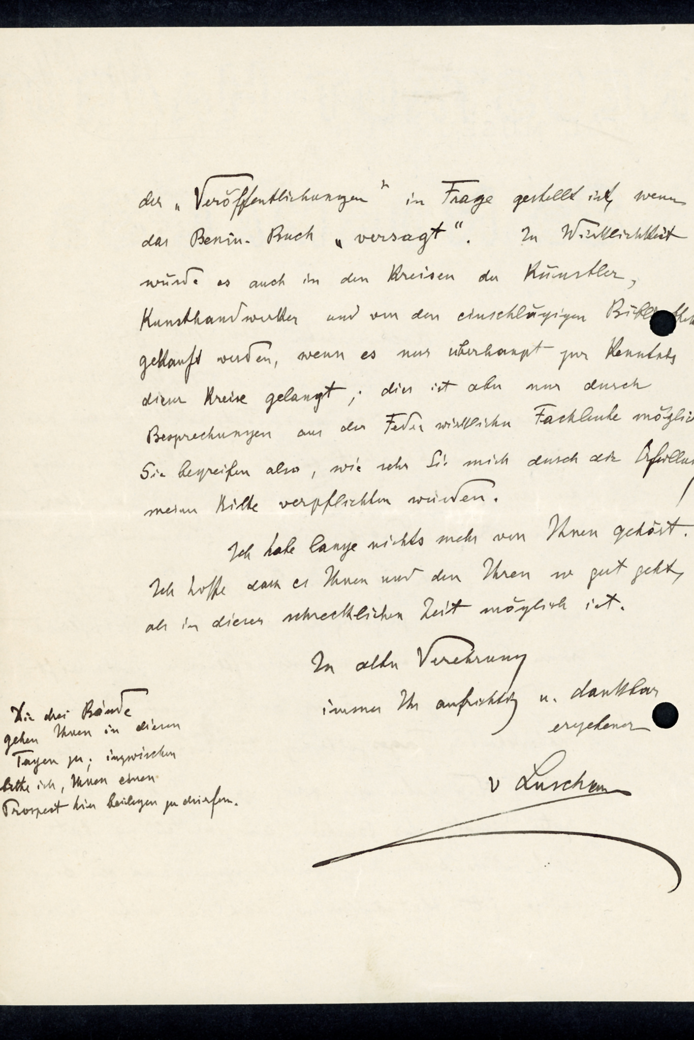 Autograph letter by Felix von Luschan to Hans Meyer, dated 25 November 1919, requesting a review of his monograph “Die Altertümer von Benin”