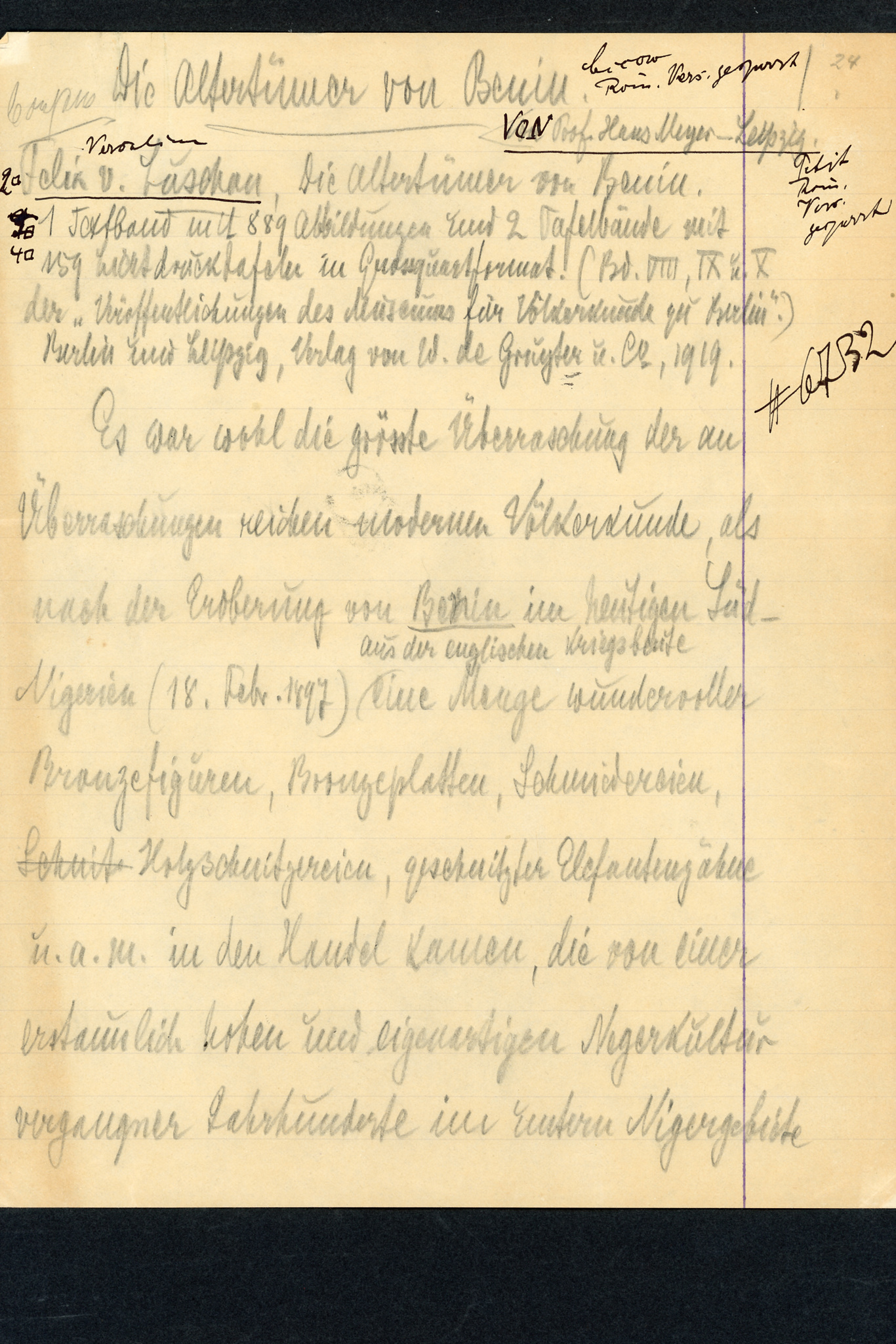 Original autograph manuscript by Hans Meyer: Review of Felix von Luschan’s monograph “Die Altertümer von Benin”, pencil, 38 pages