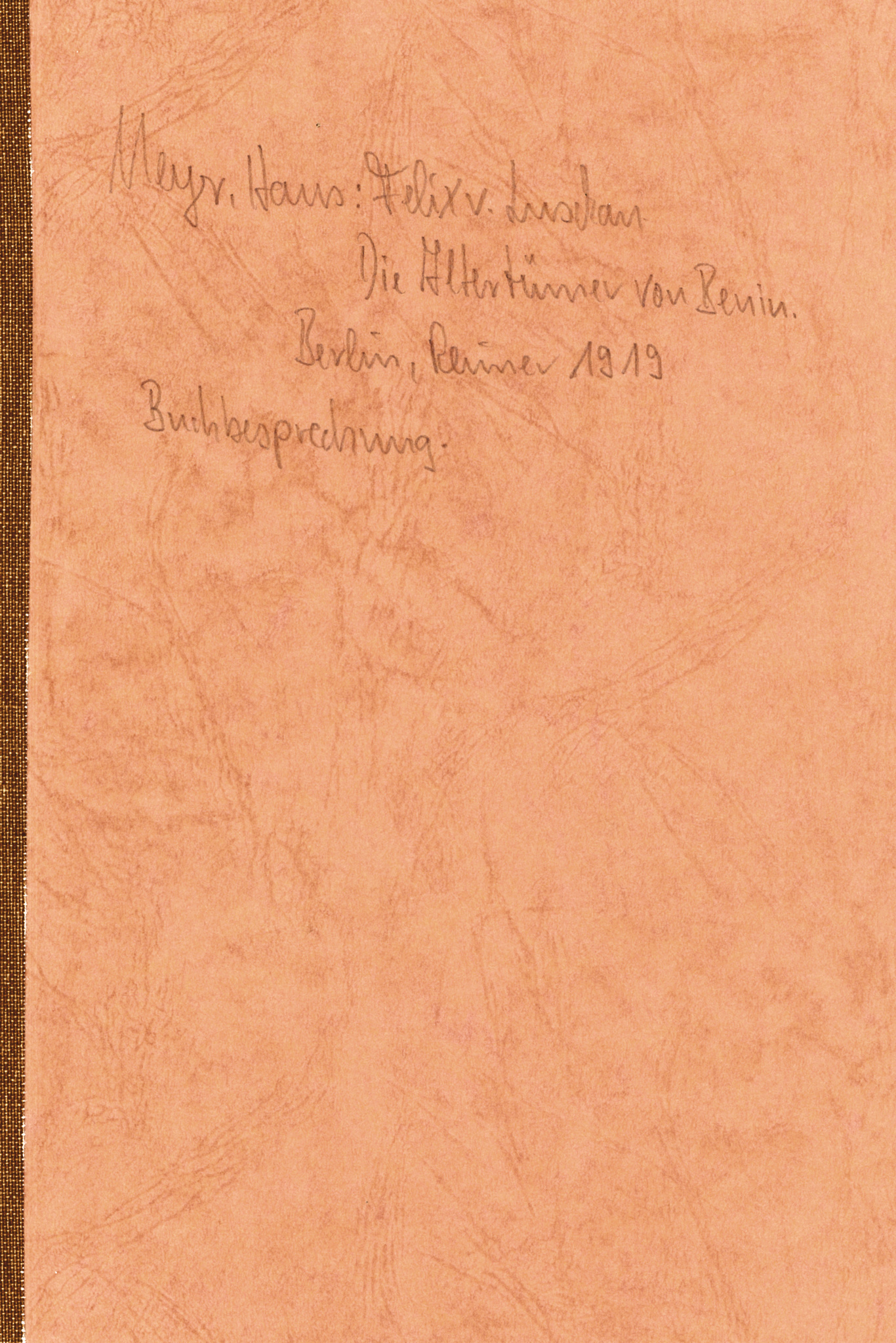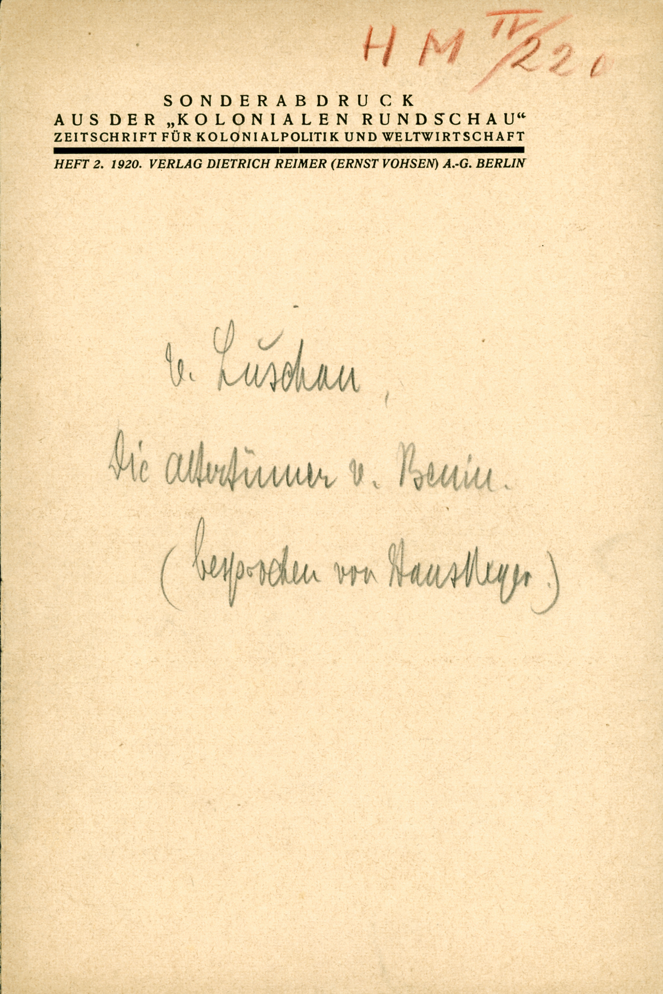 separate offprint of Hans Meyer’s book review in “Koloniale Rundschau”, issue 2, Reimer, Berlin 1919