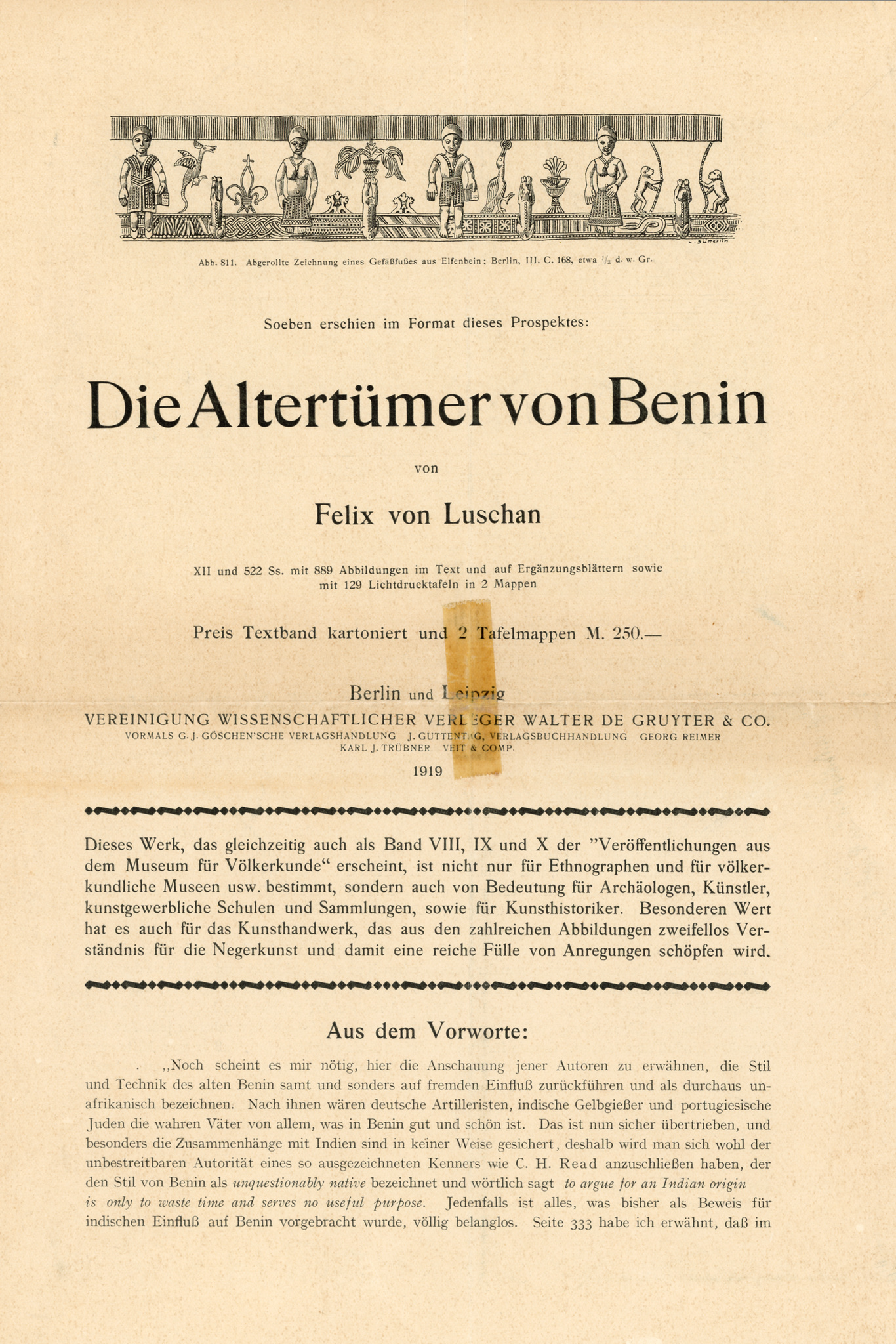 3 vols., a) “Die Altertümer von Benin”, Vol. I, Text volume, with 889 illustrations after drawings by B. Ankermann, G. Kilz, L. Sütterlin, and others, as well as after photographs, etc. published with the support of the Imperial Colonial Ministry, the Rudolf Virchow Foundation, and the Arthur Baessler Foundation, de Gruyter & Co., Berlin and Leipzig, 1919; Vol. II, Plates 1–50, Berlin 1919; Vol. III, Plates 51–129, Berlin 1919