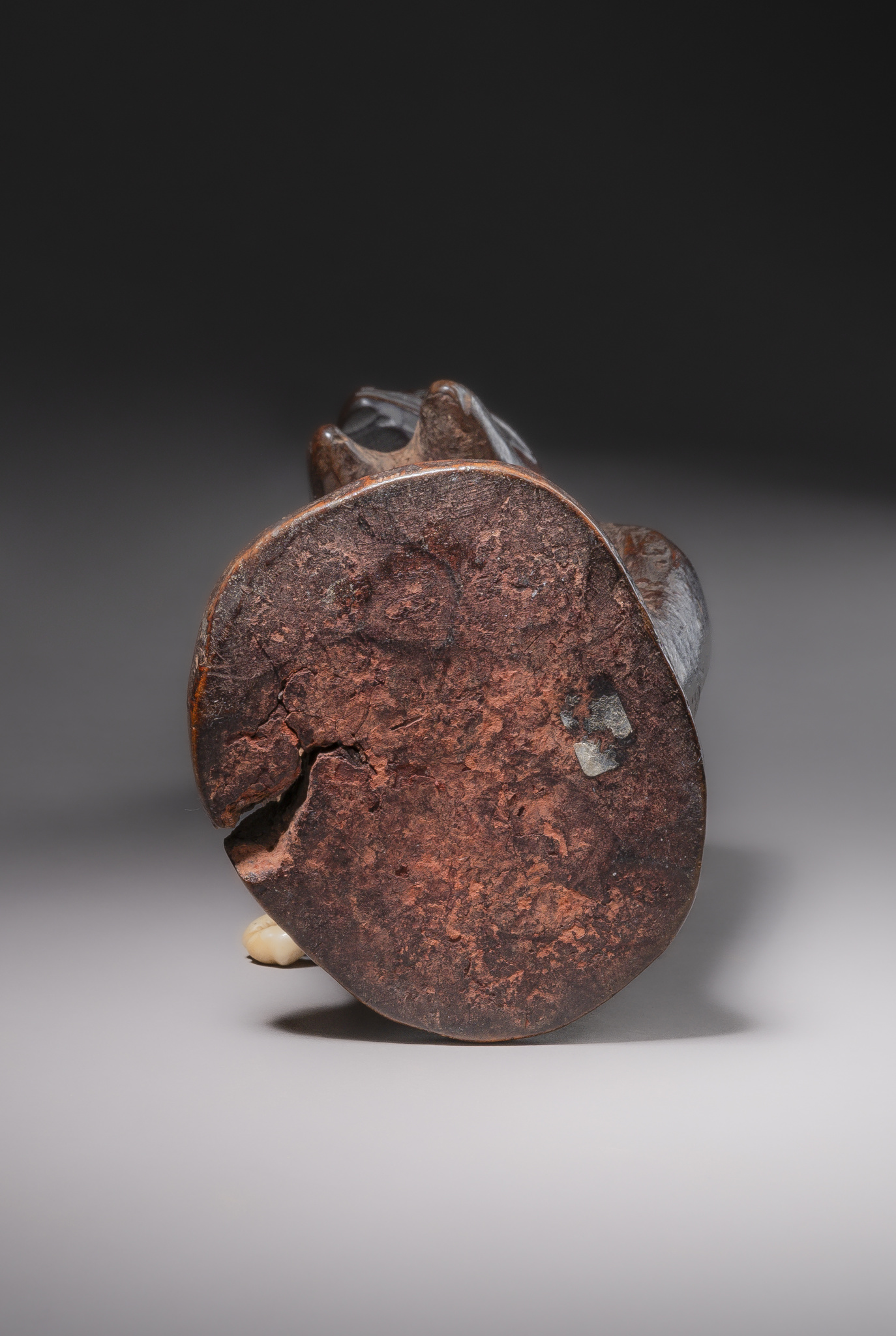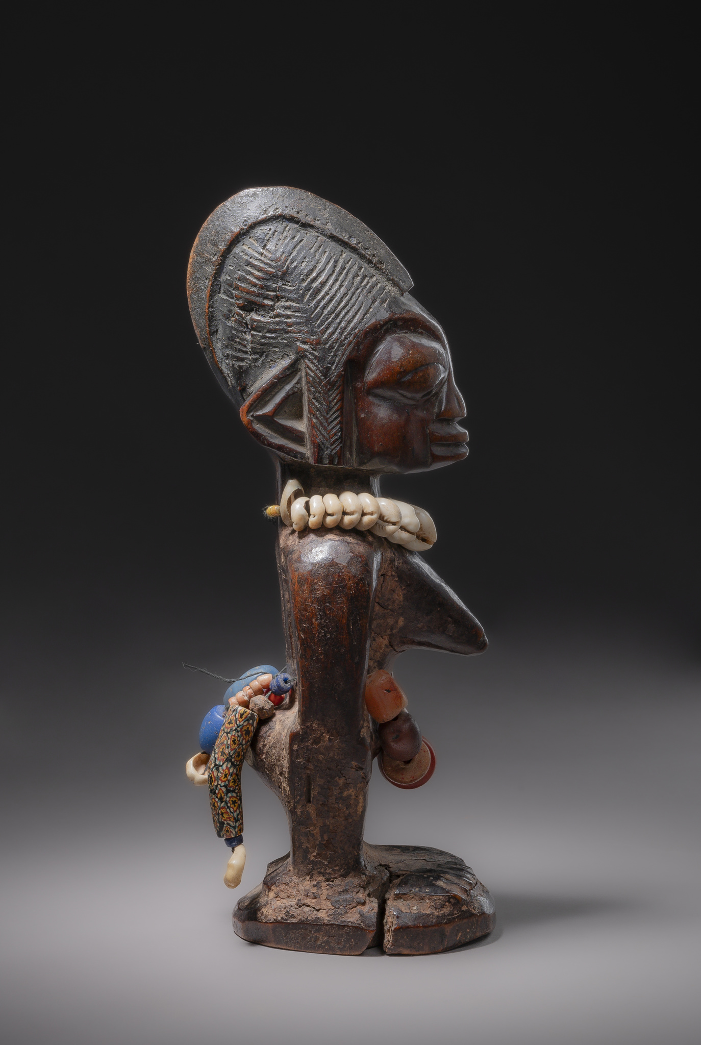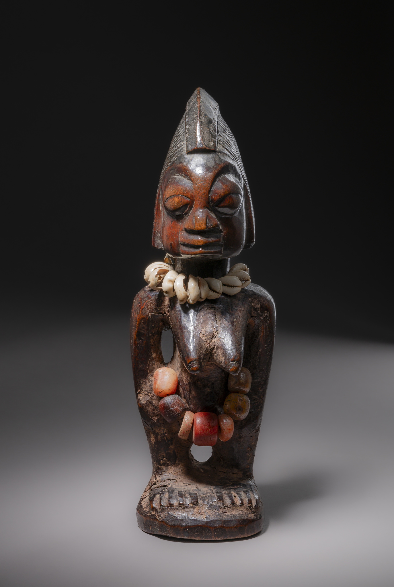 wood, pigments, glass beads, cowrie shells, cracks, insect damage