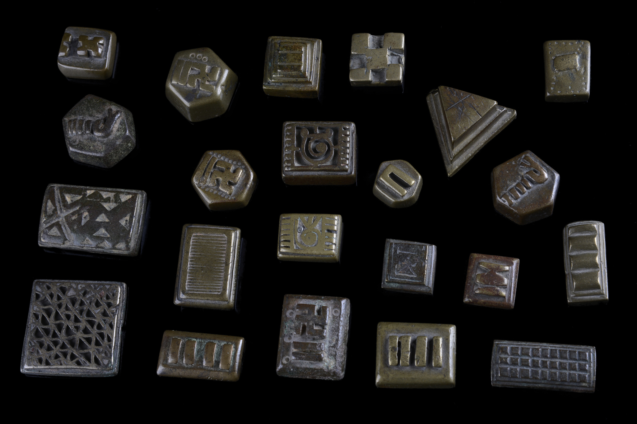 22 pieces, brass, various forms and decor, partly handwritten and/or incised collection numbers on the back side, min. dam., slight traces of corrosion