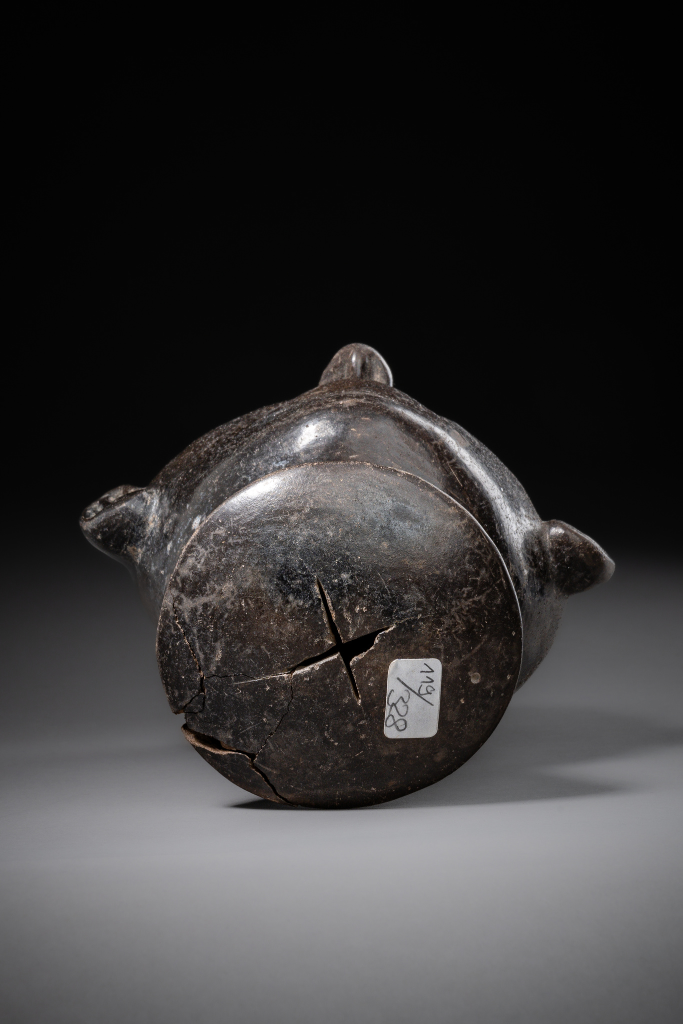 ceramic with dark engobe, the base is crafted as a rattle, drill hole from a thermoluminescence analysis on the underside, rest.