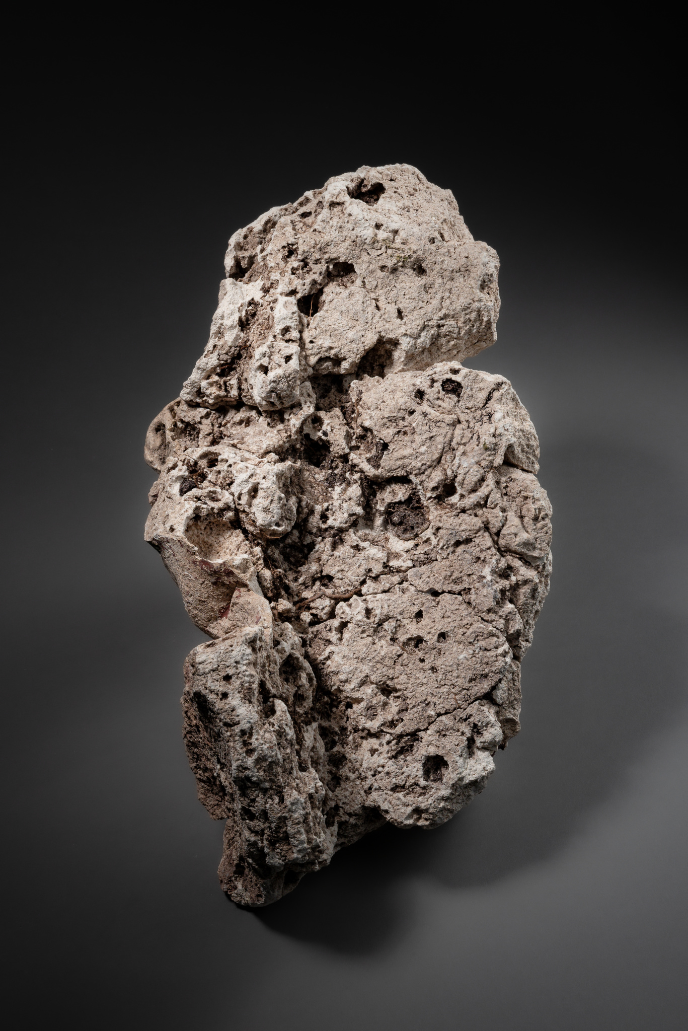 stucco, remnants of earthy red, green, and cream-white pigments, evoking the original polychromy that once enlivened the figure within a temple or palace setting.