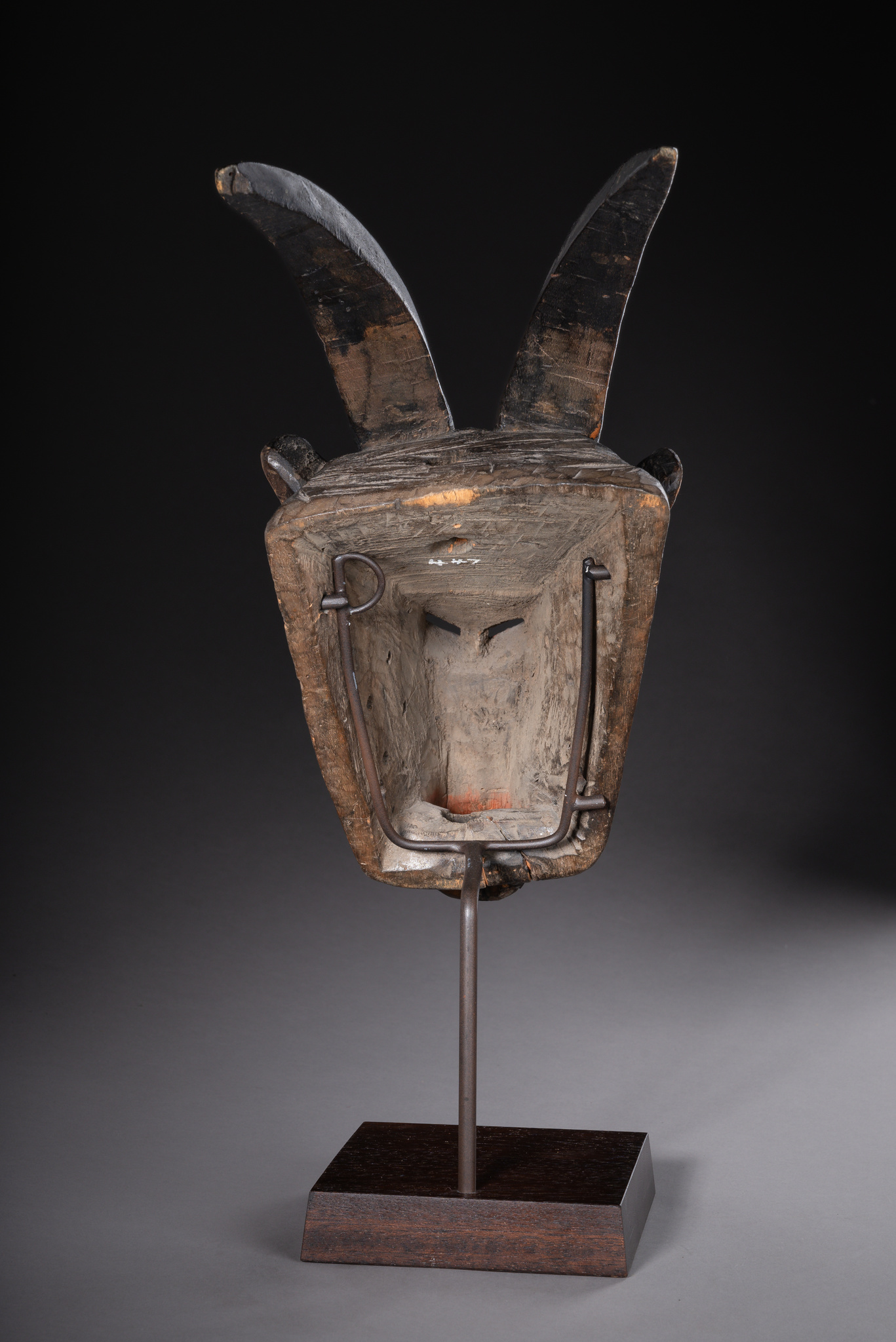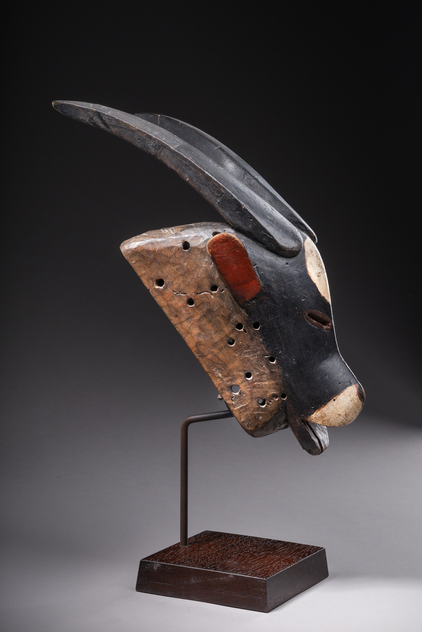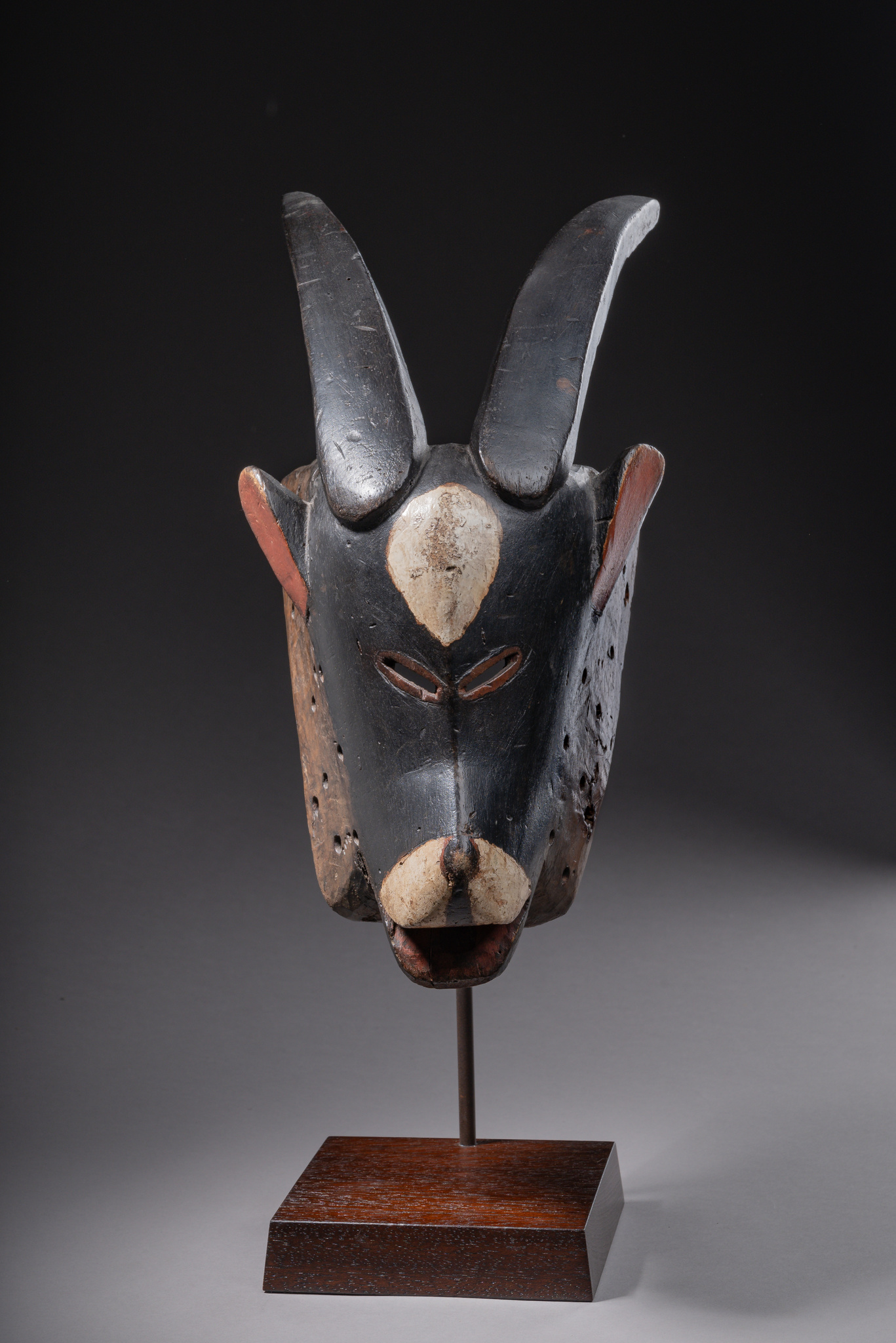 This mask could represent “boli”, the goat, “guä”, the dwarf antelope, or “bui”, the duiker antelope. They have relatively short horns and white spots on their foreheads and snouts.
