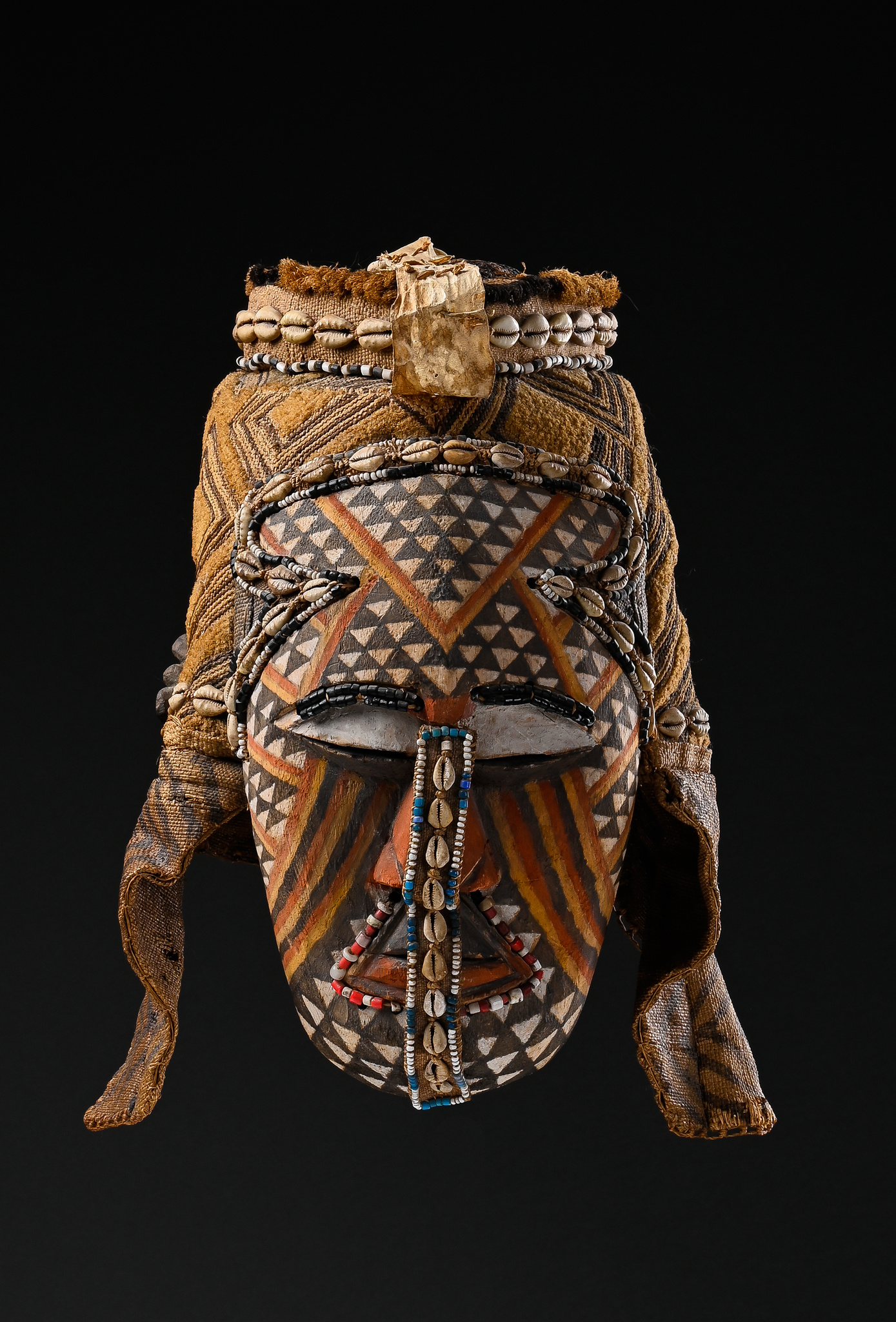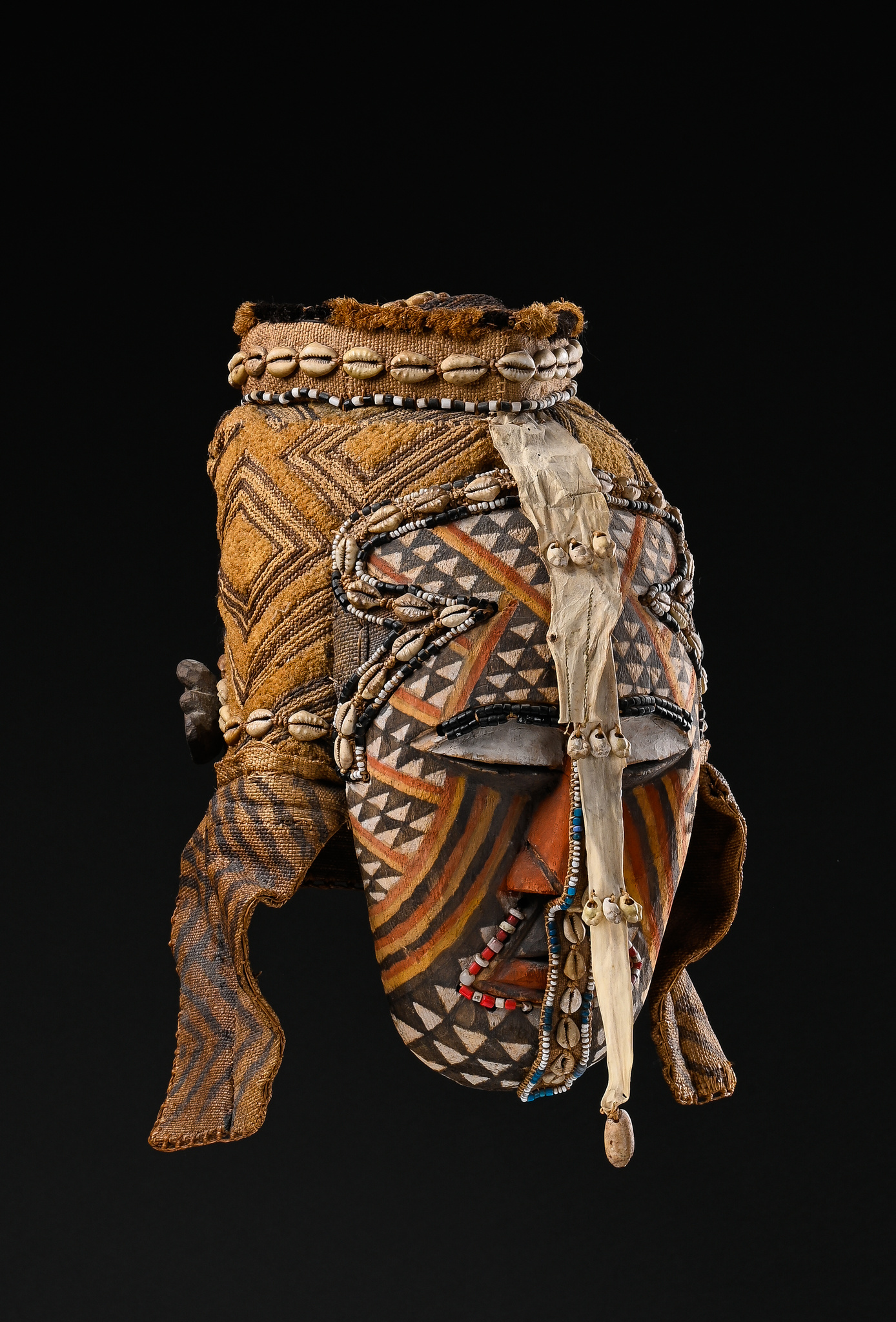 “Ngady mwaash” means the wife or companion of a male mask. The prototype for this mask is the Kete mask “Mukasha ka muadi” (= female mask). Like other masks from southern Cuba, the mask is decorated with a variety of contrasting geometric patterns, including triangles and parallel lines. The parallel lines on the cheeks are described as “tears” - an indication that the mask is primarily used at funeral ceremonies for deceased members of the initiation society.