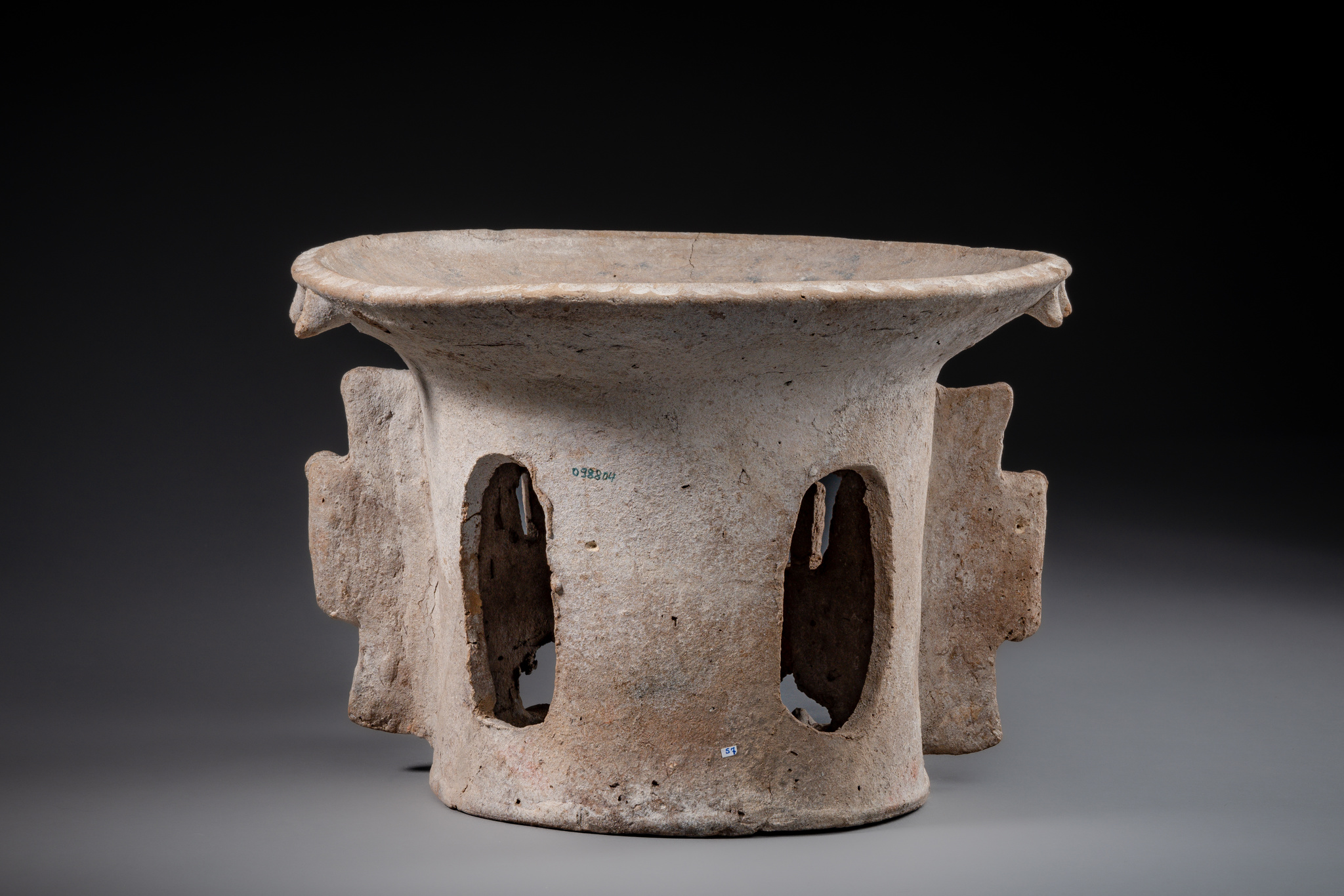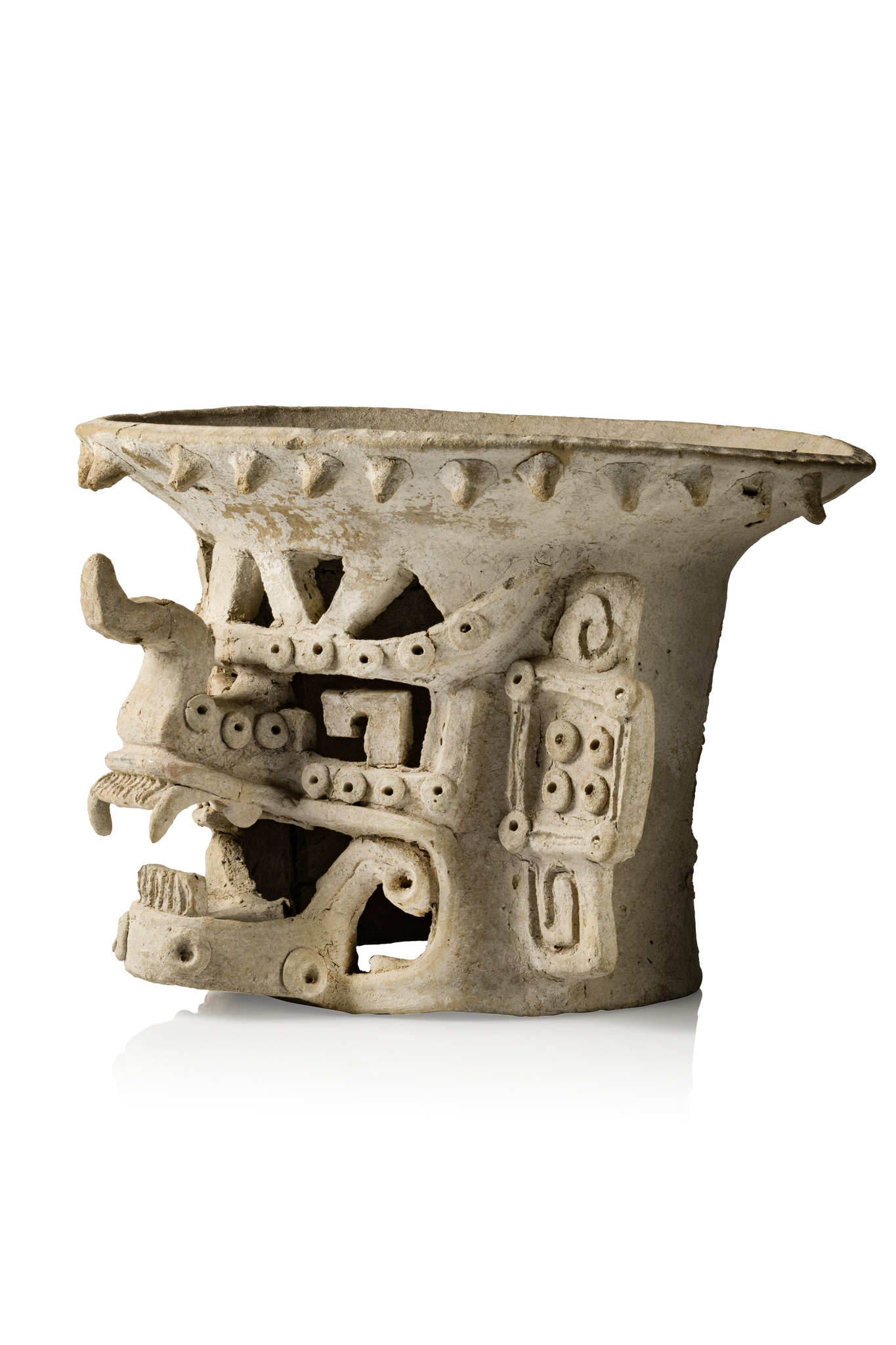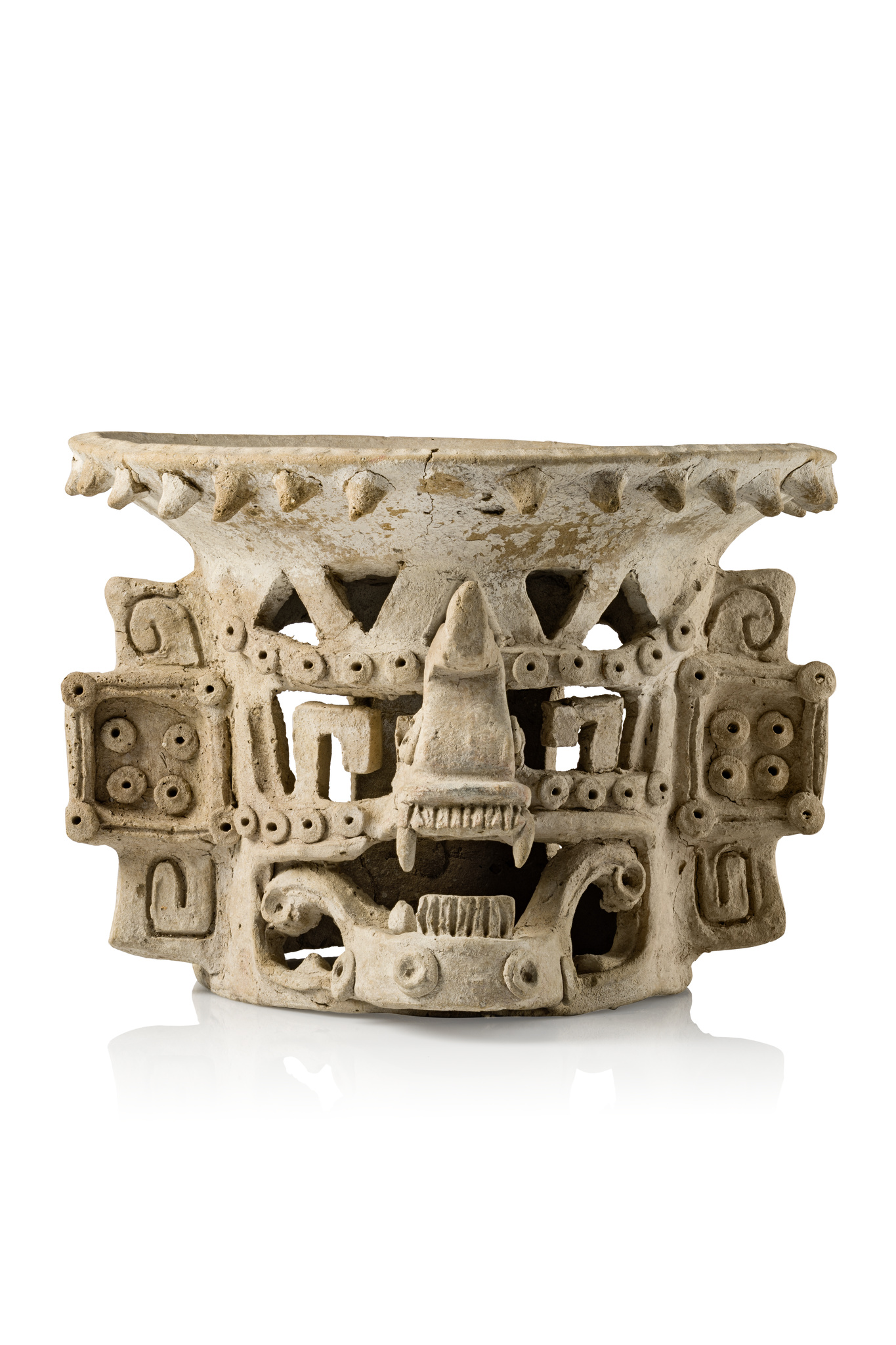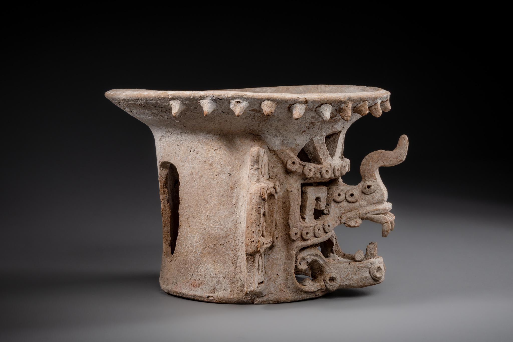 A shallow, recessed bowl with thorn-like projections along the lower rim, set on a cylindrical base with an elaborately pierced front, depicting the highly stylized head of the rain god “Chaac”. He is shown with a trunk-like, upward-curving nose and two downward-curving fangs.