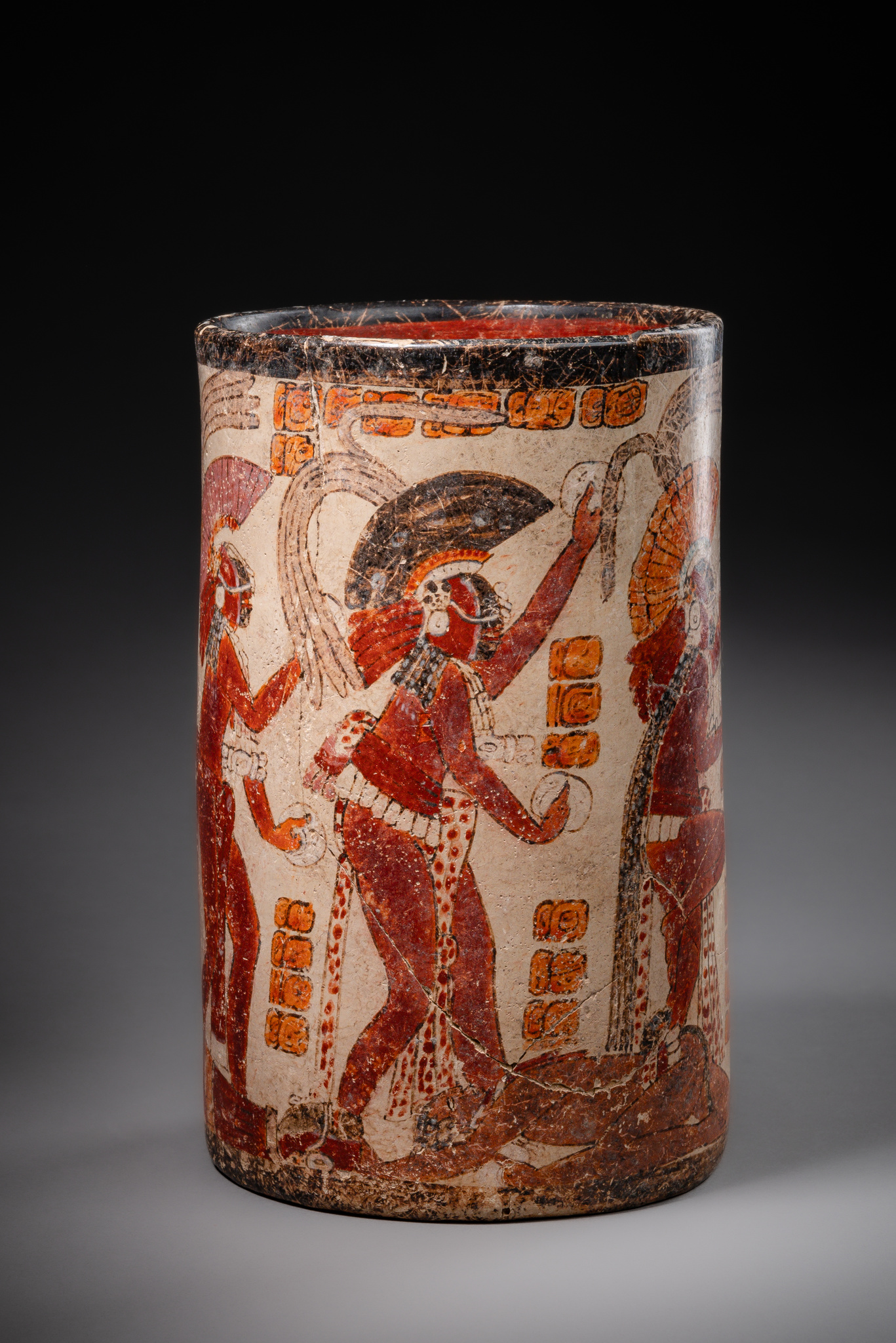 The vessel wall is encircled by six male figures. Three of them wear black facial masks and comb-like feathered headdresses. A fourth figure lies at their feet, having lost both mask and headdress. The two remaining figures are distinguished by particularly elaborate headdresses and by jaguar heads carried on their backs as trophies. All figures hold ring-shaped objects (made of shell or stone) in their hands.