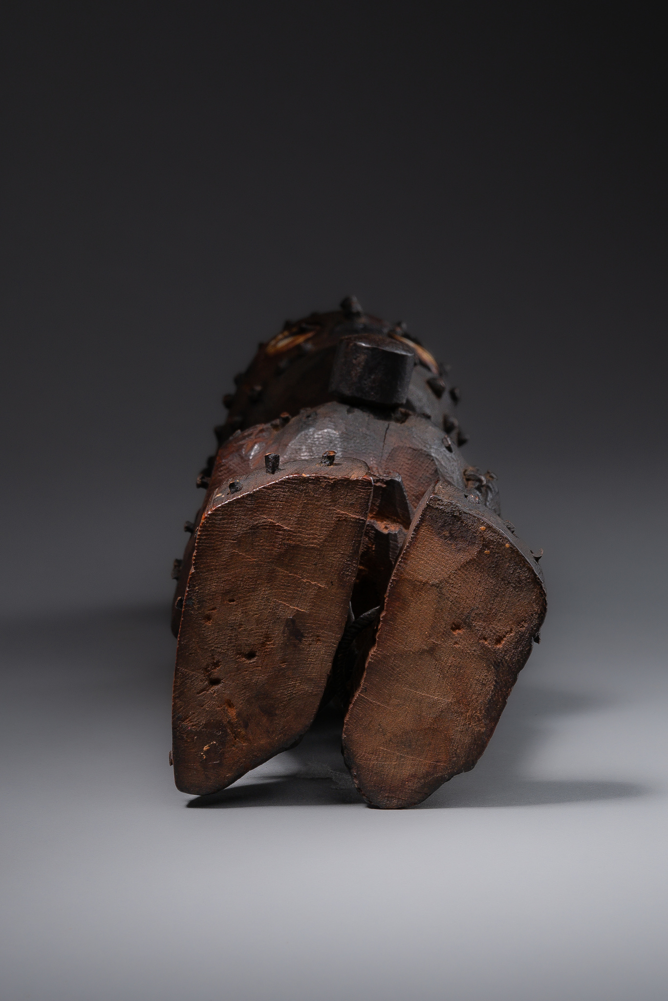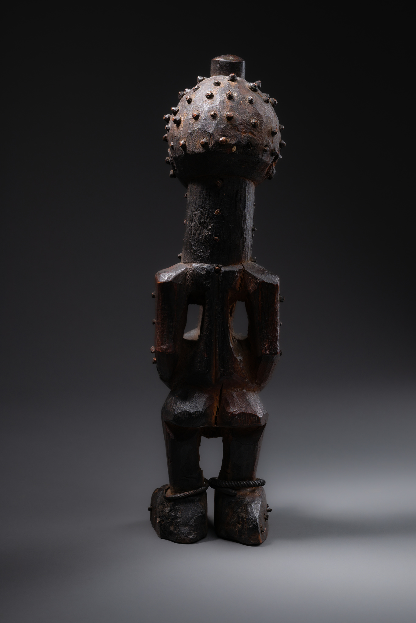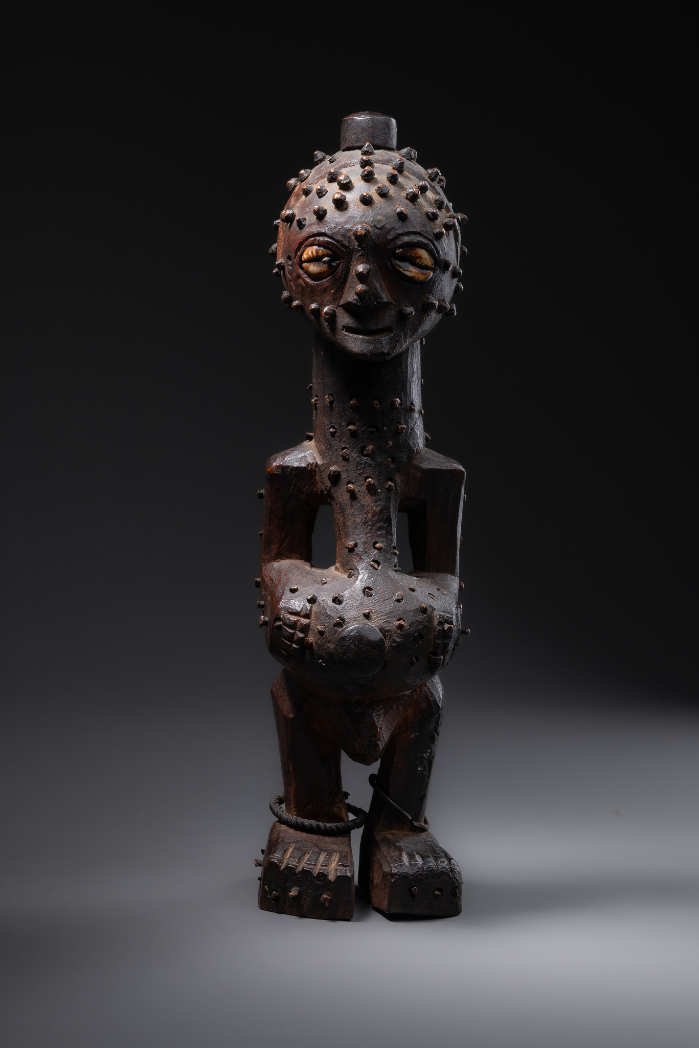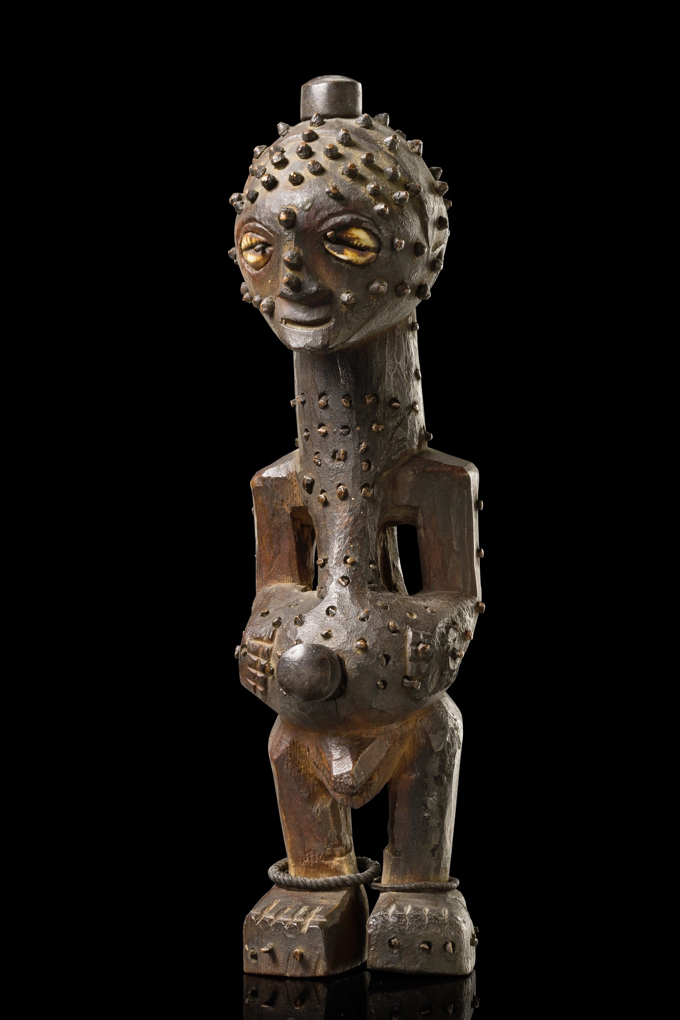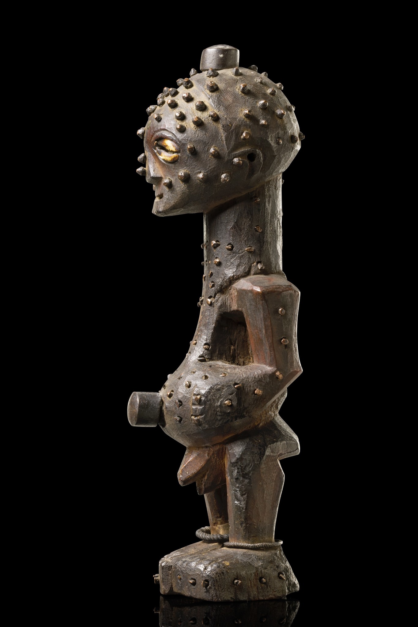 The metal pegs present figure is stud with, were said to have been intended as protection from smallpox, which occured epidemically between 1920 and 1930 and which was attributed to witchcraft. The magical ingredients filled into the metal sleeves and drilled ear holes were thought to enhance the effectiveness of the “nkishi”.