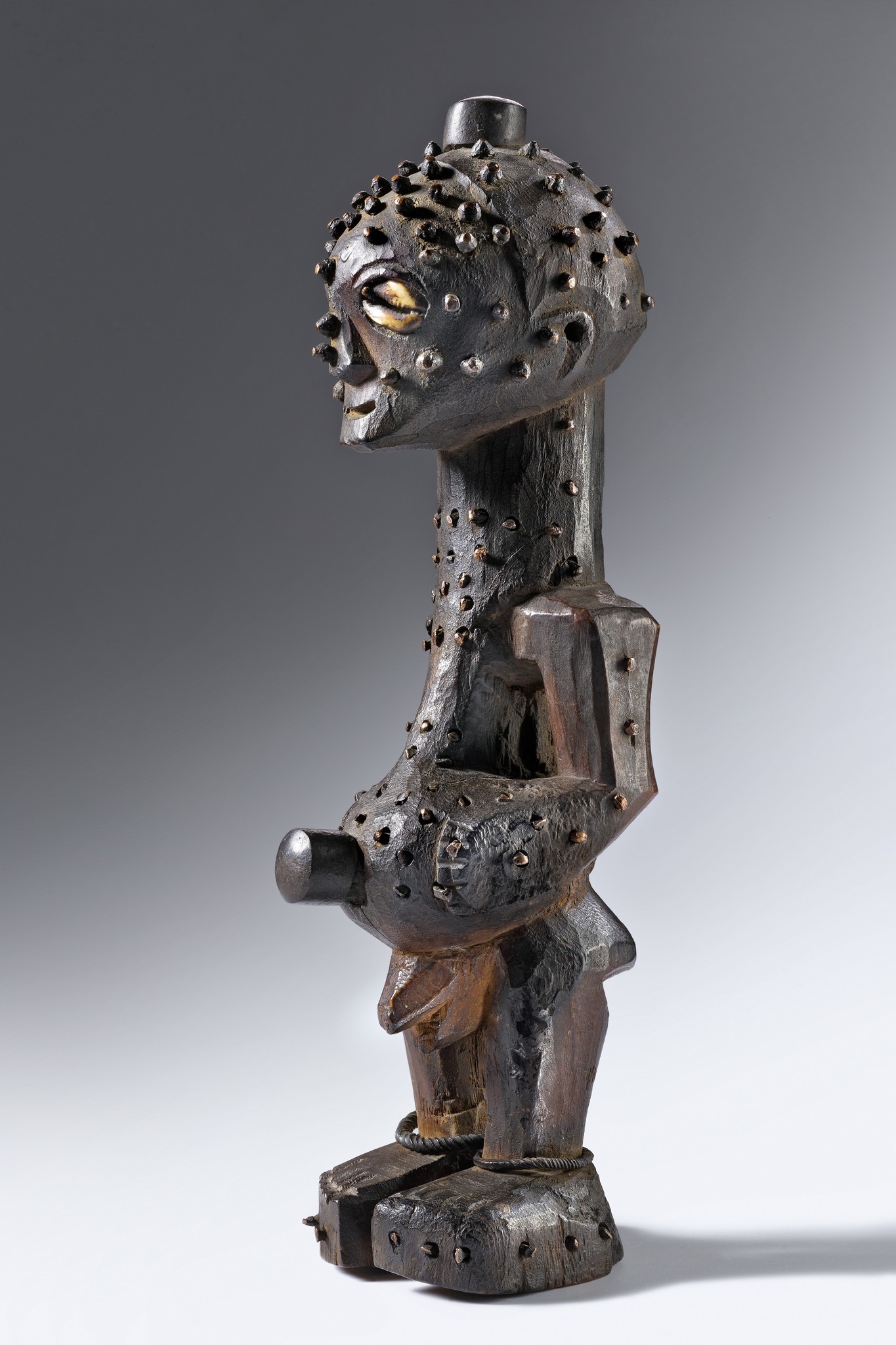 Smaller “nkishi” like the present one are made for the private use of an individual, customized to his or her personal needs by the “nganga”. These privately commissioned works were kept in their owner’s home. In order to motivate the ancestors to provide assistance in a personal crisis, suppliants offer prayers and sacrifices to them.