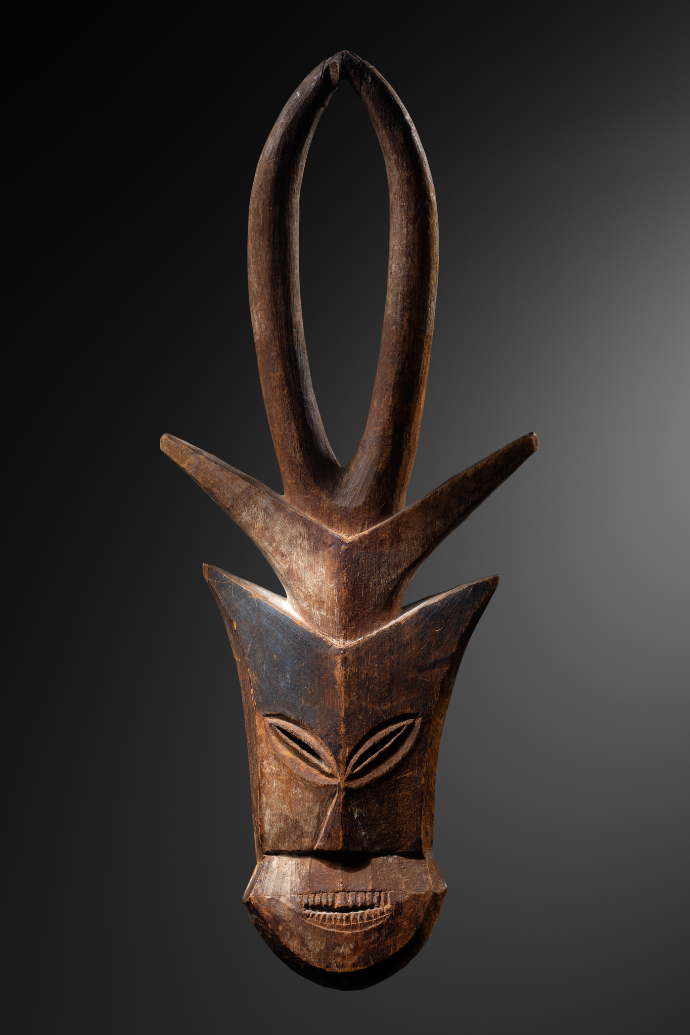 The present piece represents an especially finely crafted variant of an antelope mask. What makes it truly unique is its combination of both an antelope depiction and a human face. No other example of this composite form has been found. Compared with other Kwele antelope masks, the antelope representation in this example is even more stylized. The commonly accentuated snout tip is complemented here by a tooth-filled mouth, above which a human nose has been incorporated.