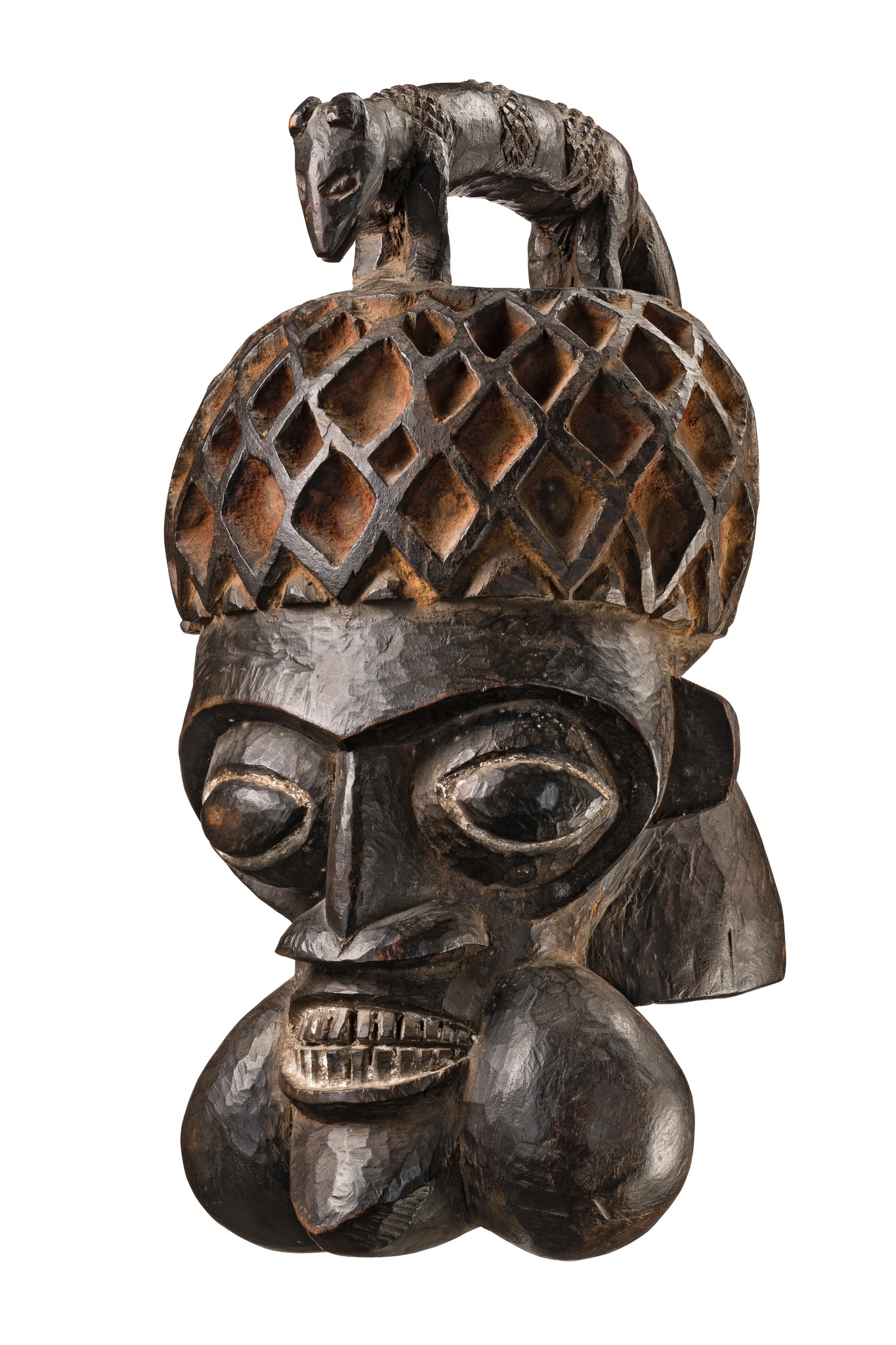 Impressive mask due to its imposing size and expressive facial features. The almost spherical, puffed cheeks are particularly striking. Above a balloon-like hairstyle with a deep diamond pattern, the mask is crowned by a quadruped.
