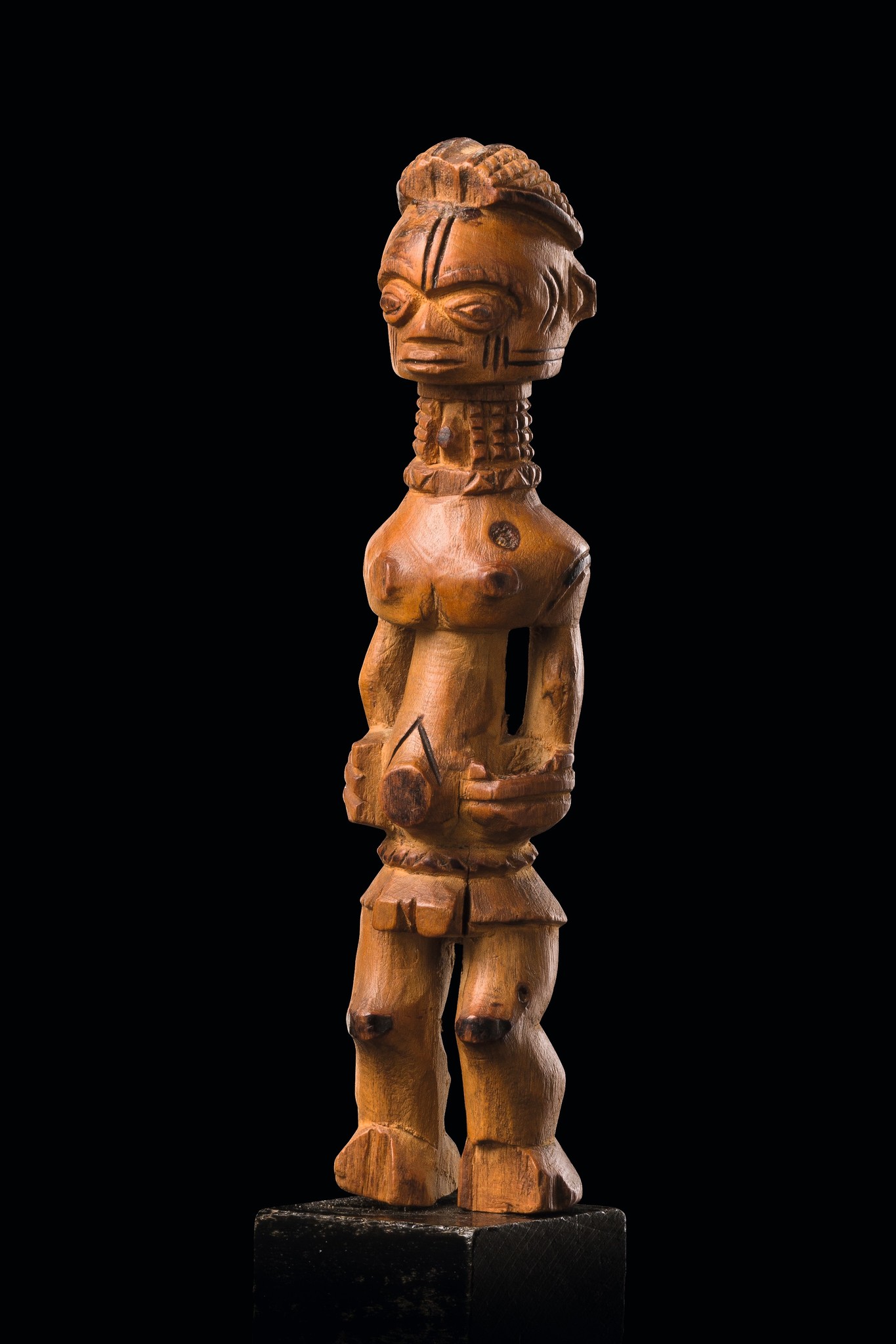 carved from the sacred “muabi” tree, which invites ancestral spirits to inhabit, and empower sculpture. “Mbulenga” figures belonged to young women having difficulty with getting pregnant. The woman carried the small figure attached to her waist throughout daily chores. Regular offerings of oils, red earth, and kaolin were rubbed into the surface creating a thick glossy patina.