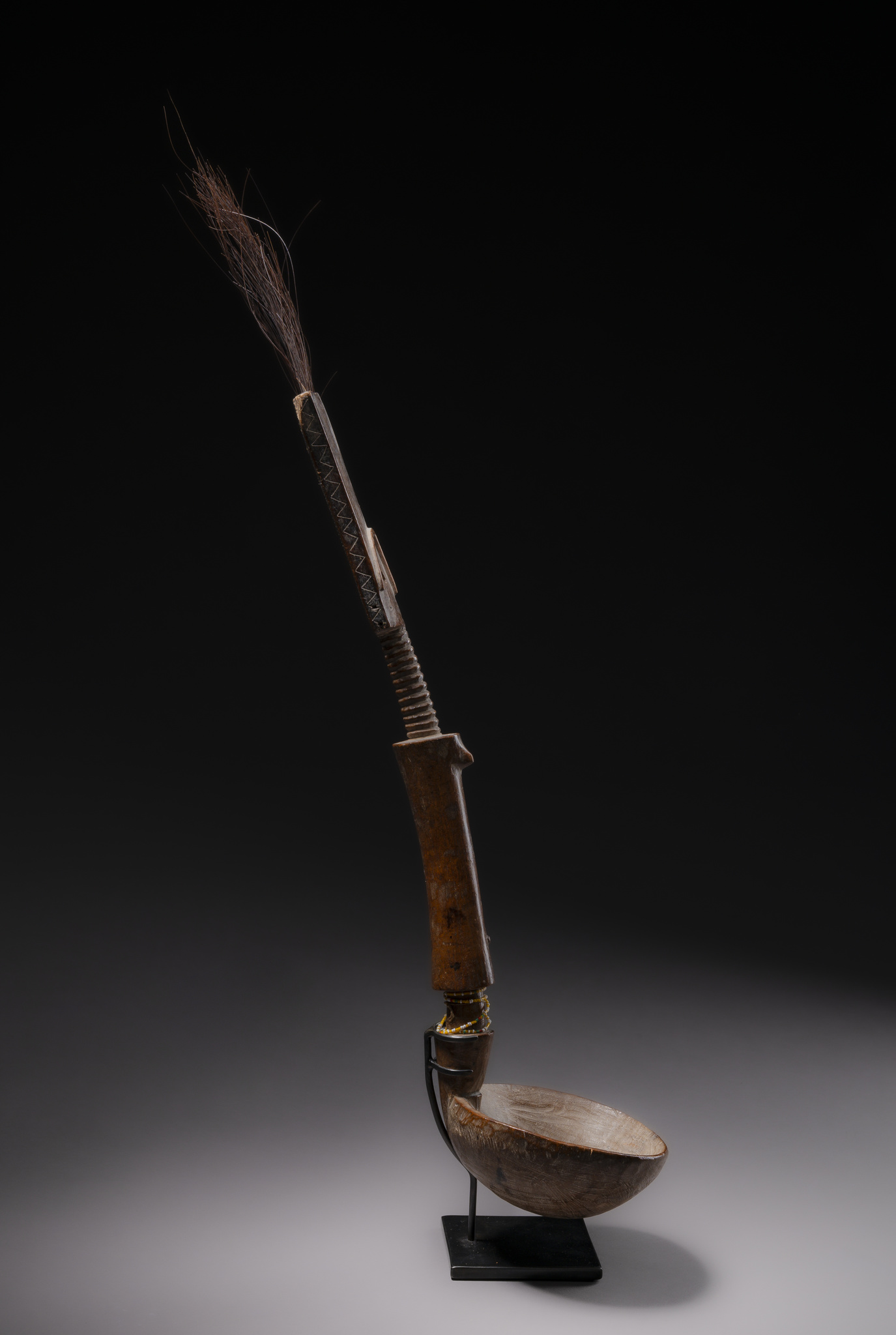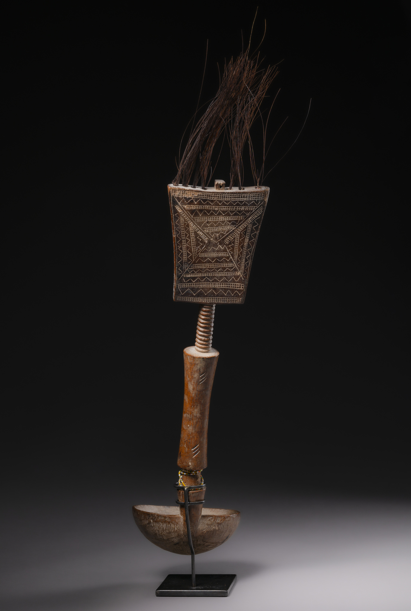 wood, pigments, miniature glass beads, animal hair, handle in form a fertility doll “akua ba”, base