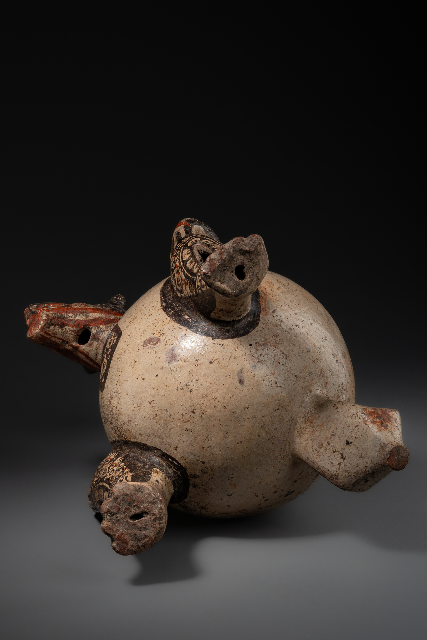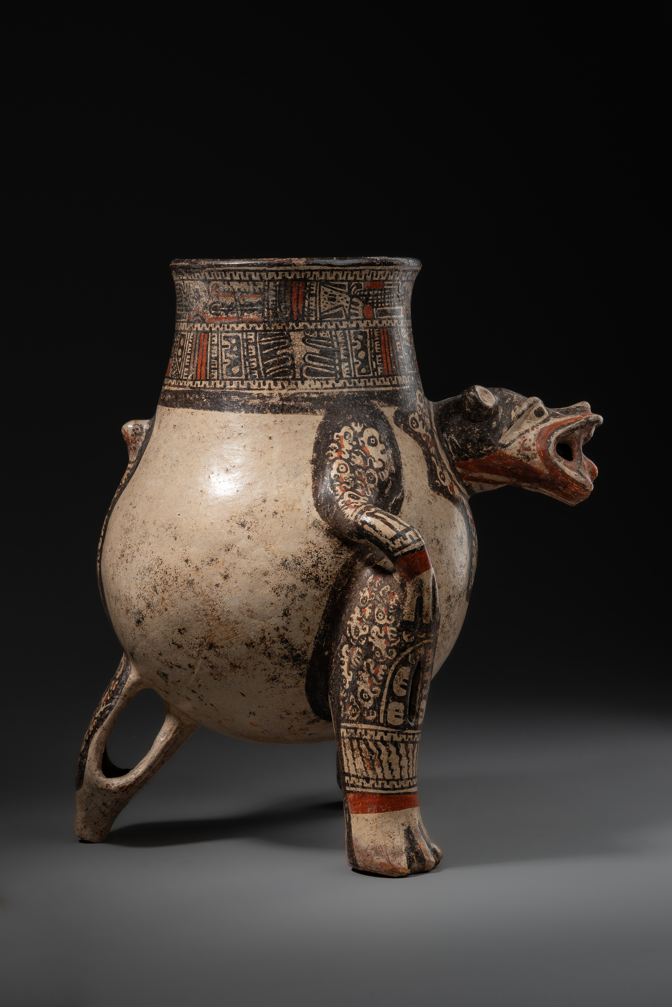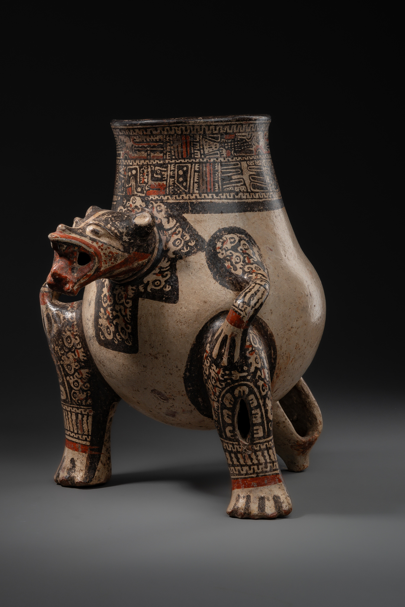 The legs of these vessels were usually hollow and filled with clay pellets that rattled when shaken. Characteristic are the intricate patterns in black slip with reddish-orange accents, decorating the chest as well as the arms and legs of the jaguar. As a nocturnal hunter, the jaguar was regarded as a sun-devouring deity.