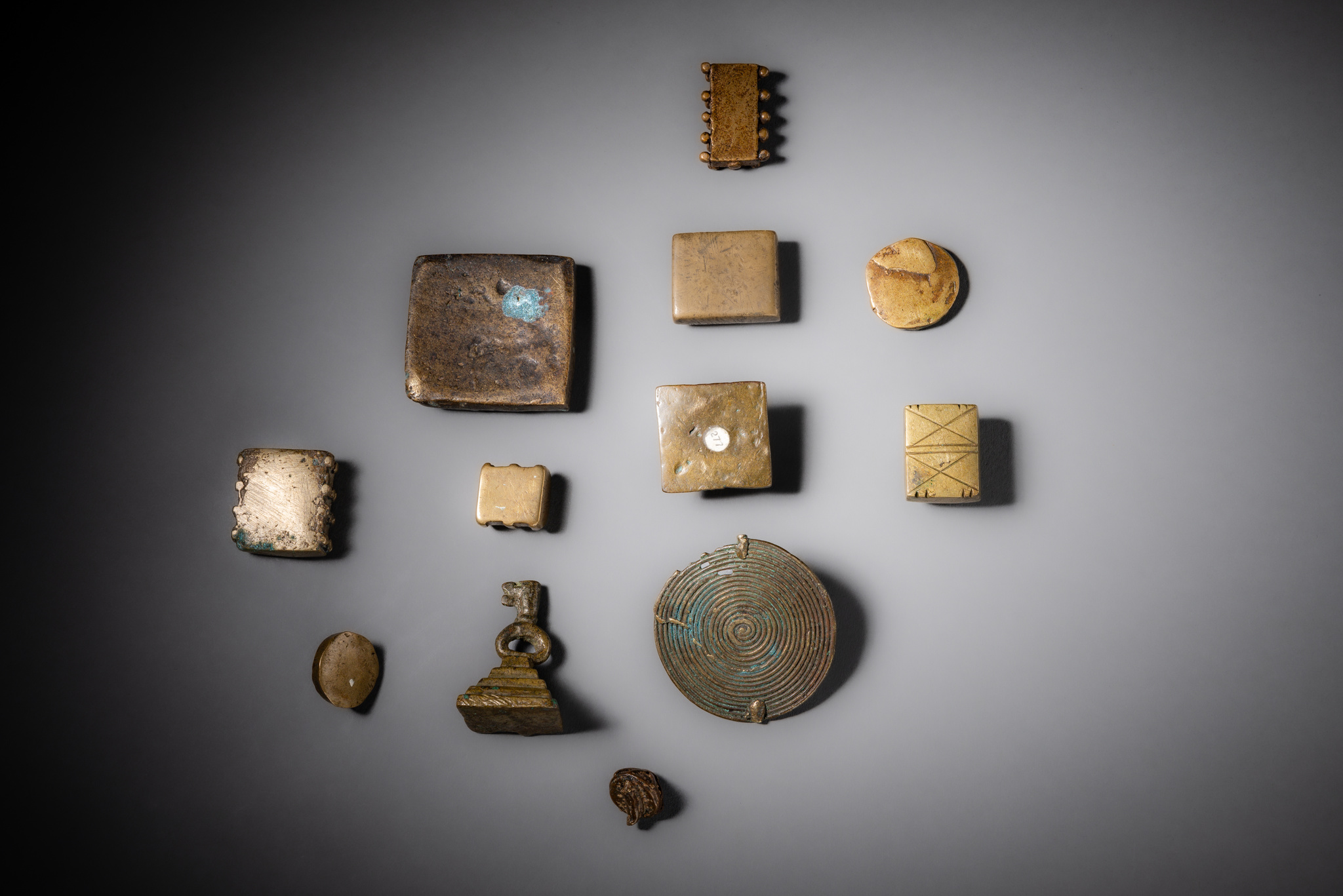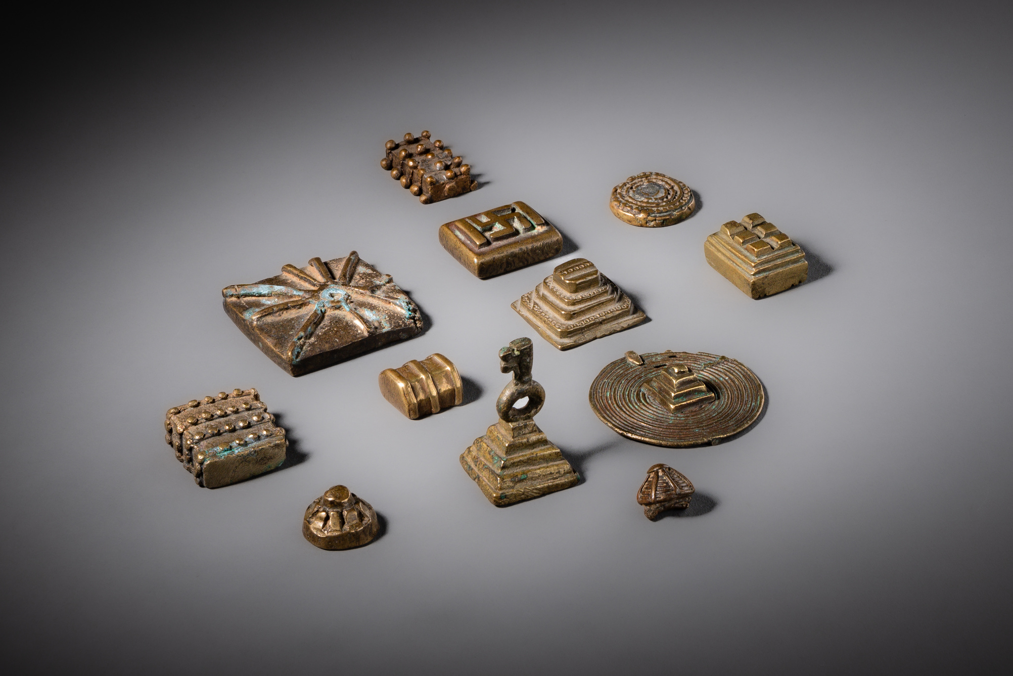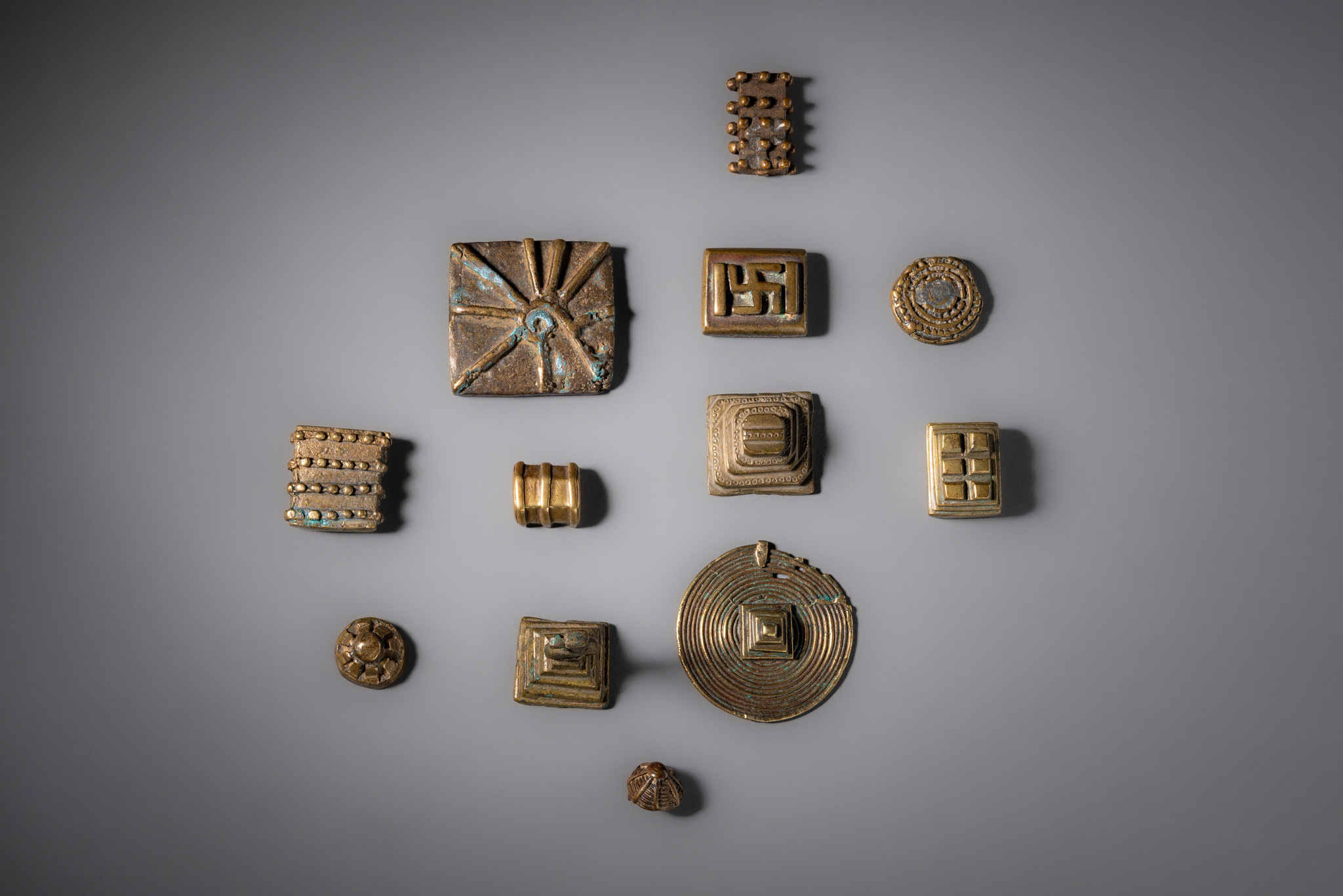 Twelve geometric and pyramidal gold weights · Ghana, Akan · ID: 3052849