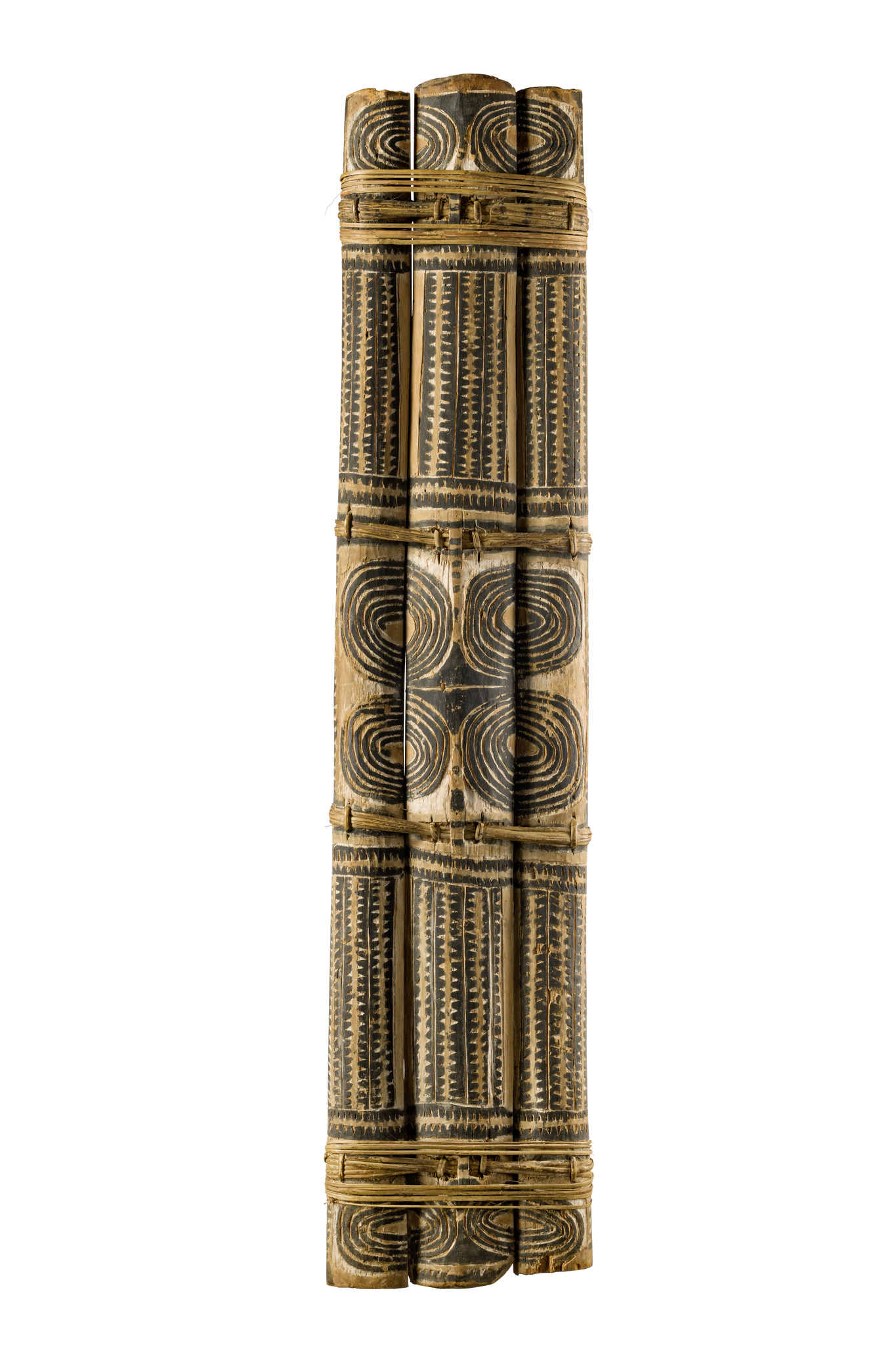 Typical shield composed of three adjoining wooden planks, carved in relief on the front and painted on the reverse, joined together with rattan strips. The incised decoration features four pairs of concentric circles, separated by two compartments filled with vertical zigzag motifs.