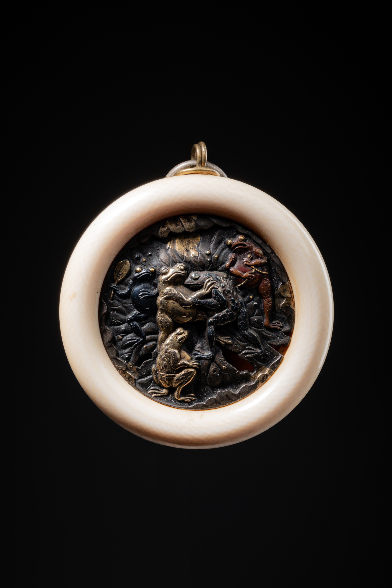 This piece is a “kagamibuta” netsuke consisting of a round ivory bowl fitted with a finely decorated metal lid, a material combination characteristic of this technically sophisticated netsuke type.